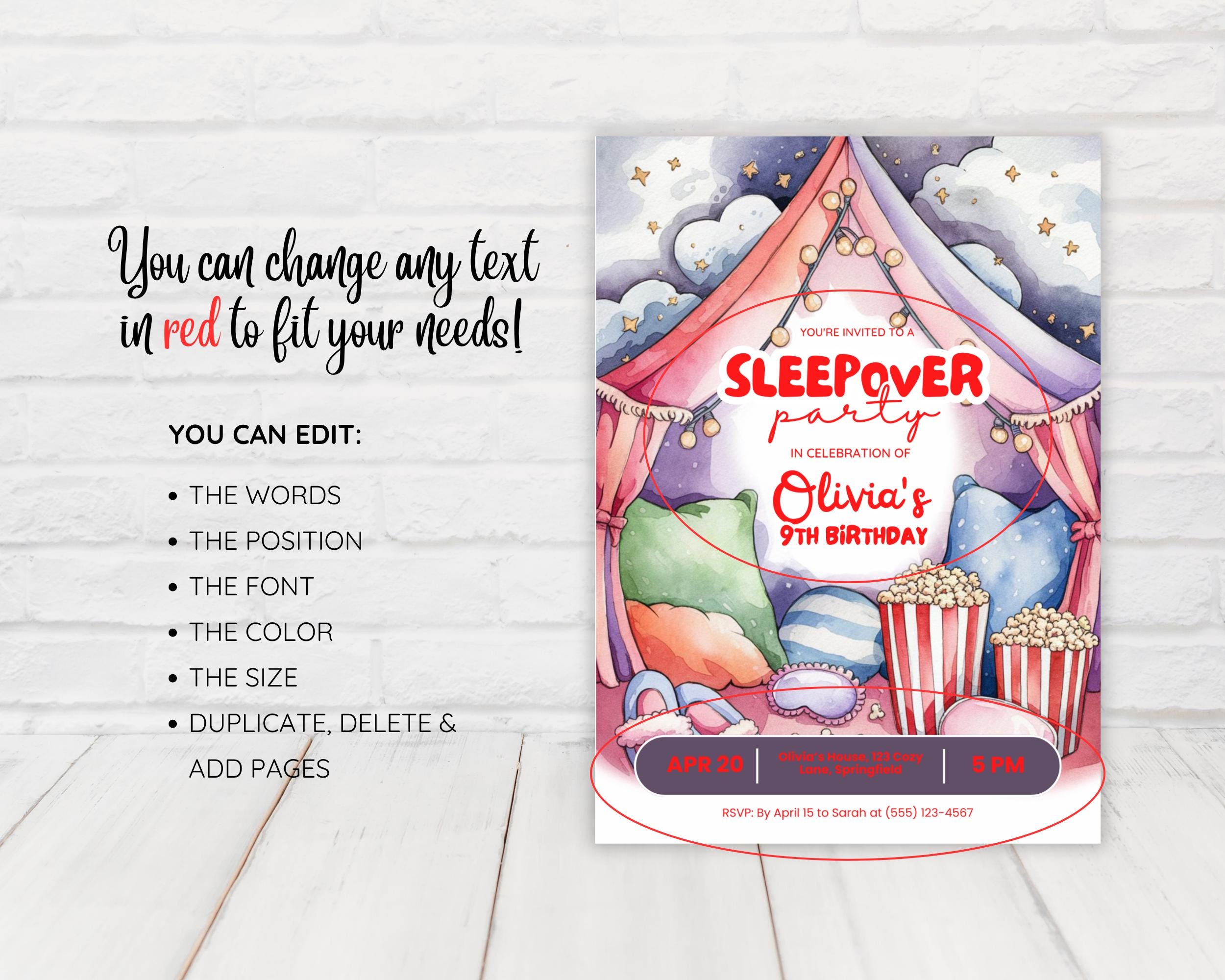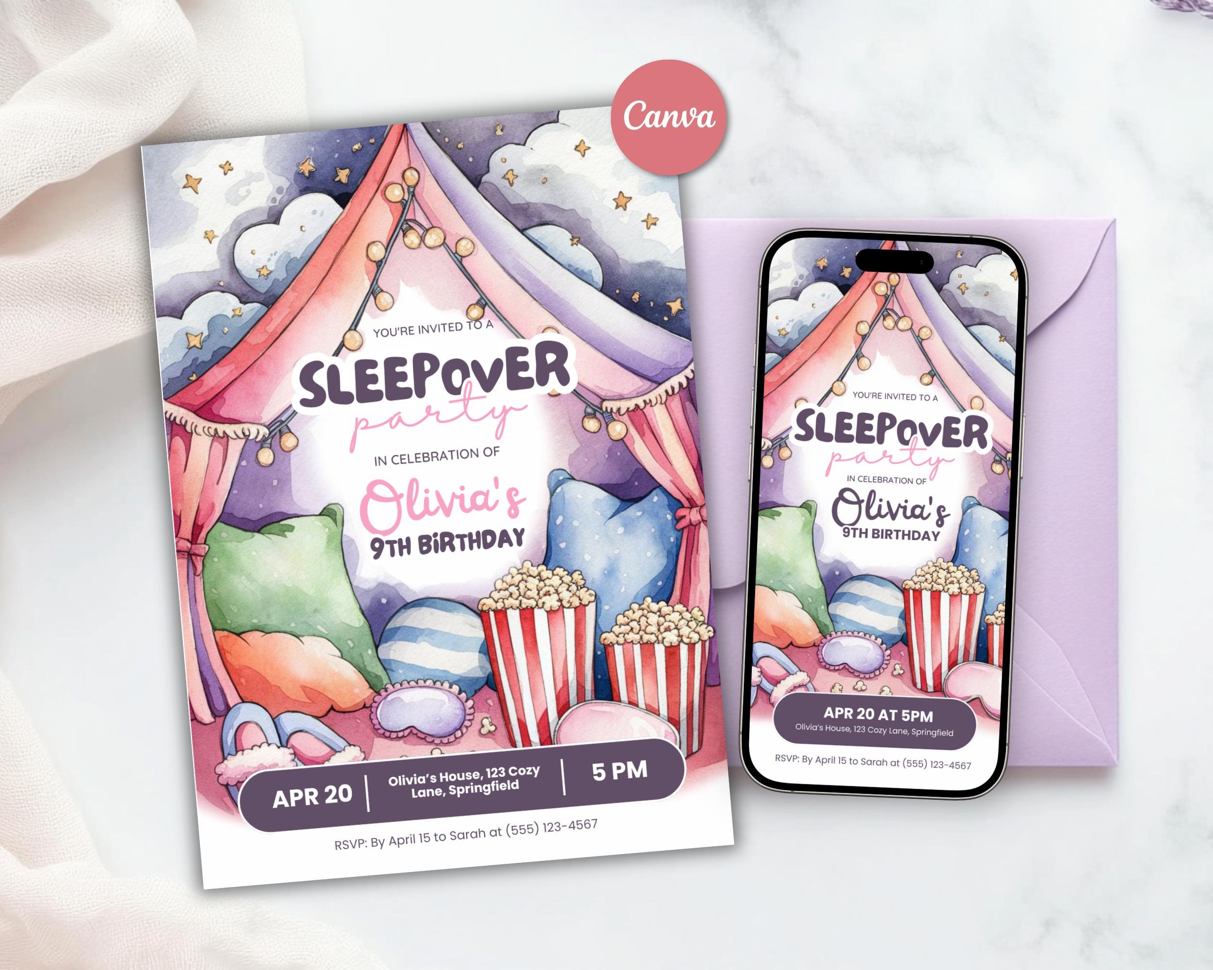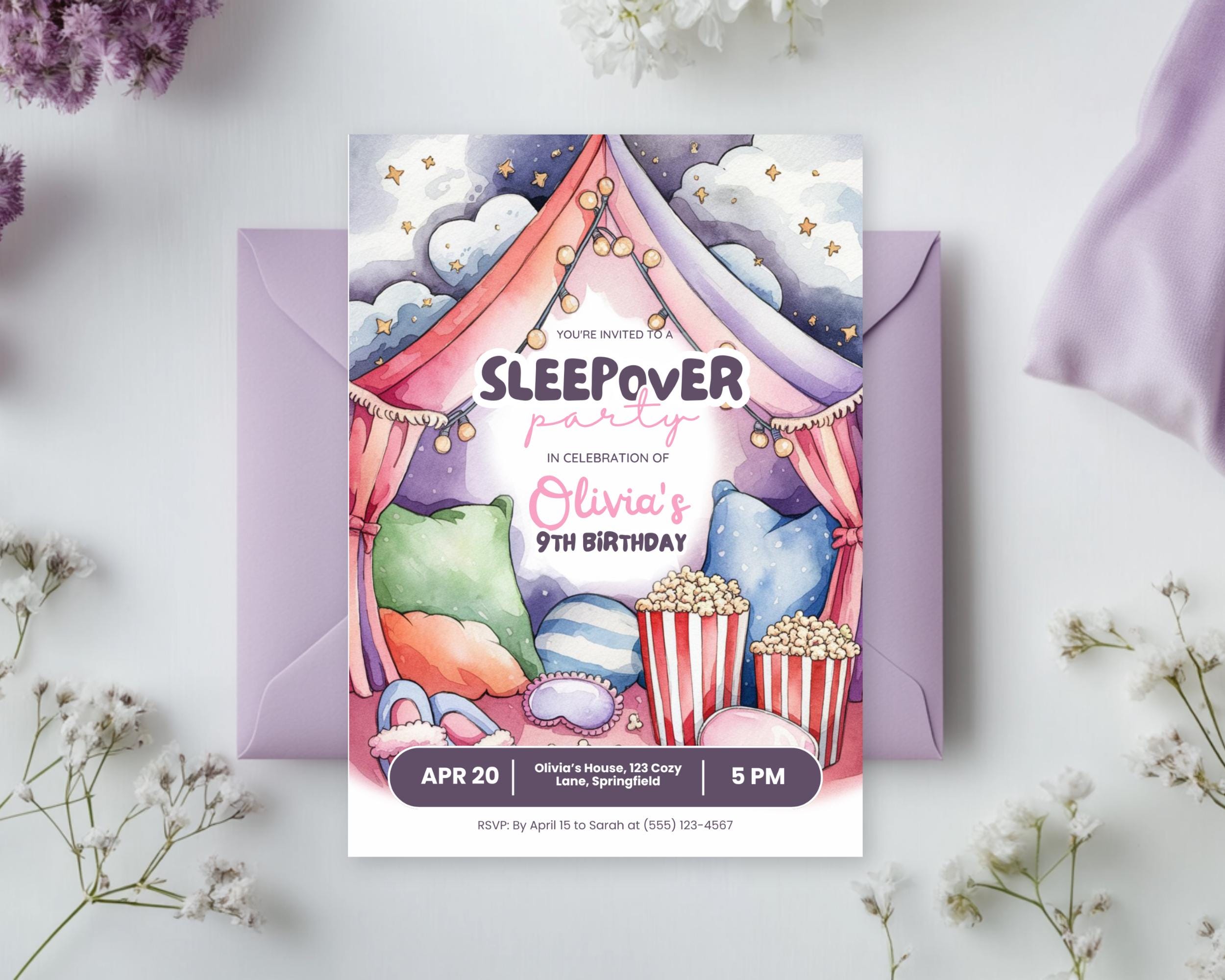 Sleepover Pajama Party Watercolor-Style Birthday Invitation Template Girls Acrylic Lamp