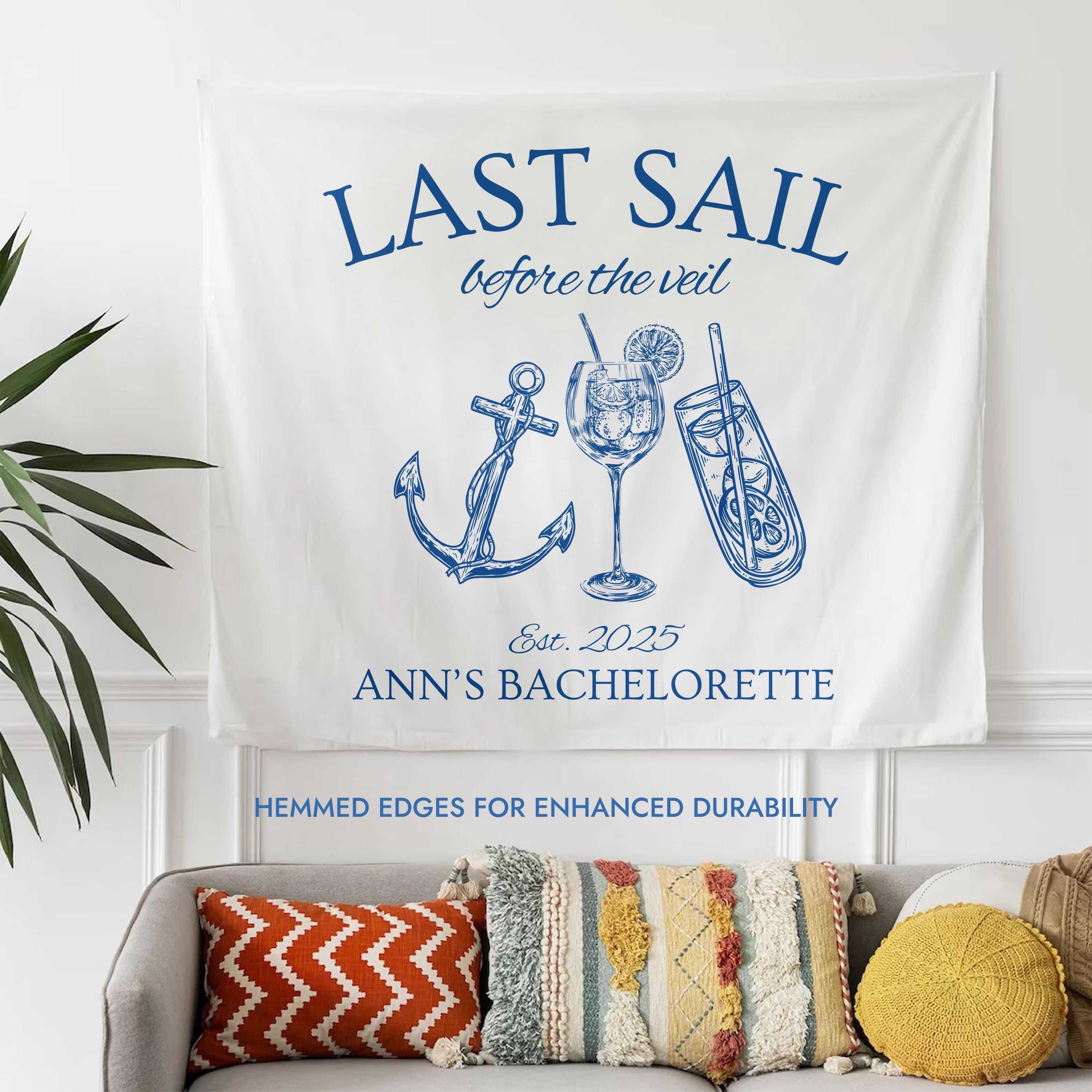 Make your bride-to-bes celebration unforgettable with our personalized sailing-themed tapestry! Perfect as a bridal shower backdrop, coastal bachelorette party dcor, or beach party banner, this design adds the perfect nautical touch to your event.