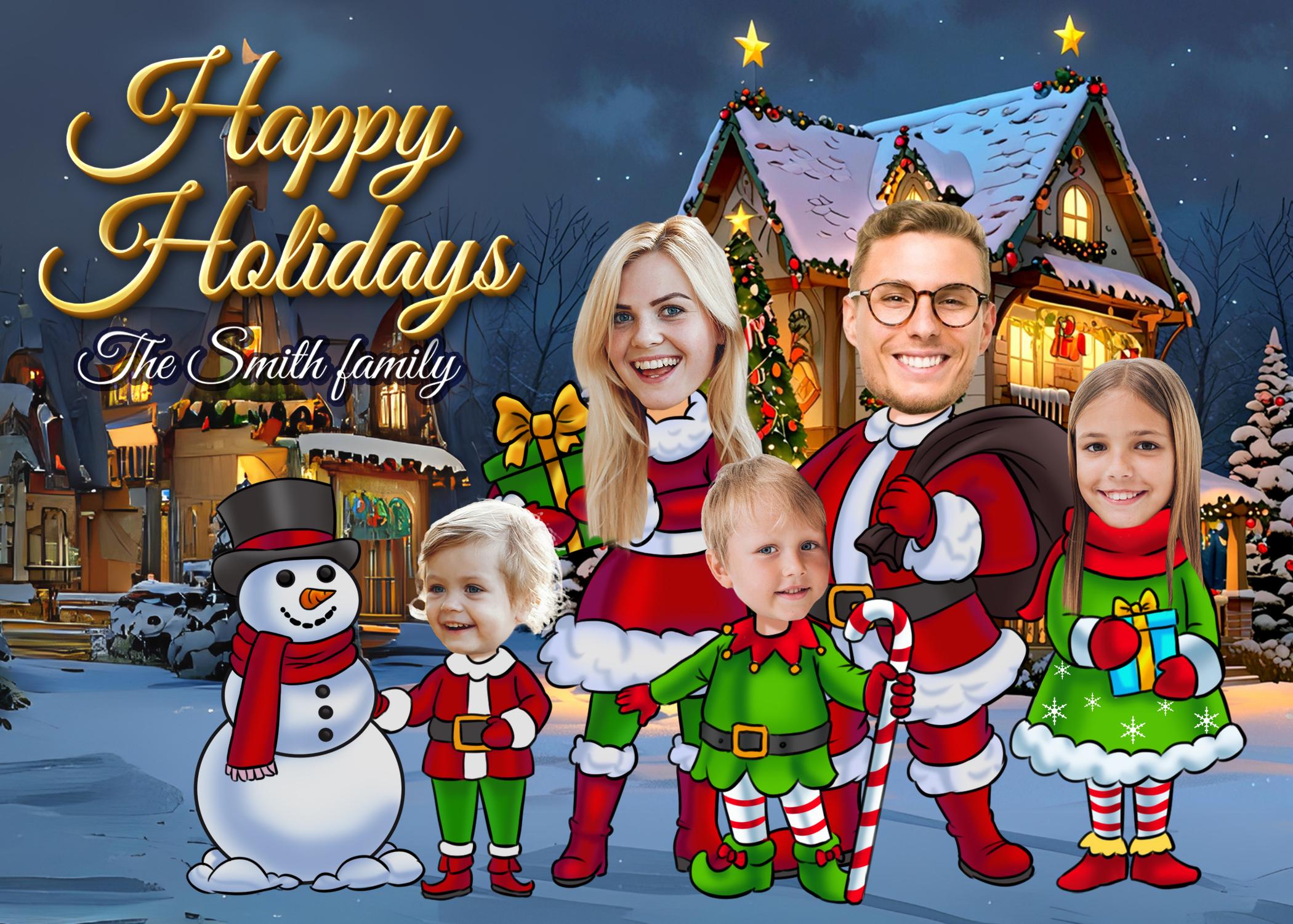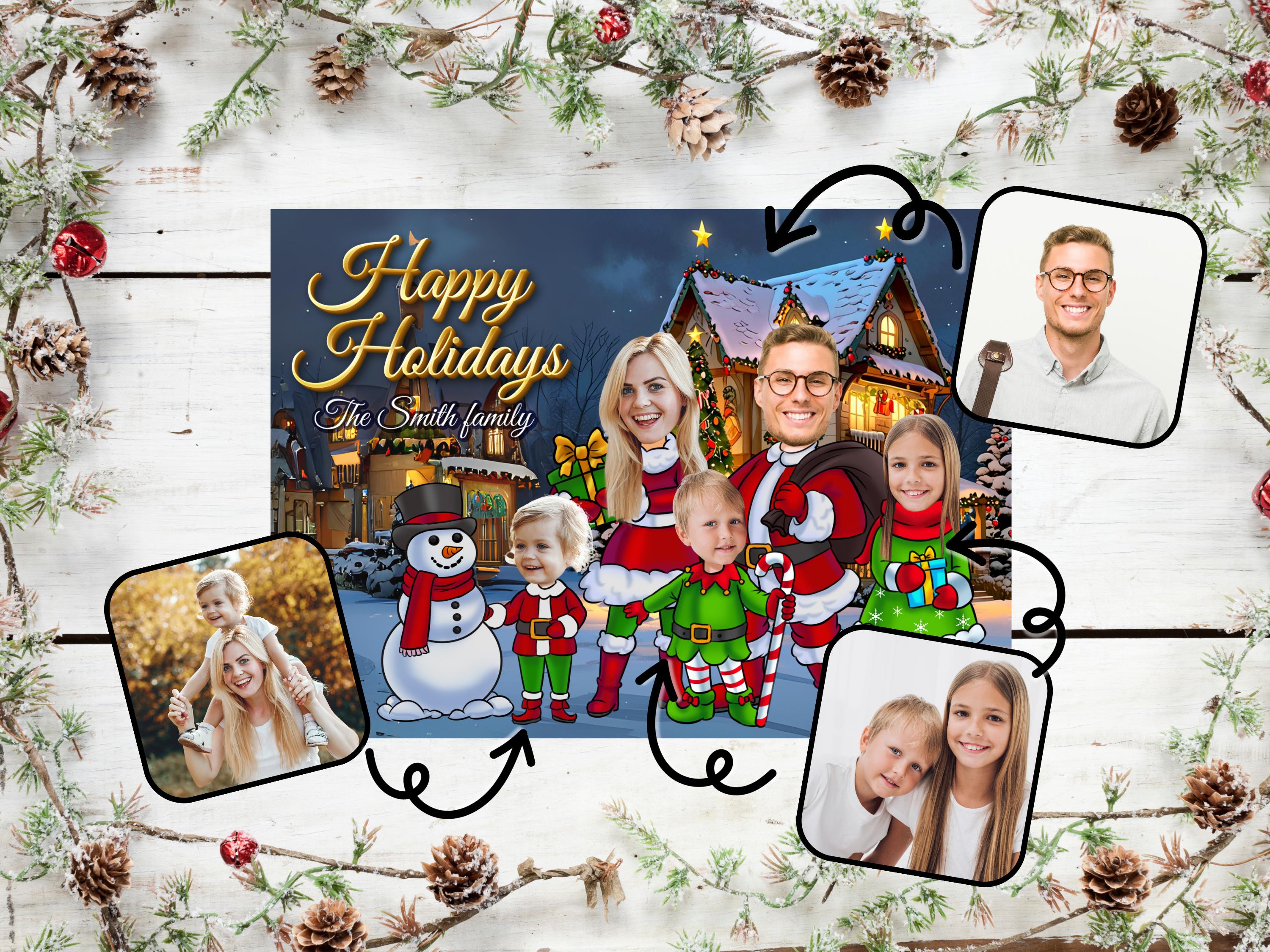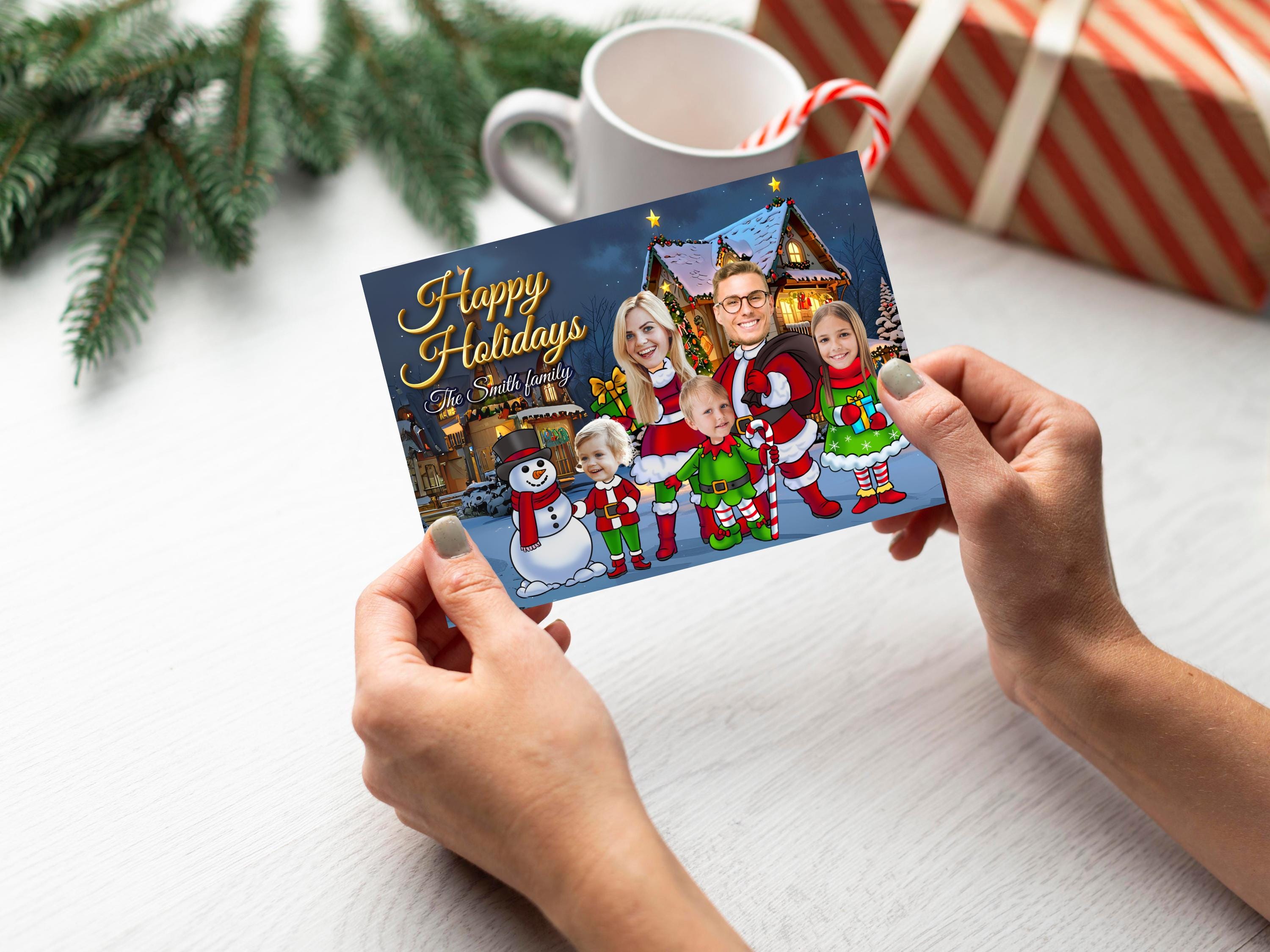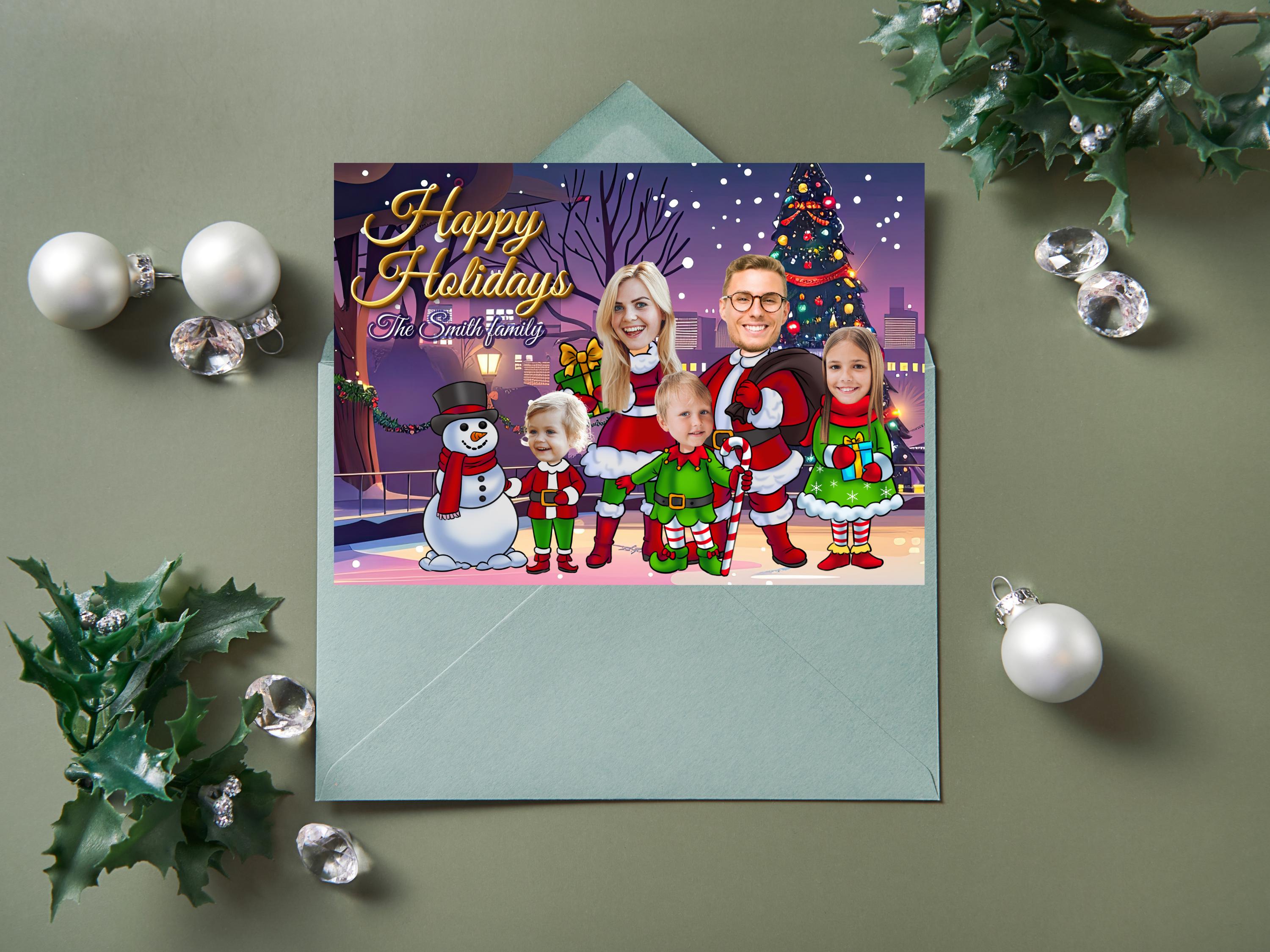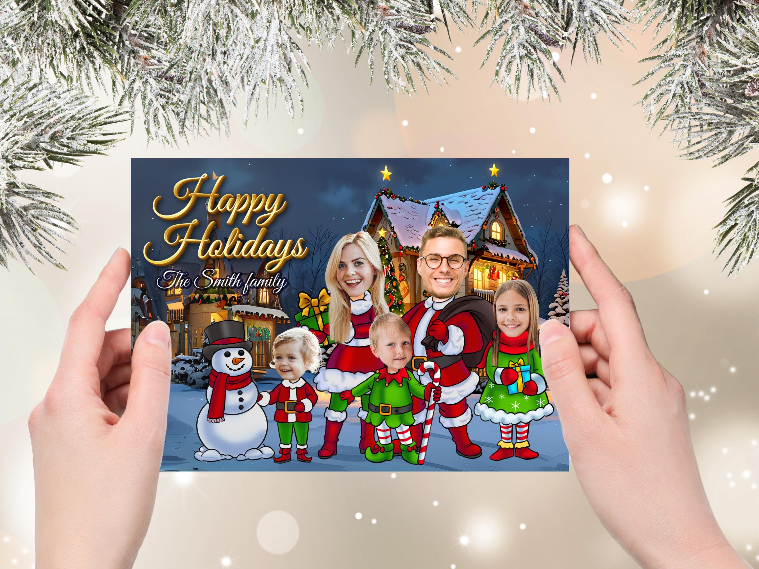 The Funny Photo Christmas Greeting Card is a playful and personalized way to send holiday wishes! Featuring Elves Family or Company Holiday Card designs, you can add your family members' or team members' faces onto elf bodies for a lighthearted, festive touch. Material: A2 self-seal envelopes Heavyweight Folded Cardstock 100% acid-free Size: 4.25" x 5.5"
