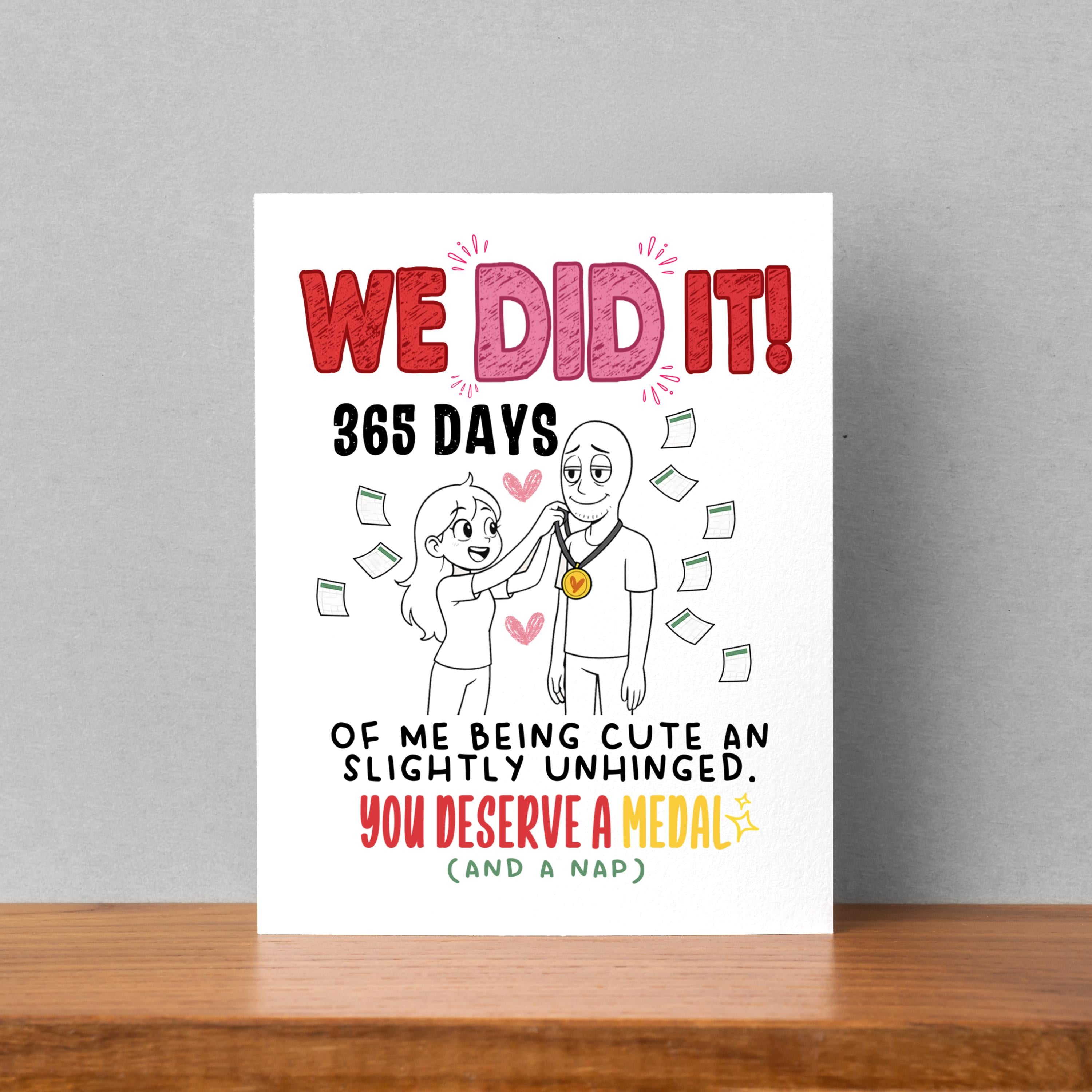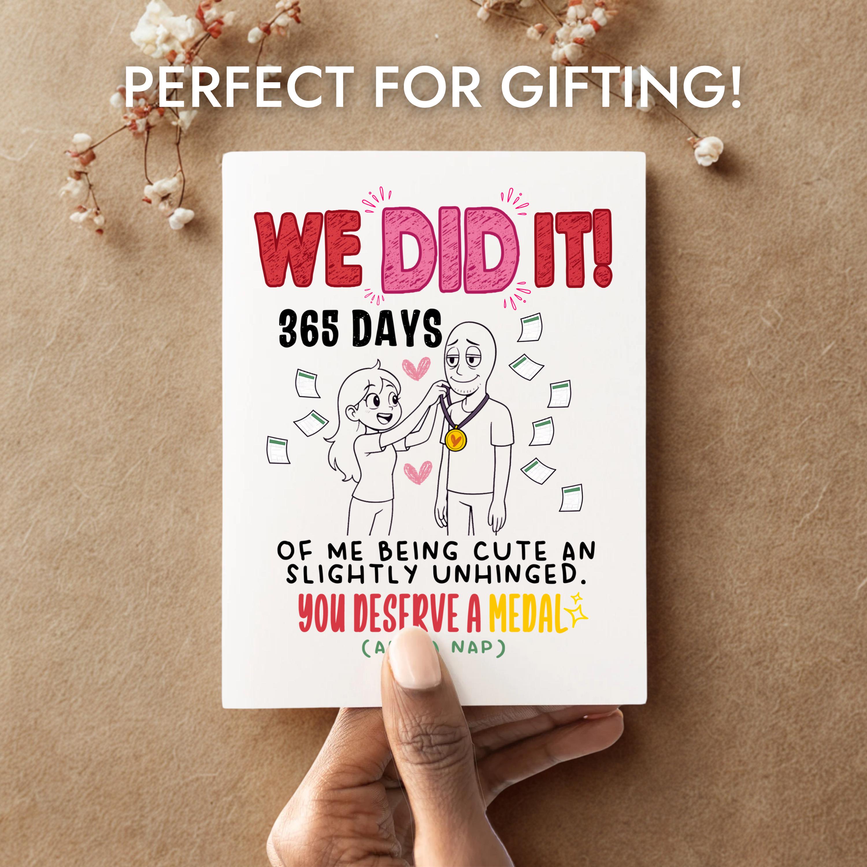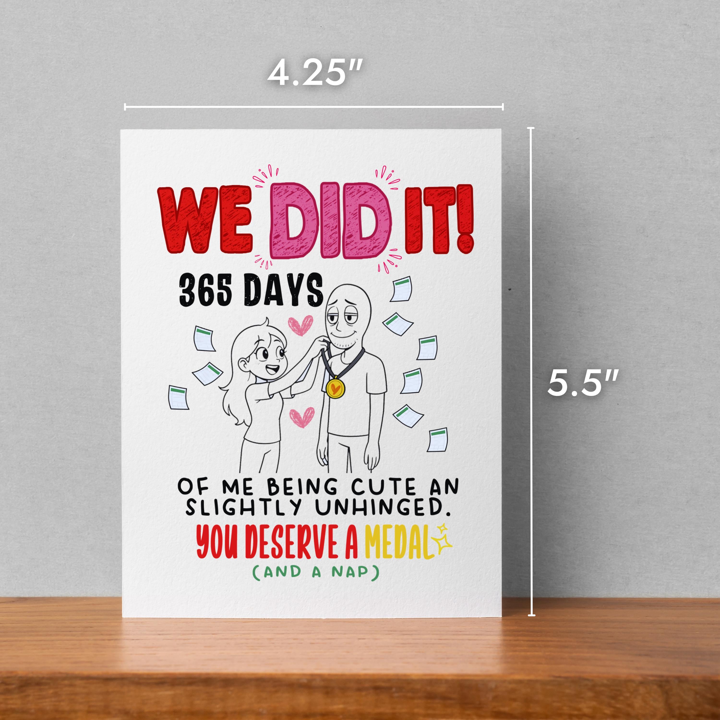 Celebrate your first 365 days together with this Funny 1st Anniversary Greeting Card perfect for your boyfriend or partner! Whether you're marking a year of dating or marriage, this card adds a lighthearted and meaningful touch to your special day. Material: A2 self-seal envelopes Heavyweight Folded Cardstock 100% acid-free Size: 4.25" x 5.5"