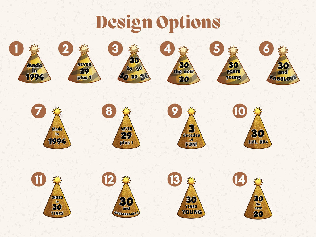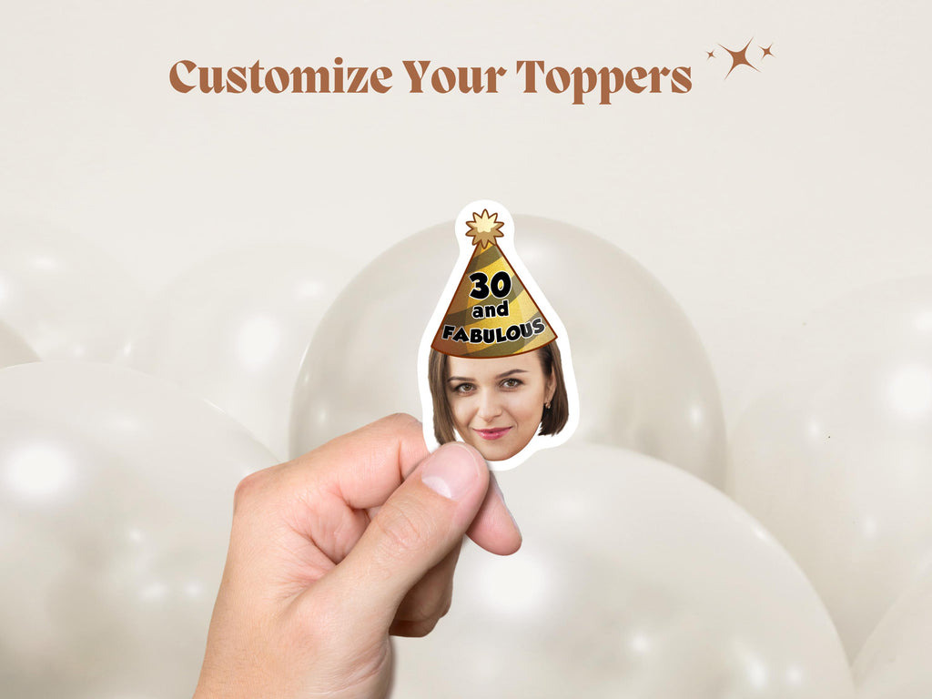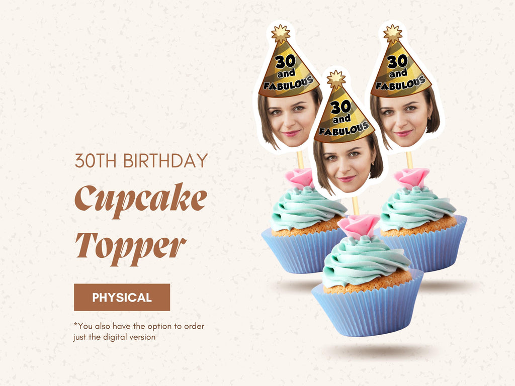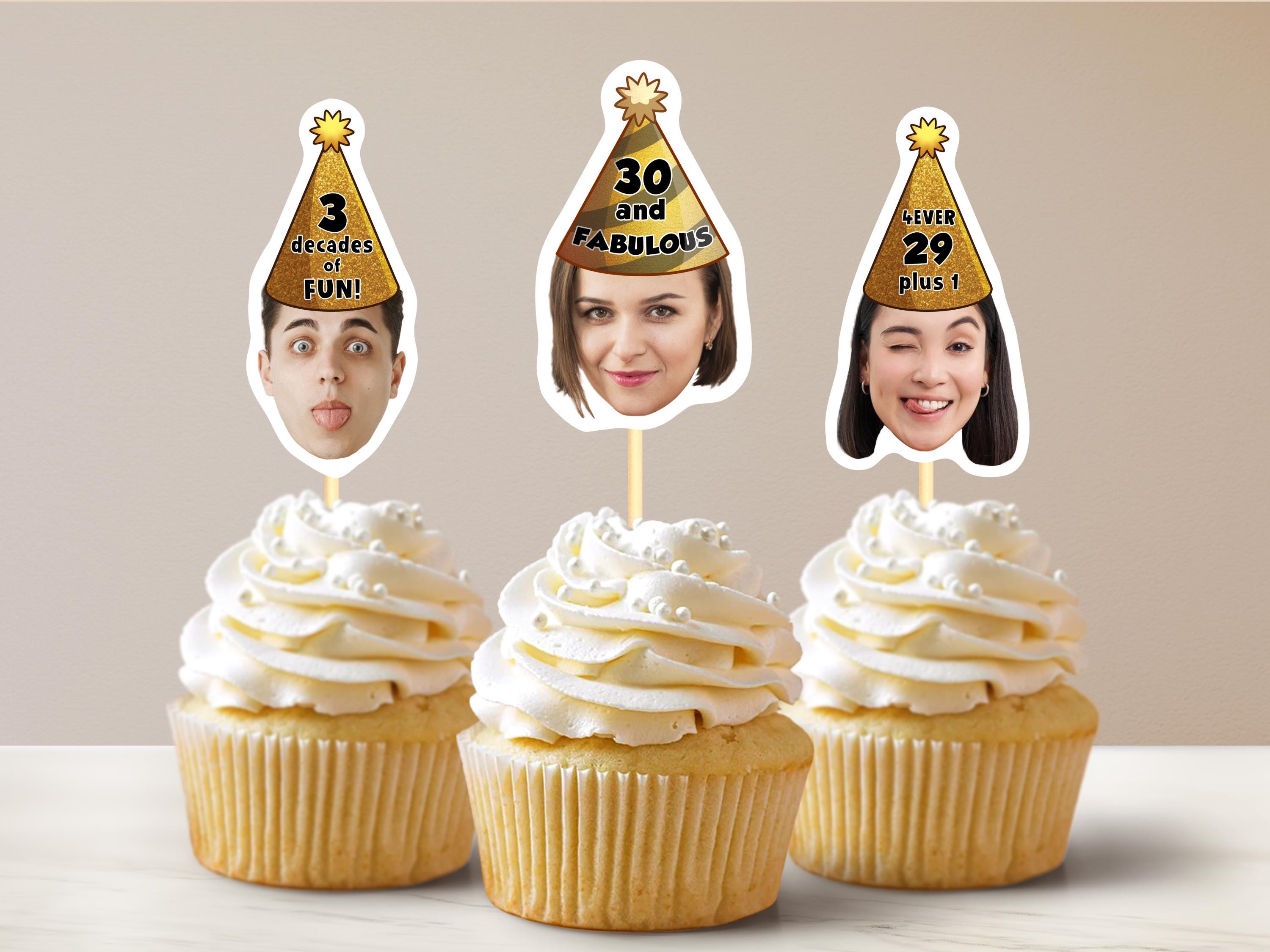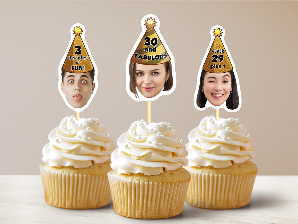 Celebrate the big 3-0 in style with personalized 30th birthday hat cupcake toppers or stickers! Add a special touch by featuring your friend's face in designs that turn cupcakes into festive treats.