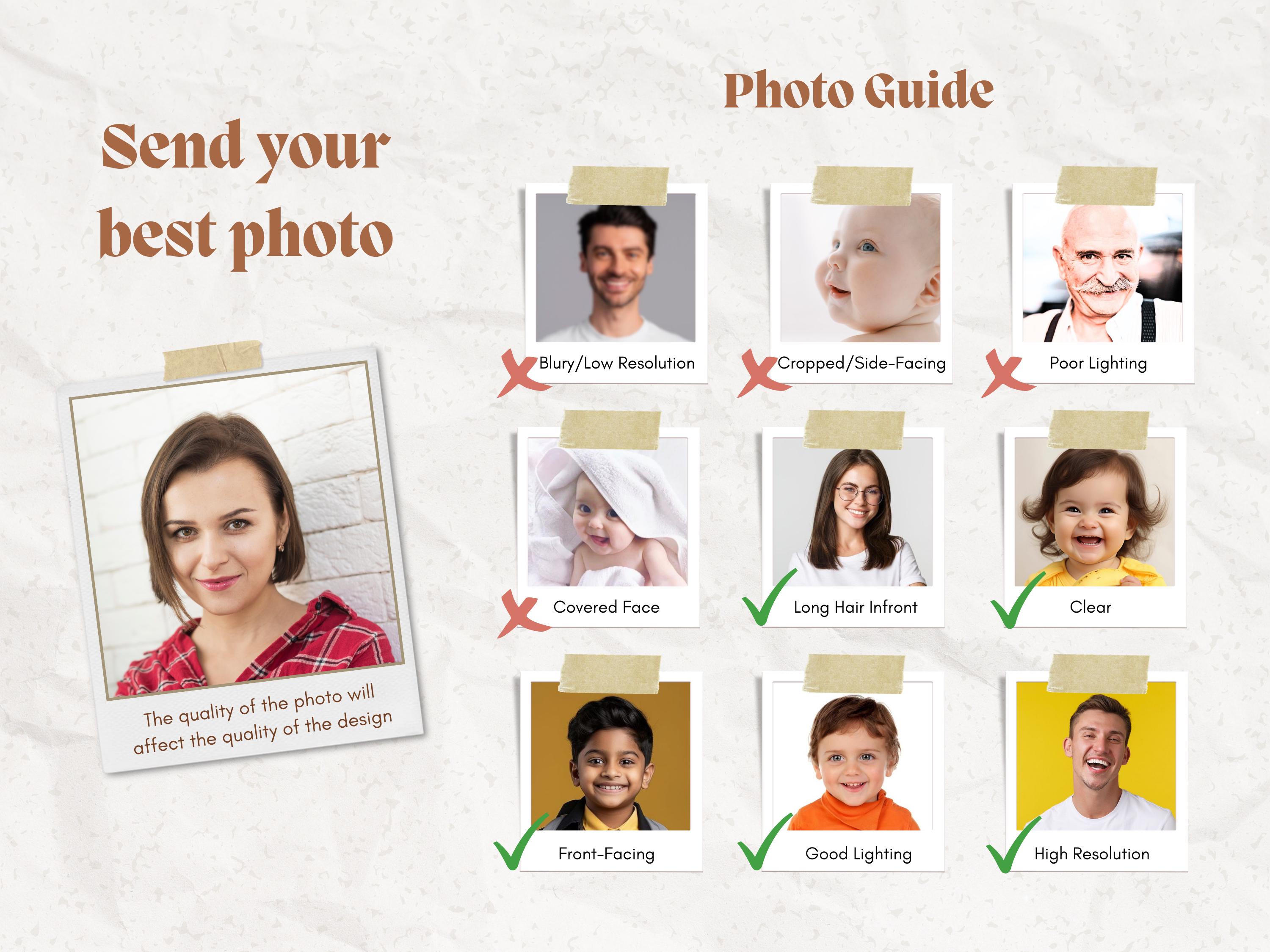 ⚠️ Photo quality directly impacts the final design. For best results, use clear, straight-facing, well-lit images.