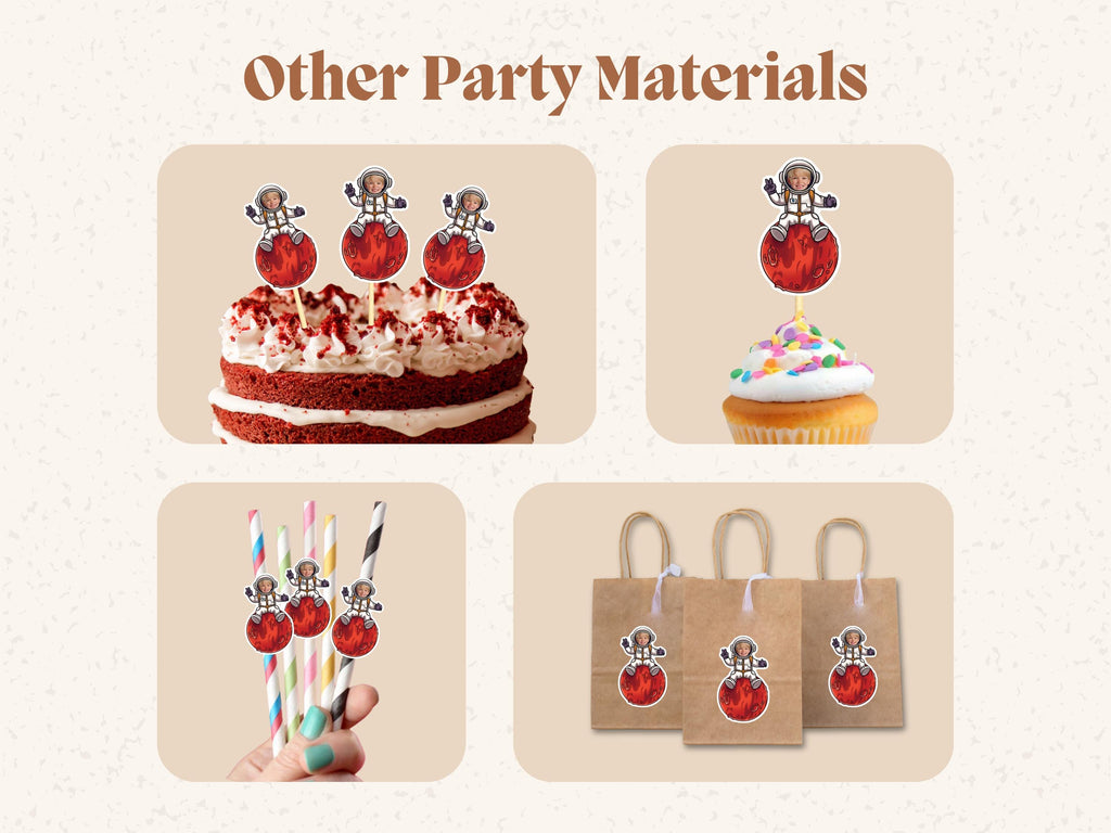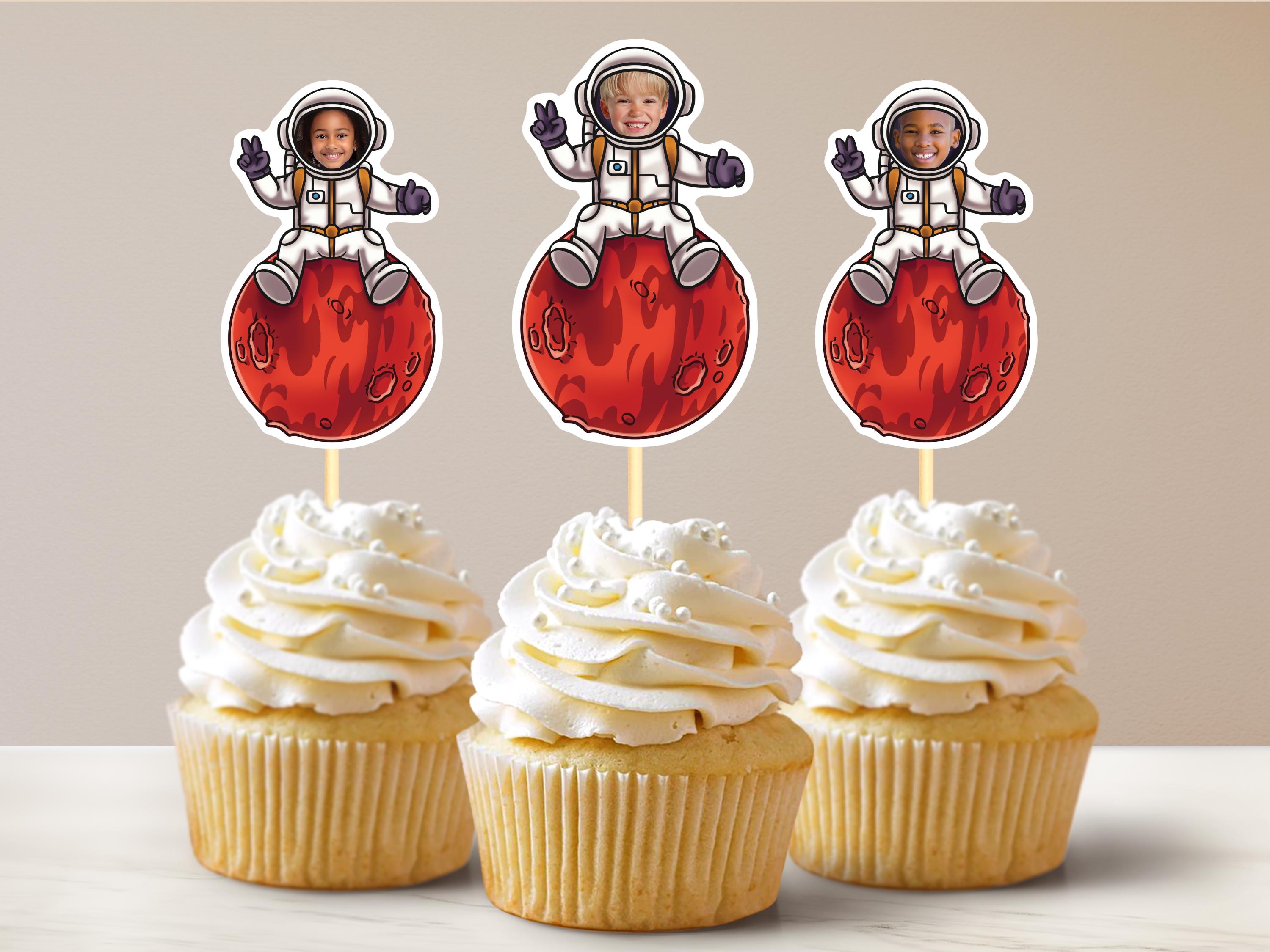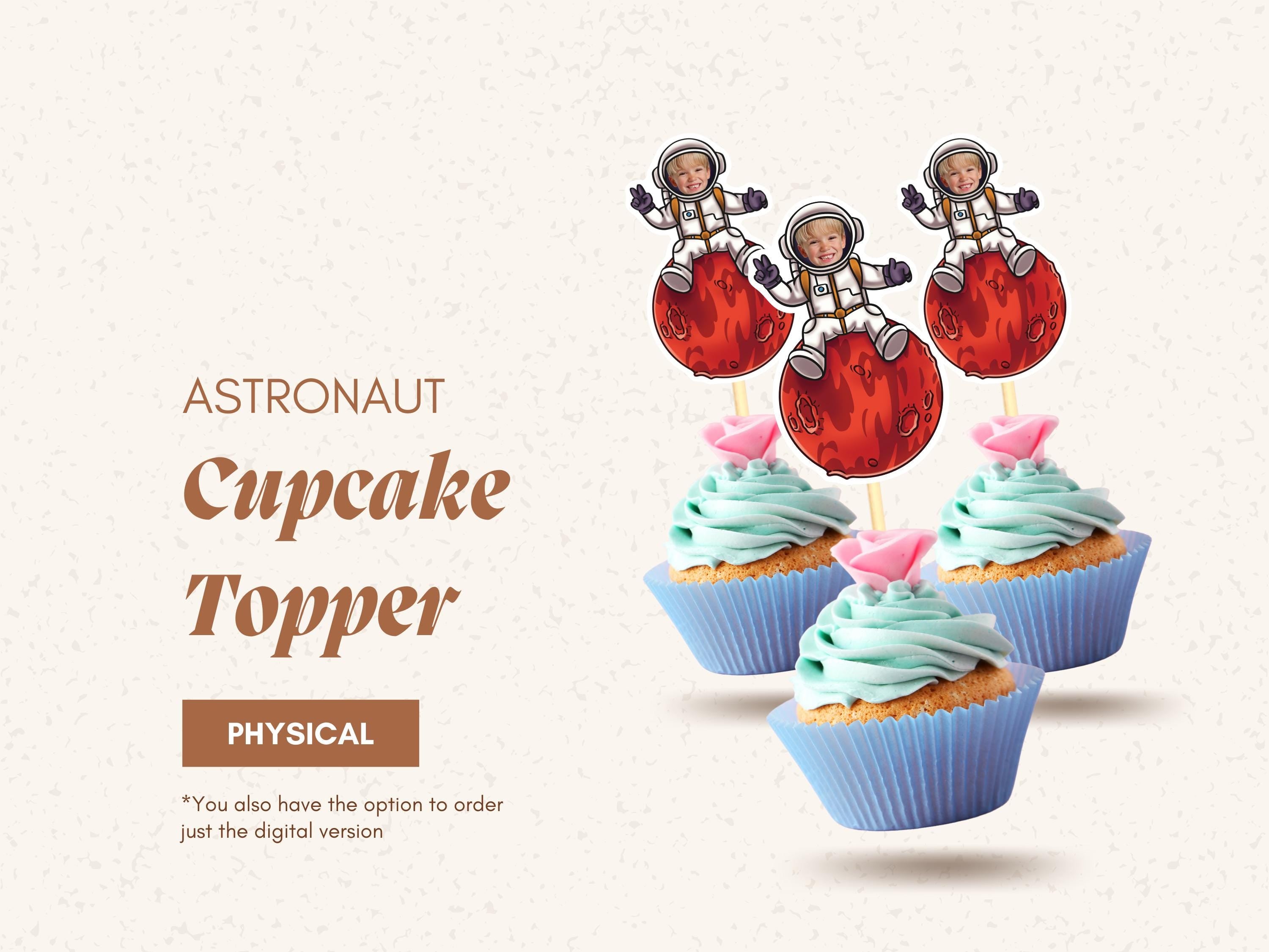 Elevate your festivities to interstellar heights with our personalized astronaut cupcake toppers! Infuse a cosmic touch to your cupcakes and beyond with these captivating stickers adorned with unique astronaut designs, all featuring your child's own beaming face.