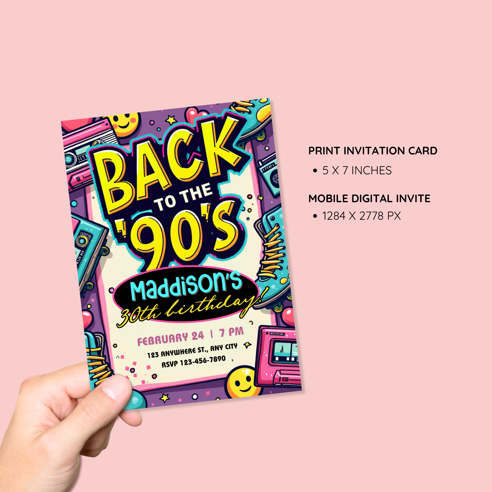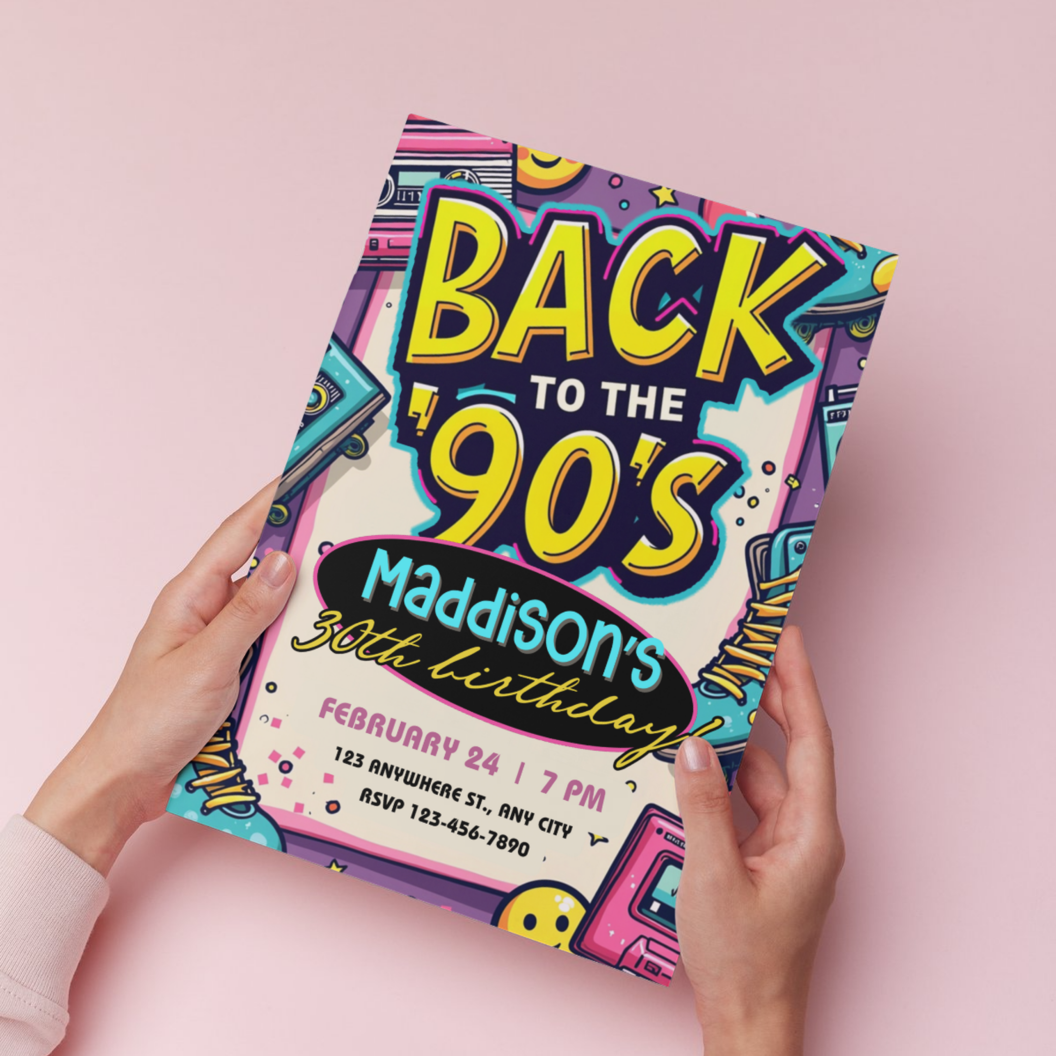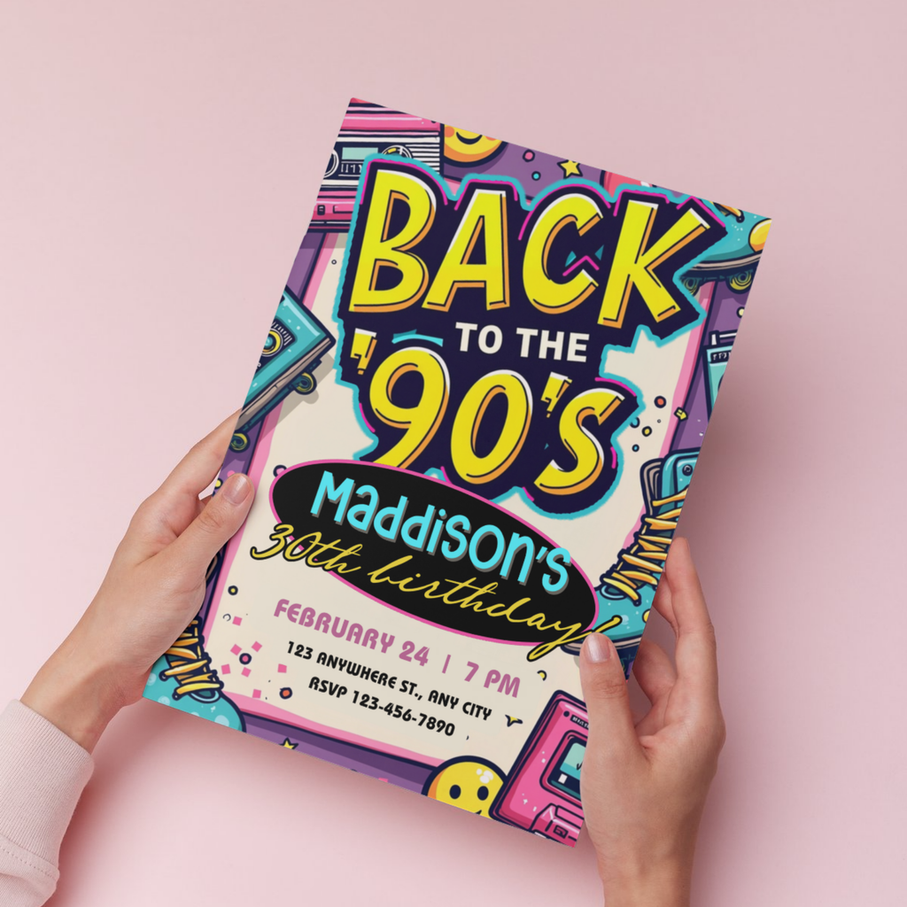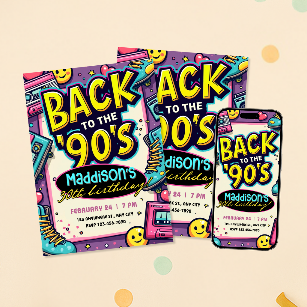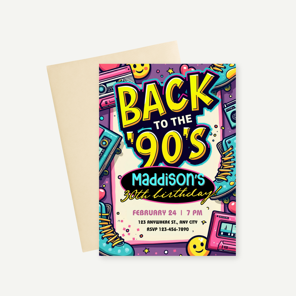 Get ready to rewind time and party like it's the 1990s! This retro birthday invitation brings all the nostalgic vibes—think bold colors, funky patterns, cassette tapes, and classic '90s flair. Perfect for anyone who grew up in the best decade or just loves throwback fun!
