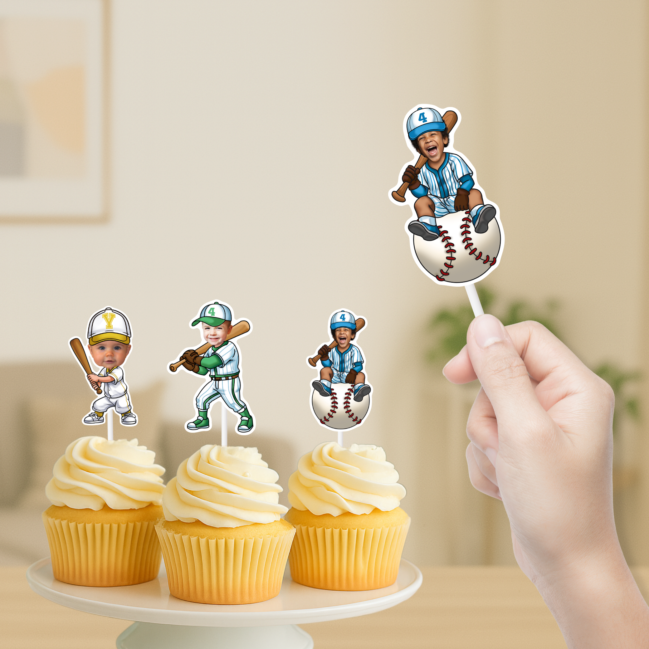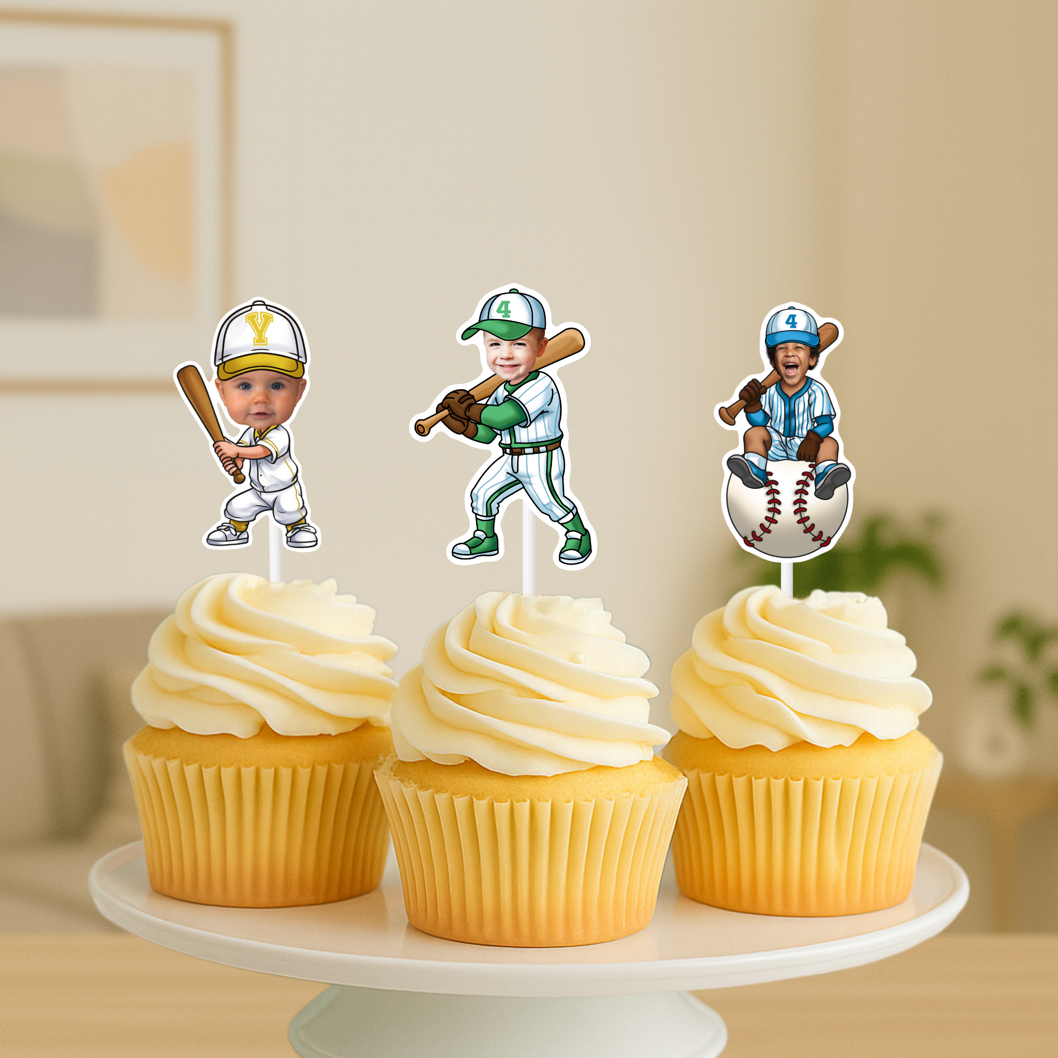 Knock it out of the park by showcasing your child's face on these custom designs, transforming cupcakes into a grand slam celebration.