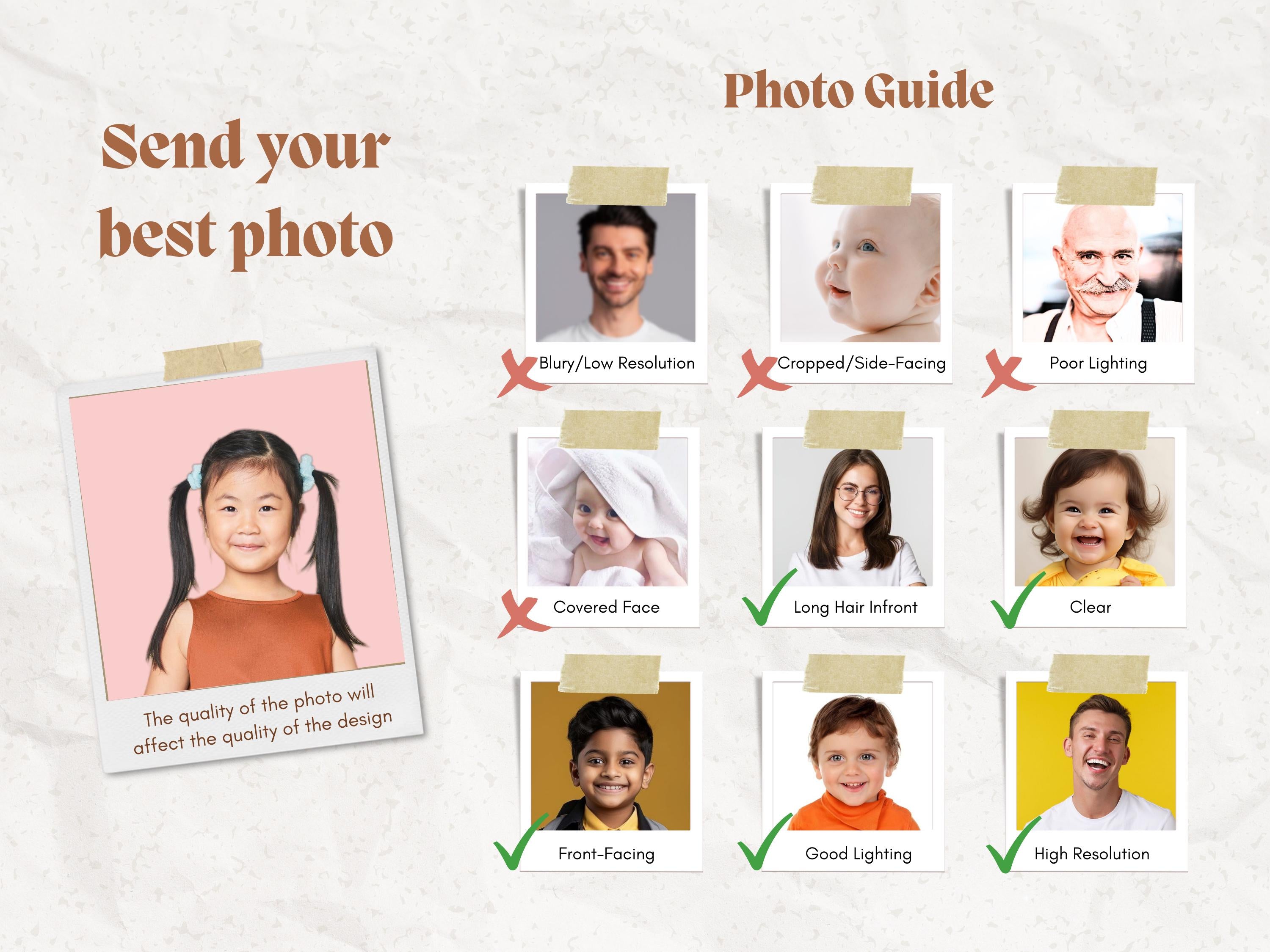 ⚠️ Photo quality directly impacts the final design. For best results, use clear, straight-facing, well-lit images.