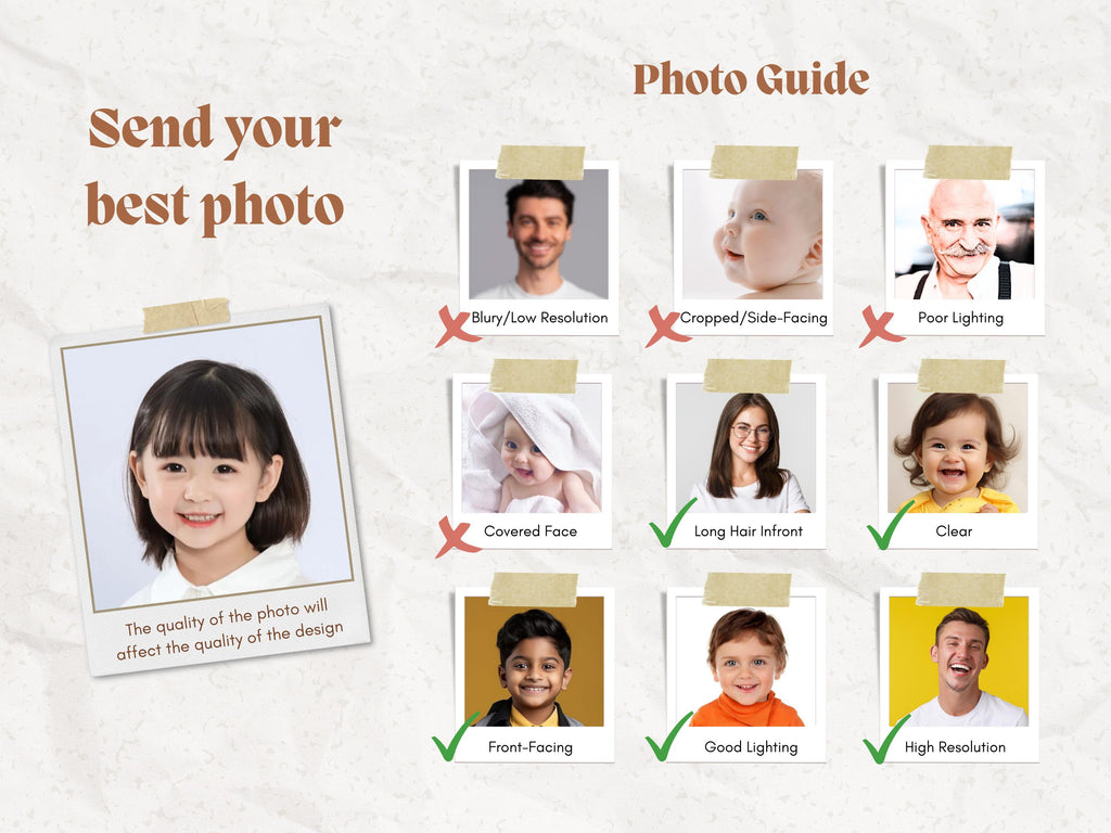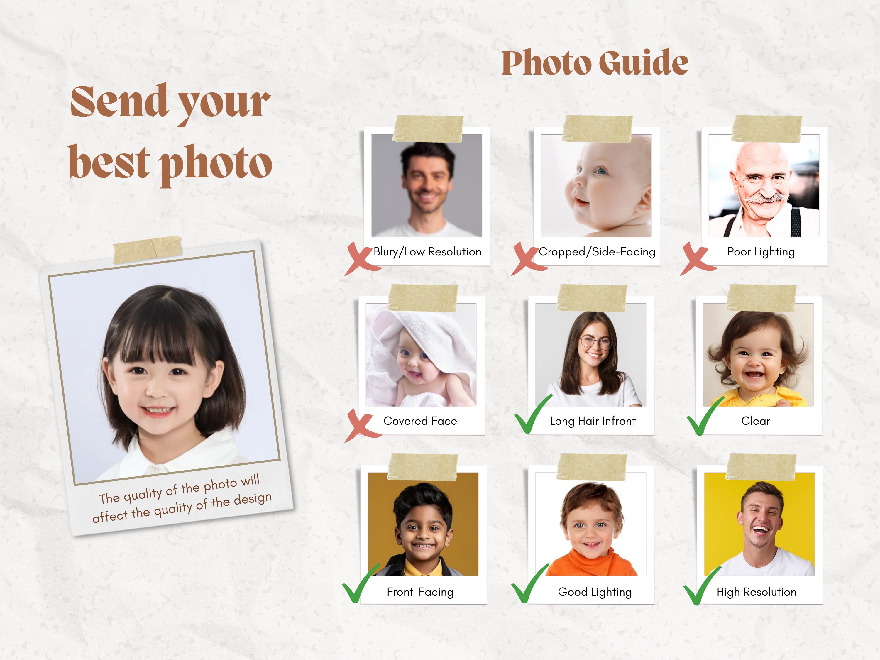 ⚠️ Photo quality directly impacts the final design. For best results, use clear, straight-facing, well-lit images.
