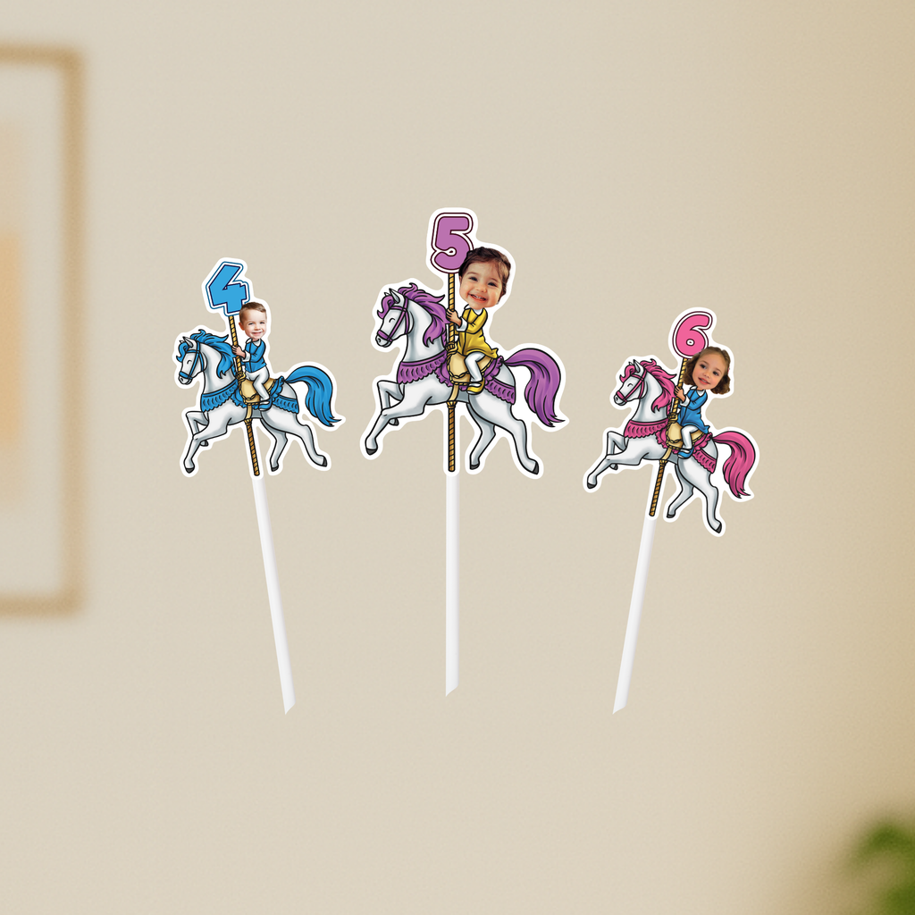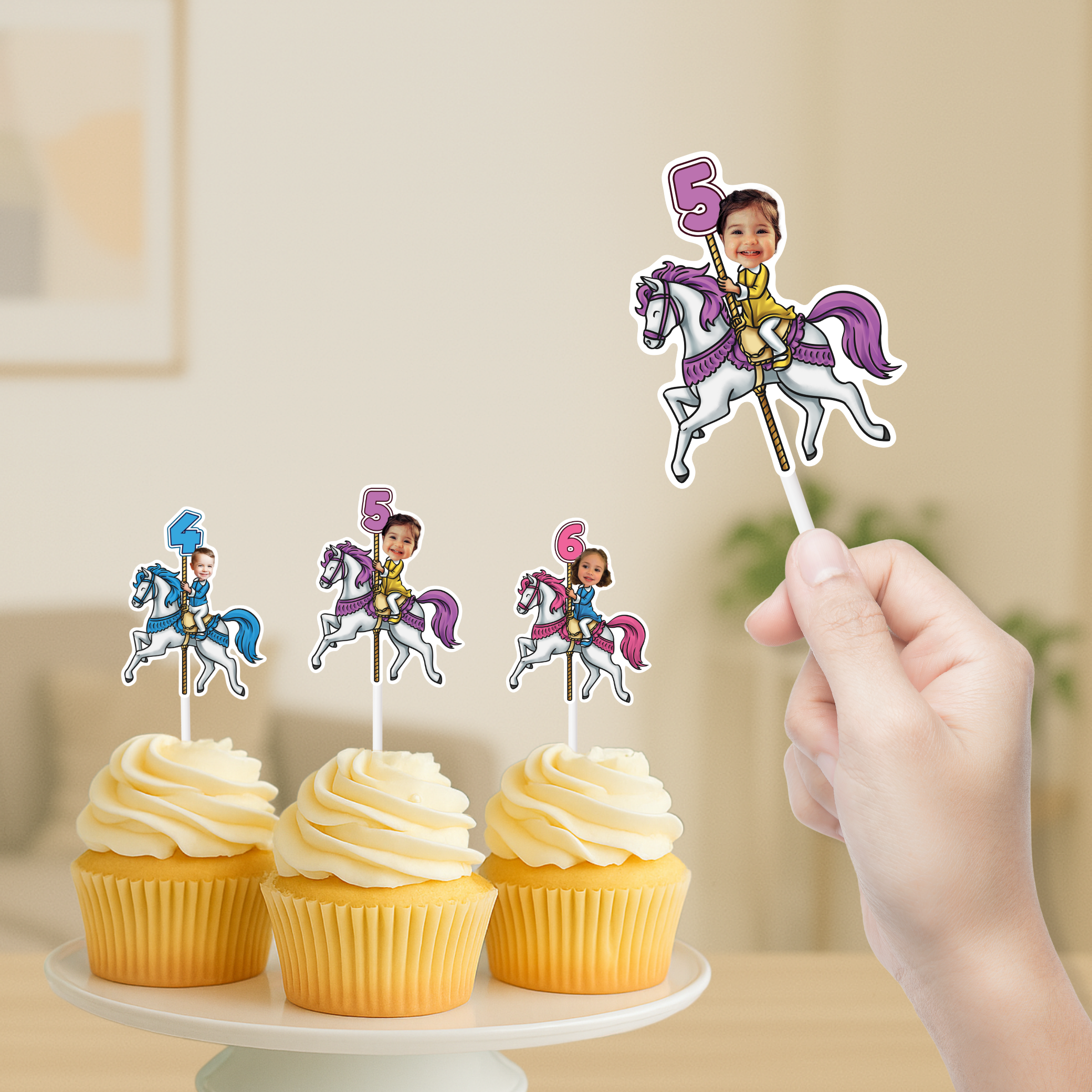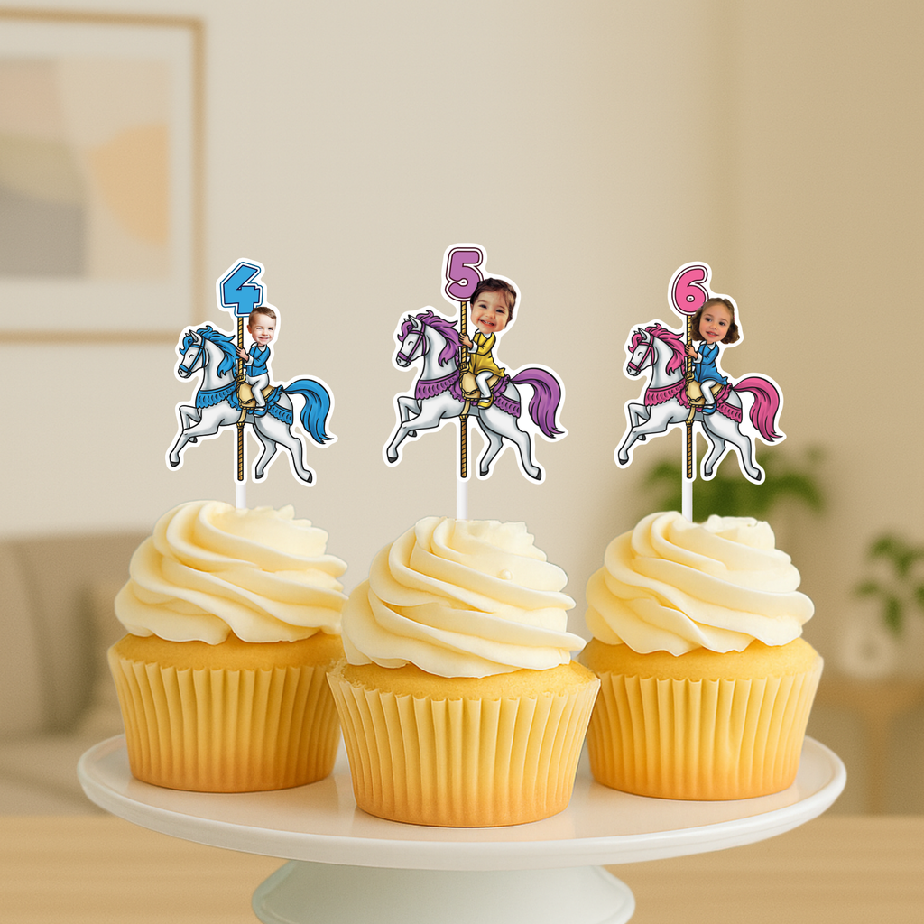 Step right up for a whimsical celebration with personalized carousel-themed cupcake toppers or stickers! Add a special touch by featuring the celebrant's face in designs that turn cupcakes into enchanting carousel treats. Perfect for a carousel-themed bash, these toppers also double as versatile stickers.