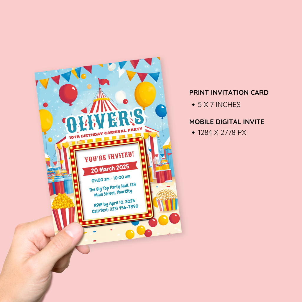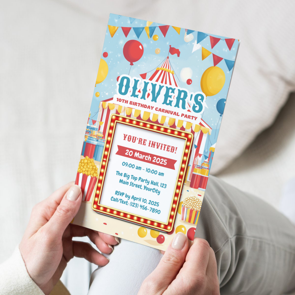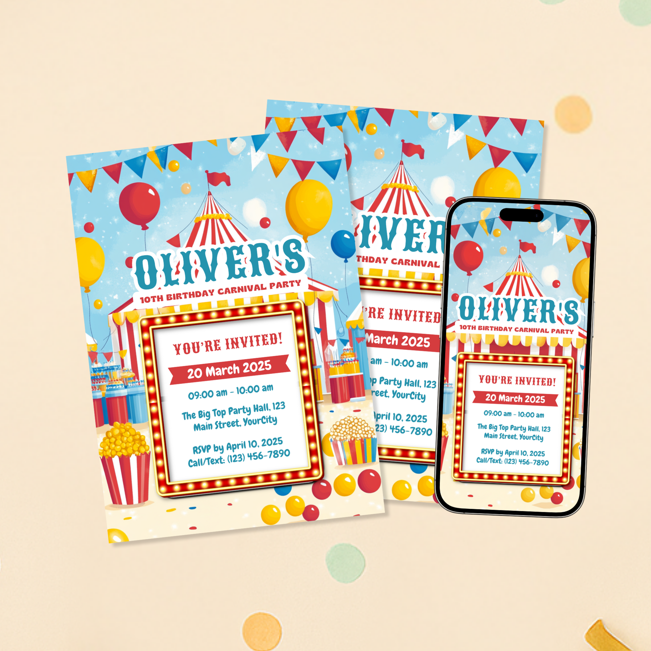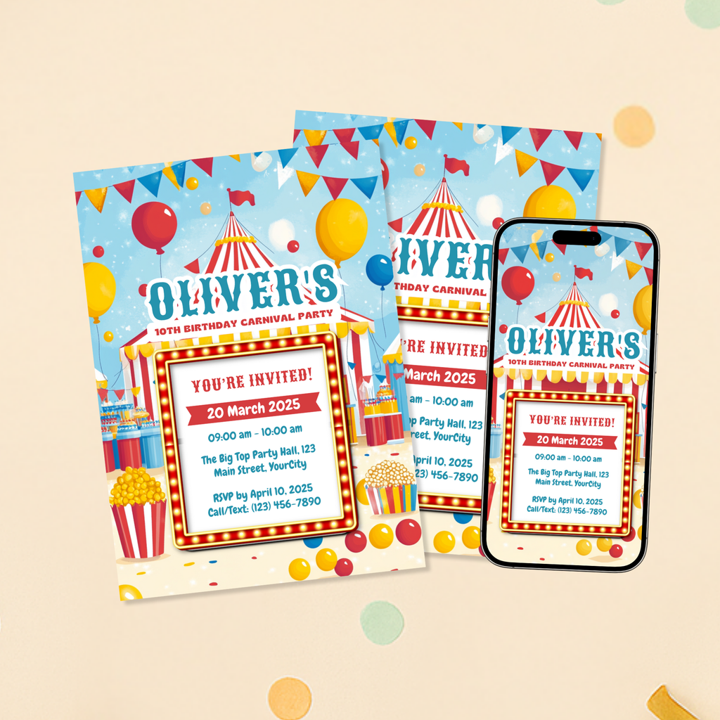 Step right up and get ready for a fun-filled celebration with this Carnival Birthday Invitation! Perfect for a circus-themed party, this invitation sets the stage for an unforgettable day of games, treats, and excitement under the big top! With bold stripes, playful fonts, and vintage carnival-inspired details, this design is sure to delight guests of all ages.