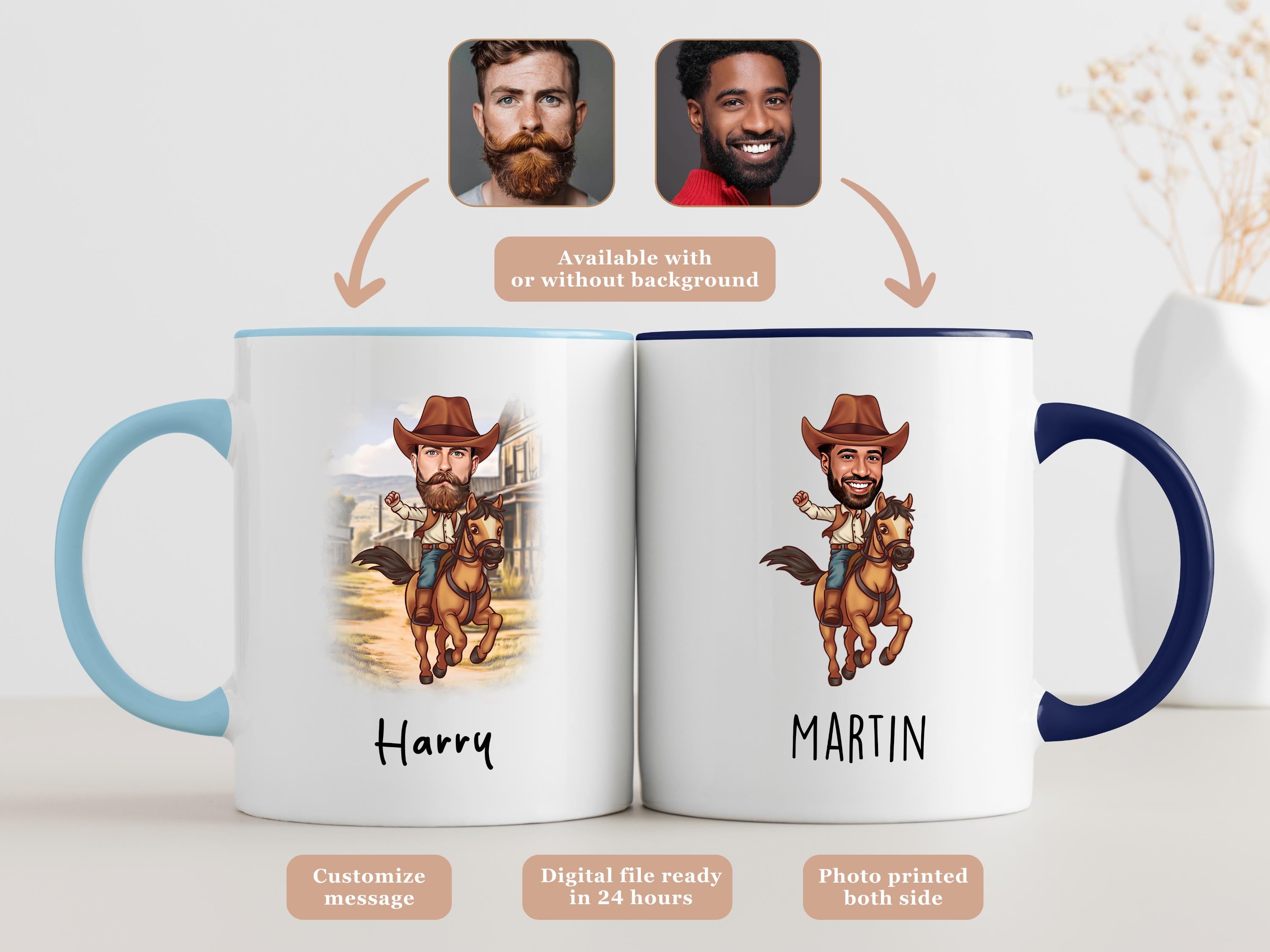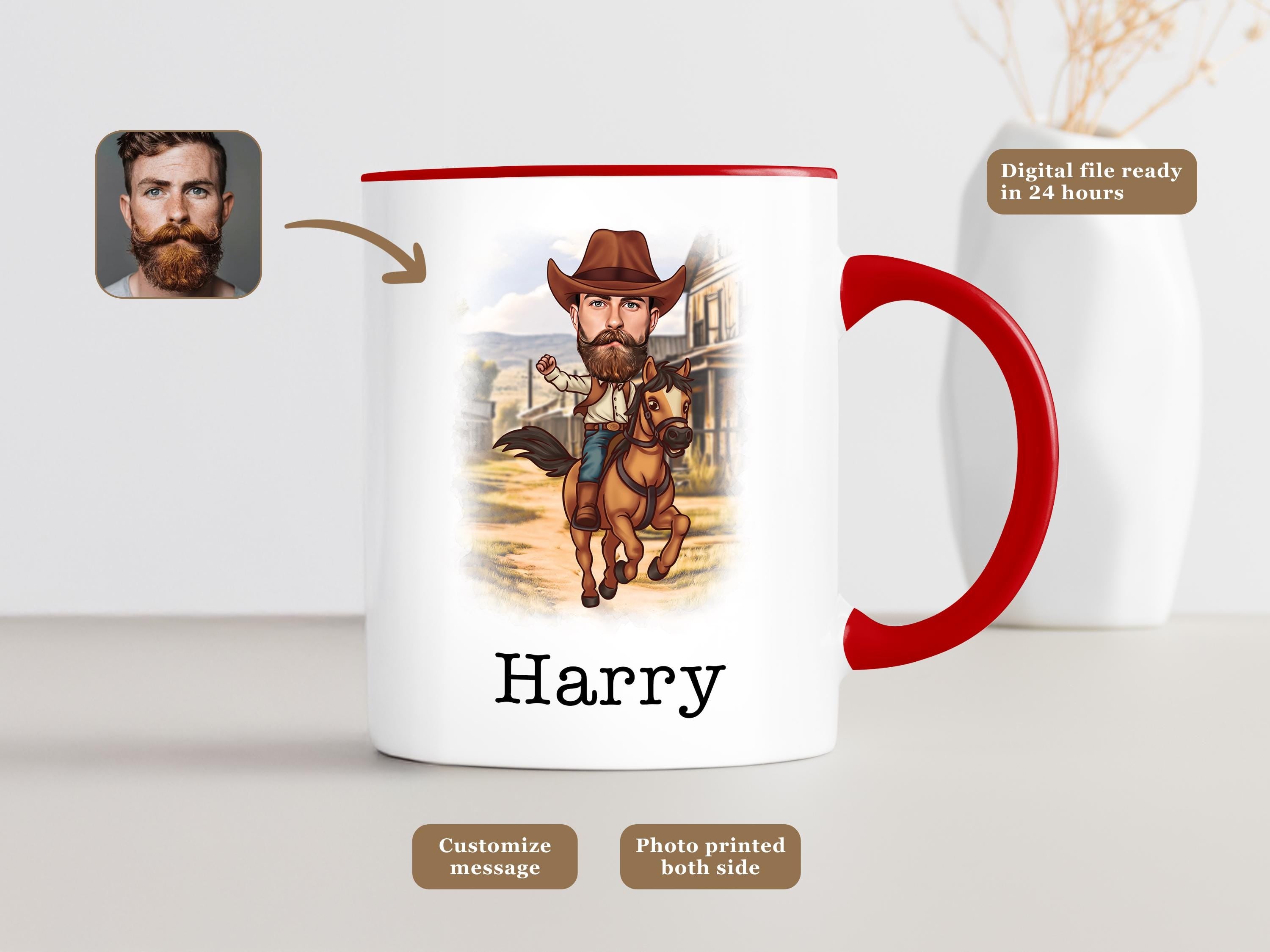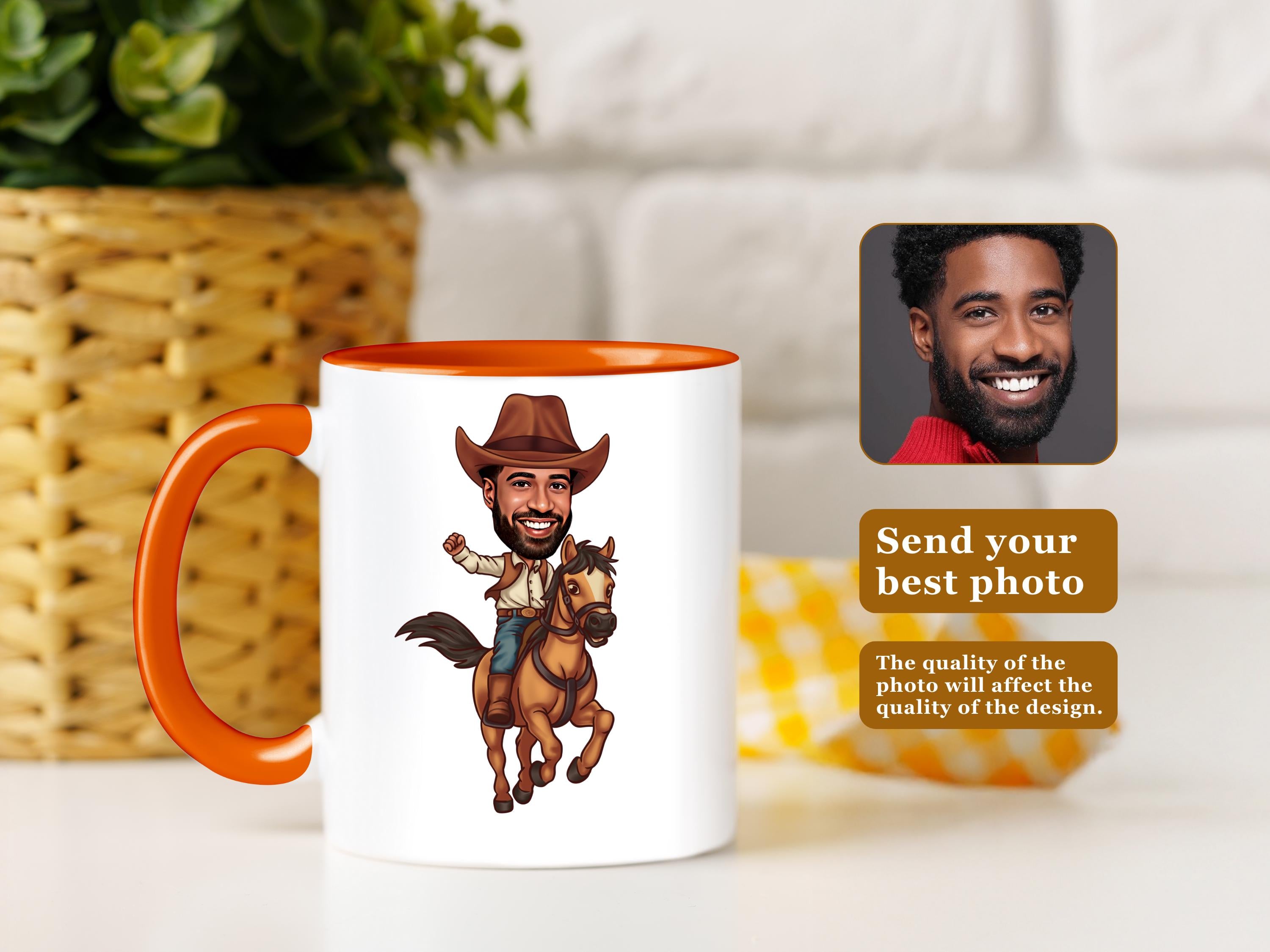 Saddle up for a unique gift with a custom cowboy caricature mug! This personalized design captures the wild spirit of the West, making it perfect for rodeo lovers, ranchers, or anyone who loves the cowboy lifestyle.
