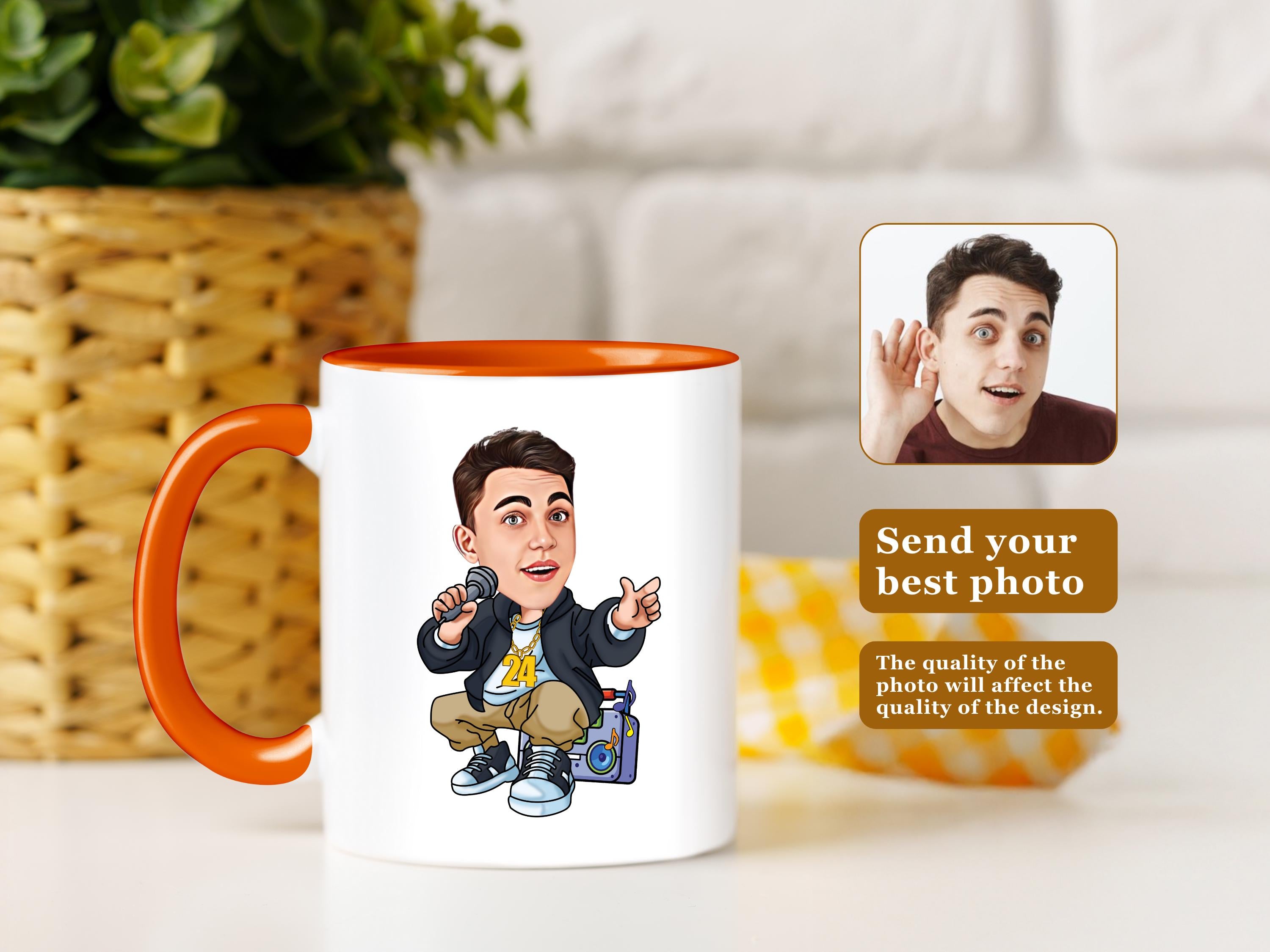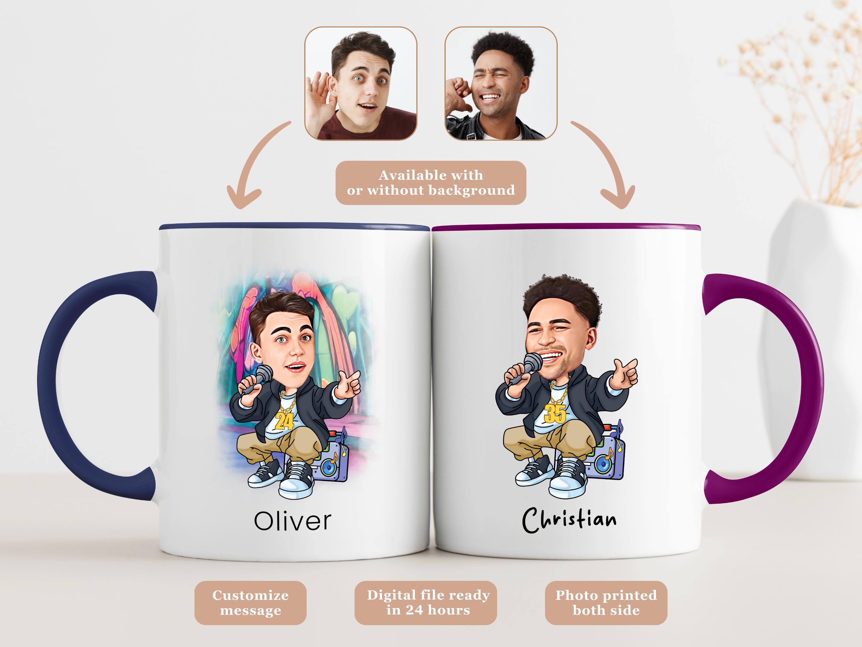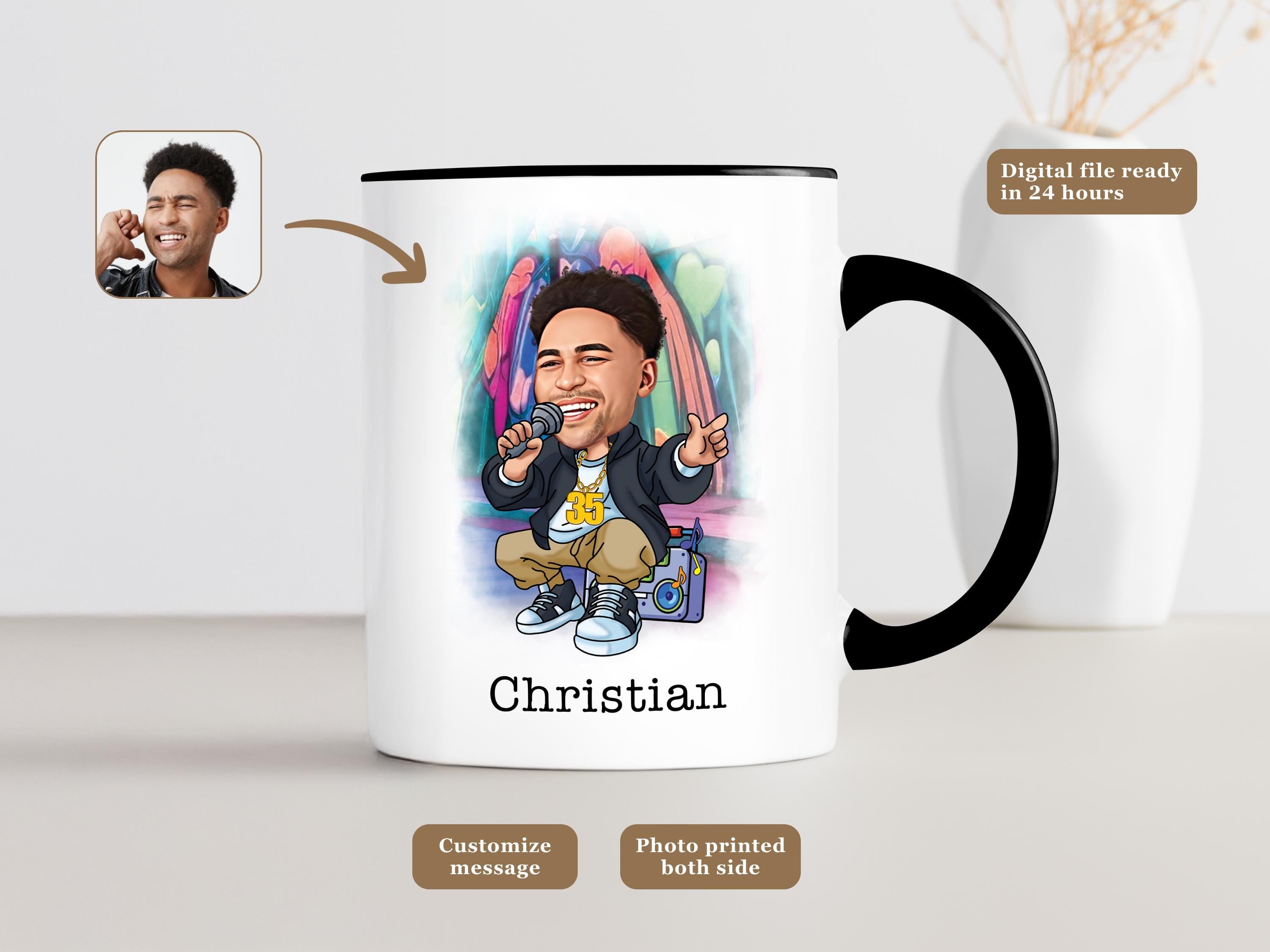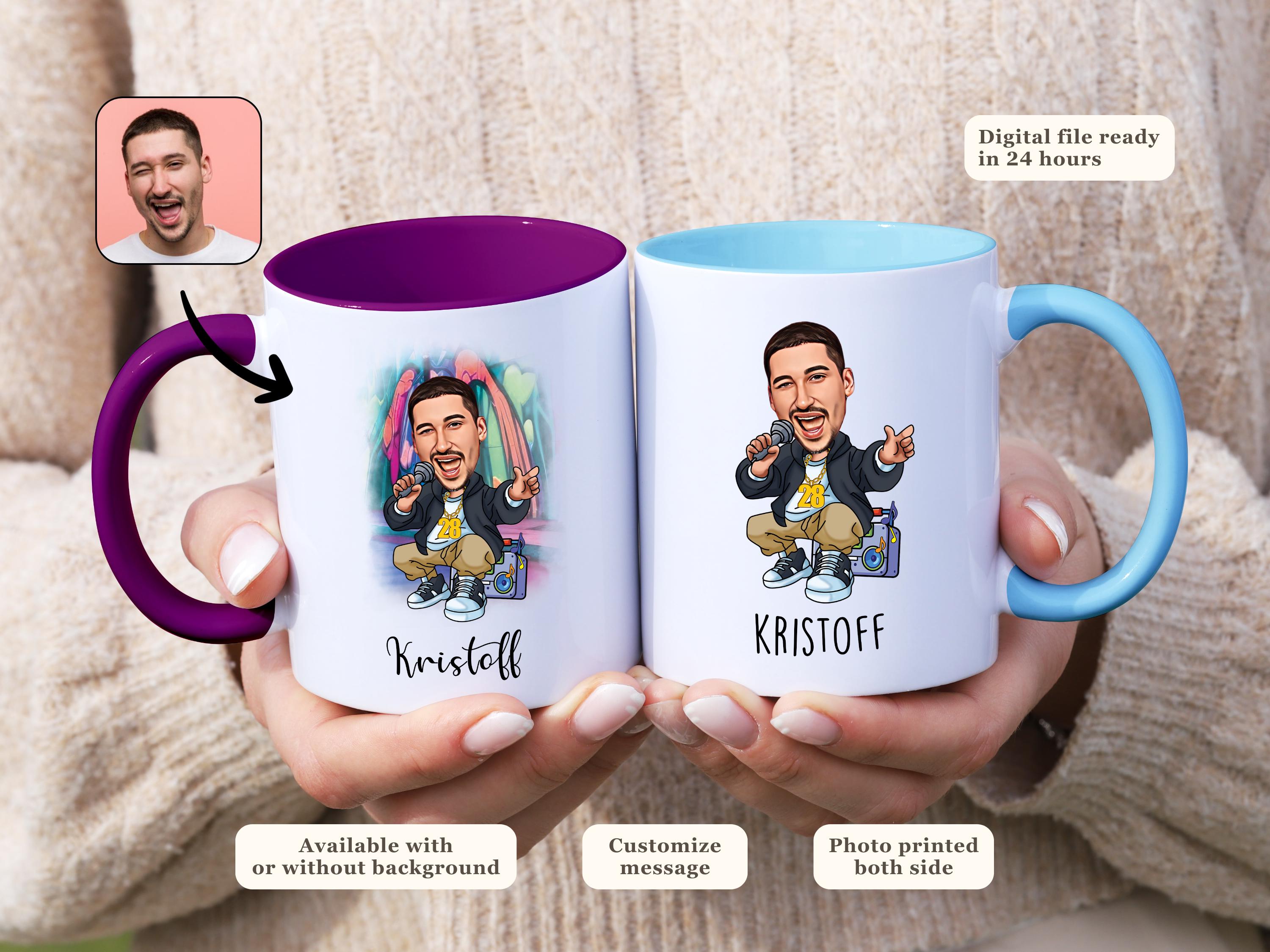 Turn yourself or a friend into a custom hip hop or rapper caricature on a stylish mug! From breakdancers to mic-dropping rappers, this personalized portrait mug is perfect for hip hop lovers.