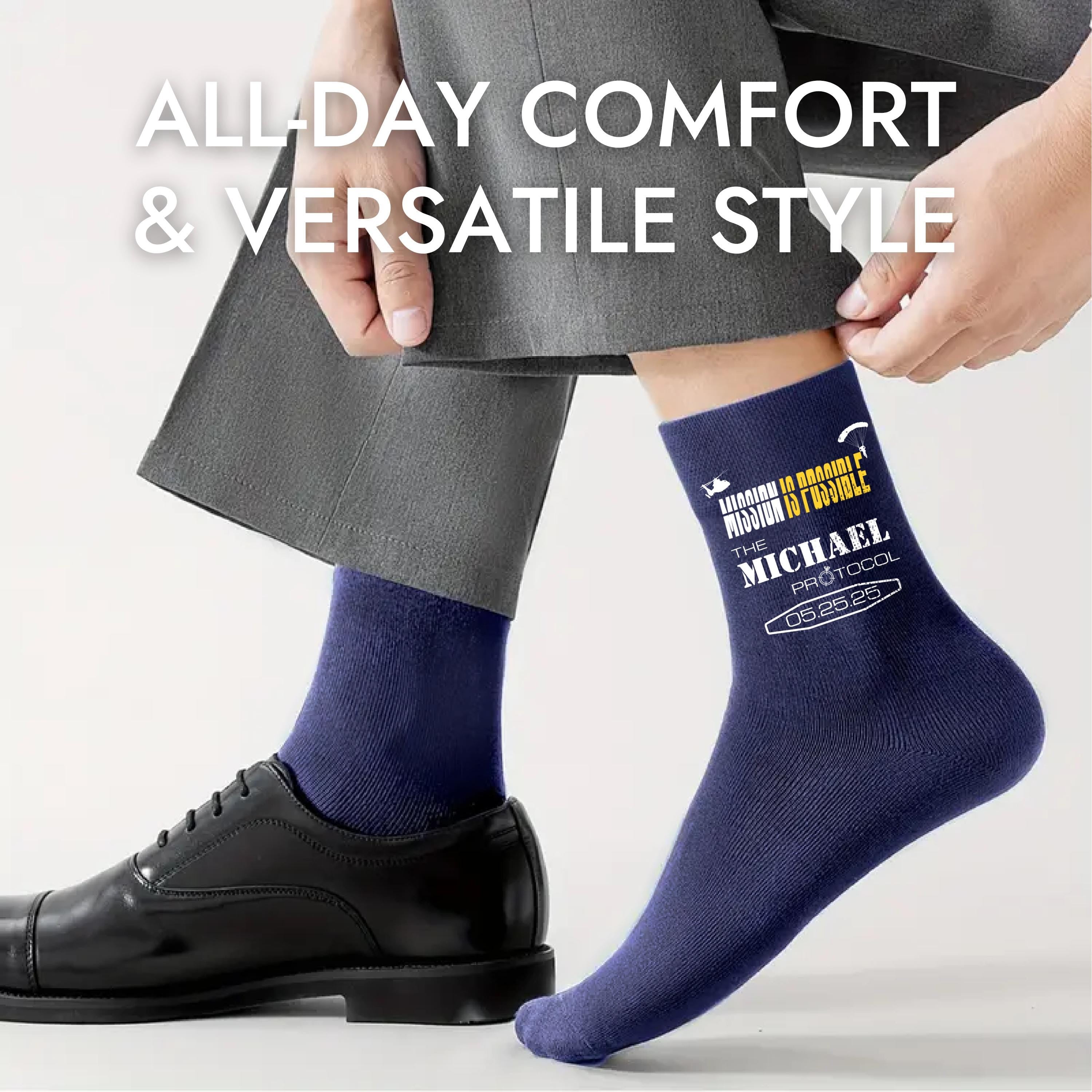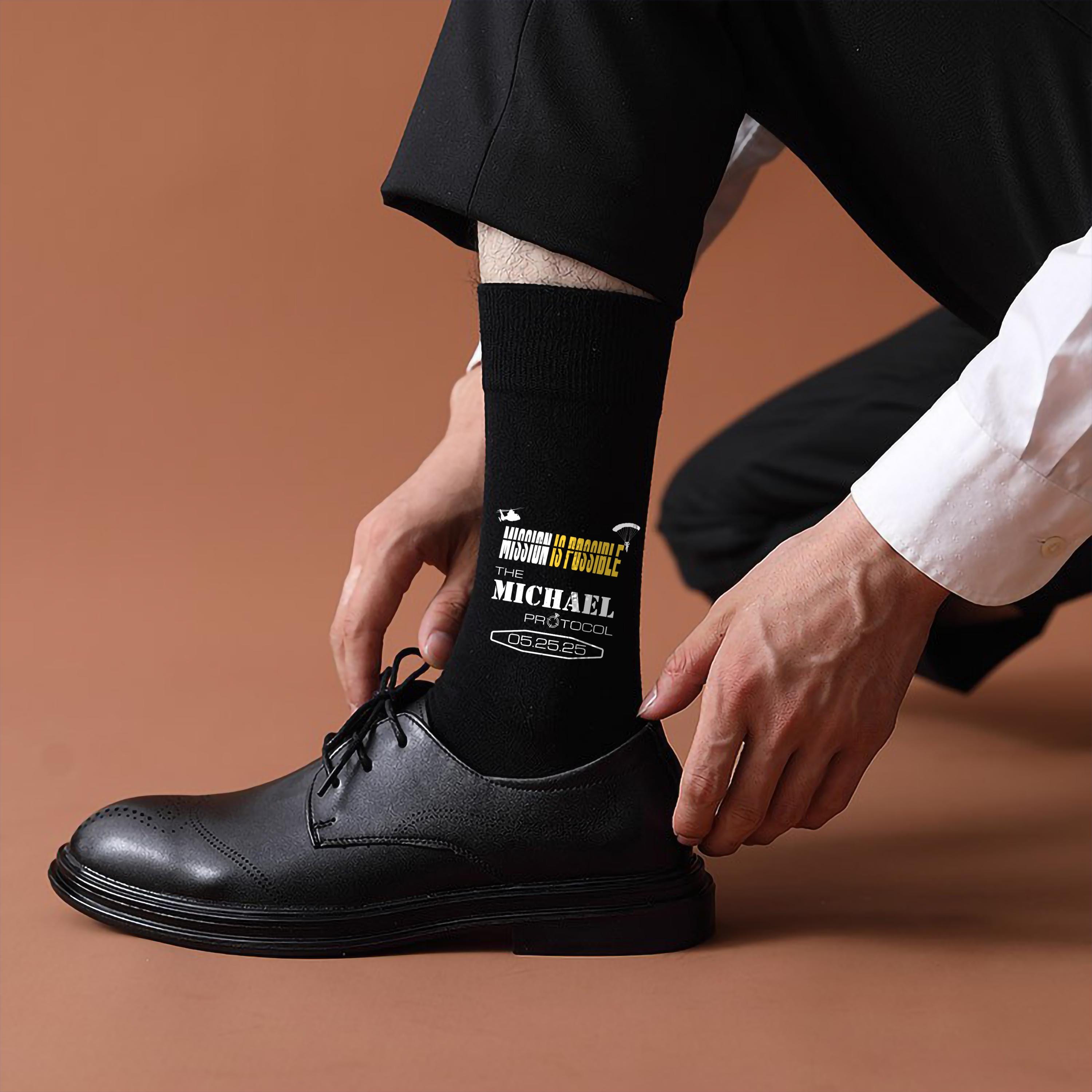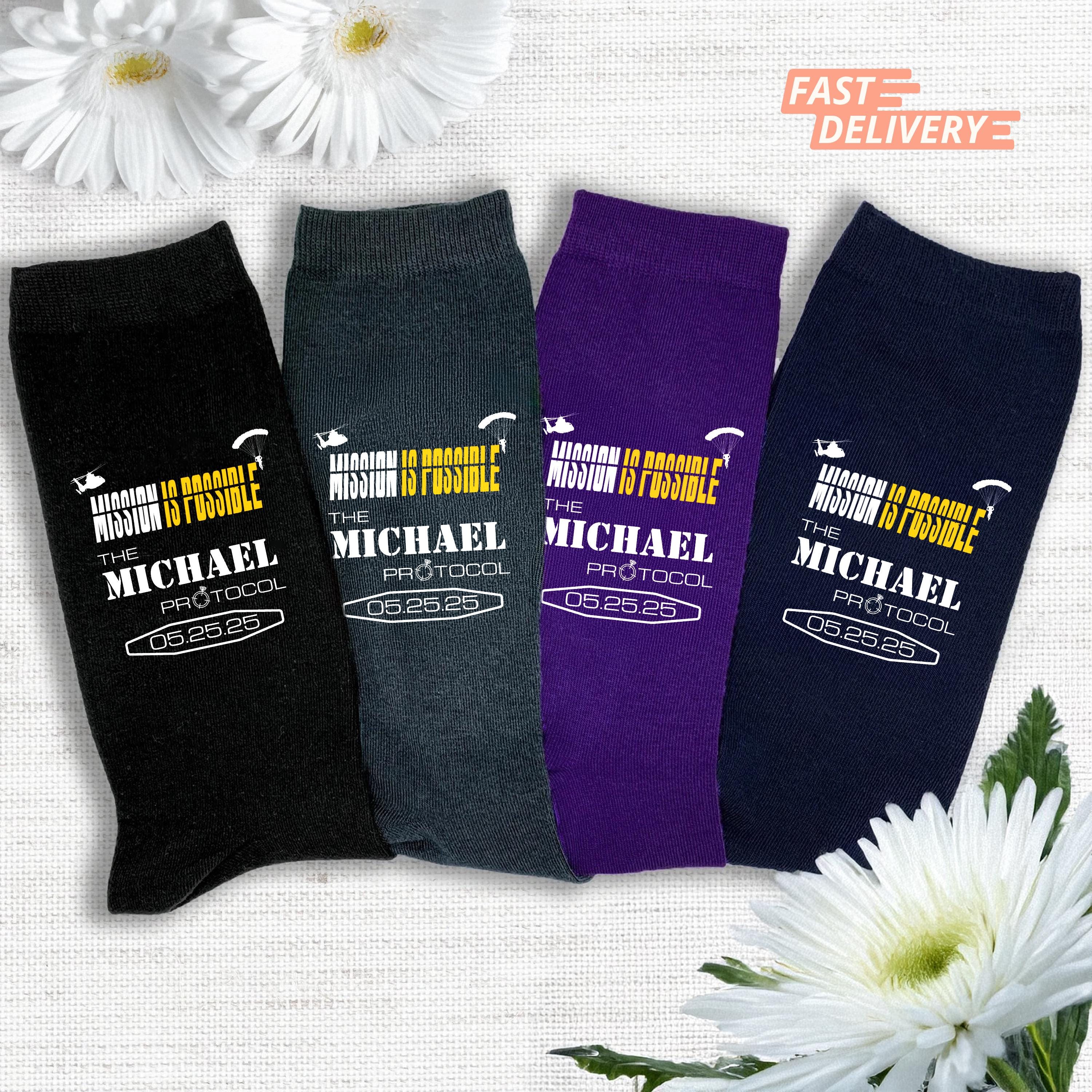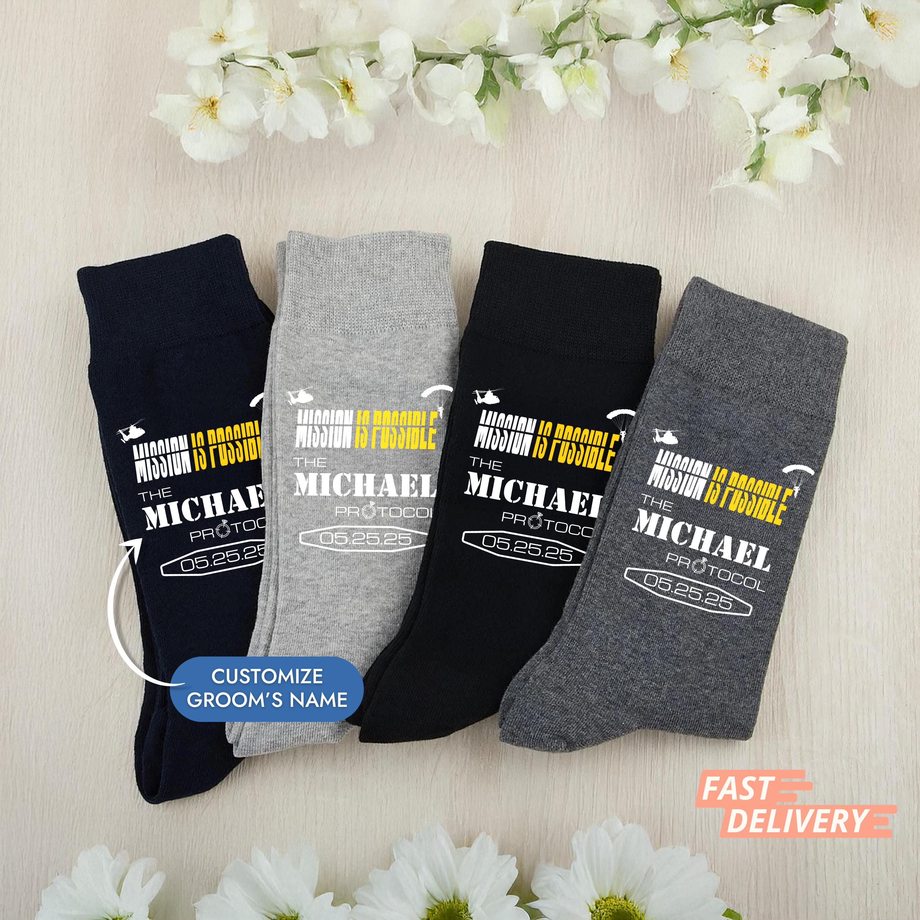 Your wedding day is your mission and it's not impossible to make it epic! These Custom Mission Impossible Wedding Socks are the perfect gift for the groom and groomsmen. Material: ✅ High-quality custom socks in your chosen color. ✅ A personalized design printed with care.