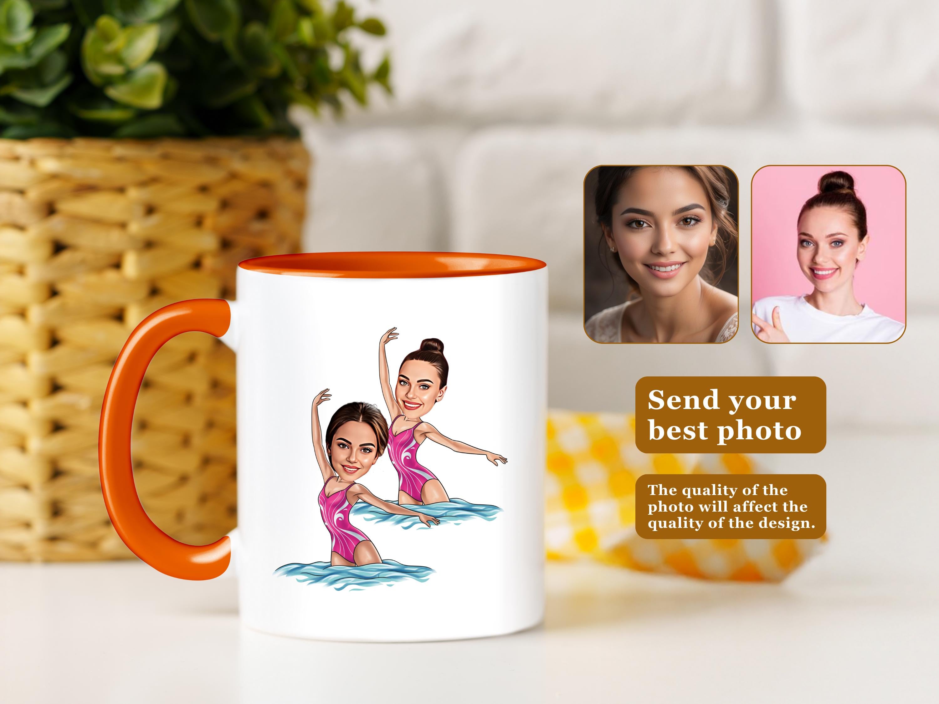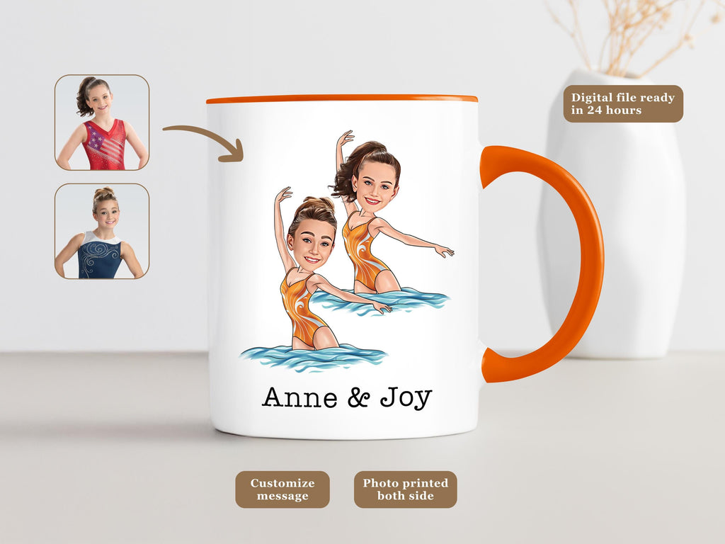Celebrate your love for synchronized swimming with this unique custom mug! Whether you're a swimmer, coach, or fan, this mug features a personalized cartoon portrait of a synchronized swimmer, making it a perfect gift or keepsake.