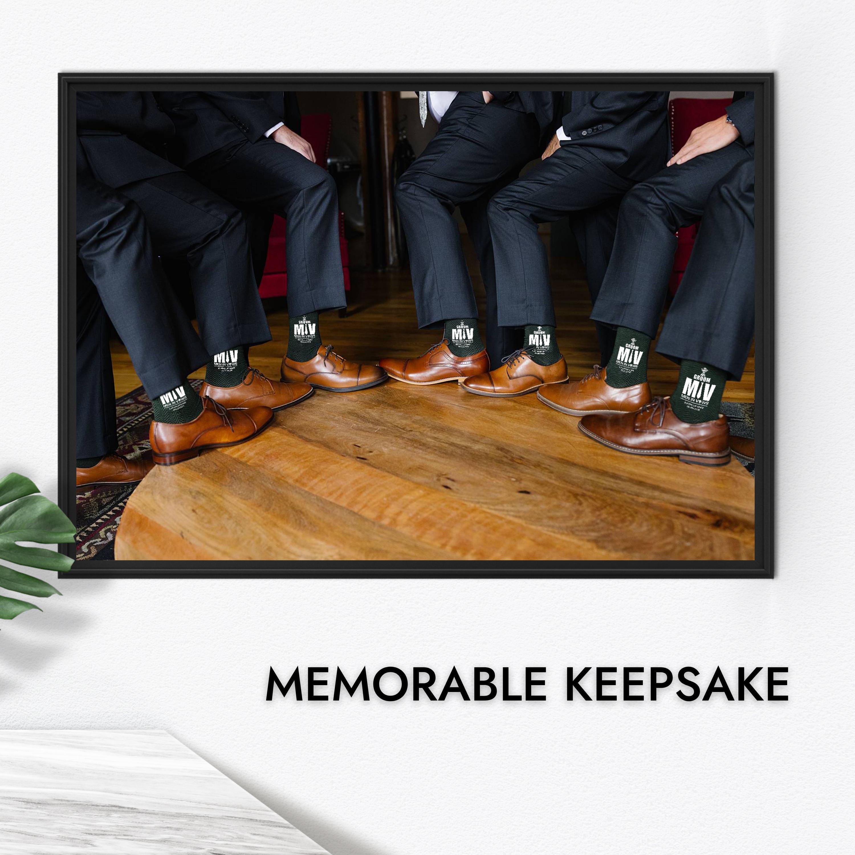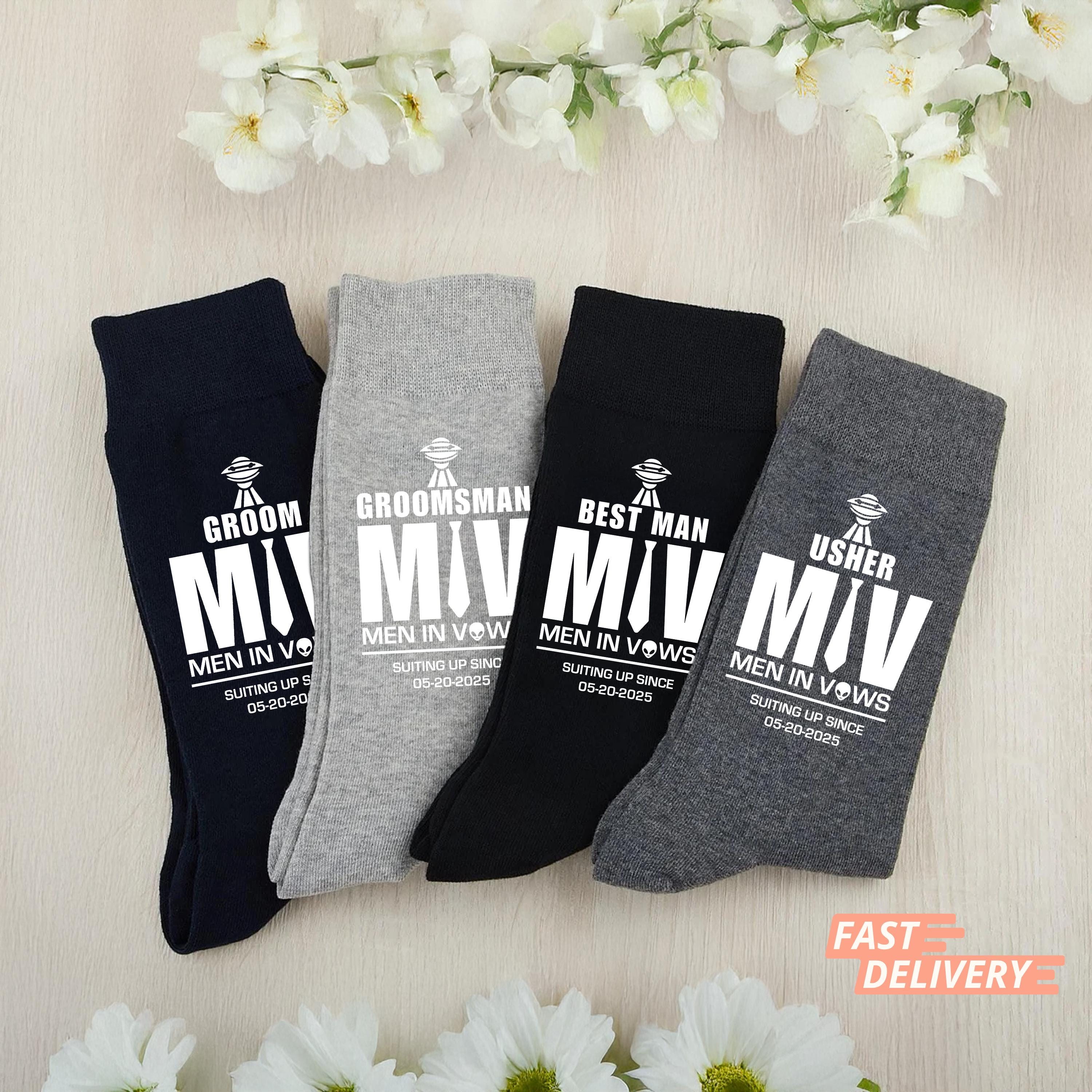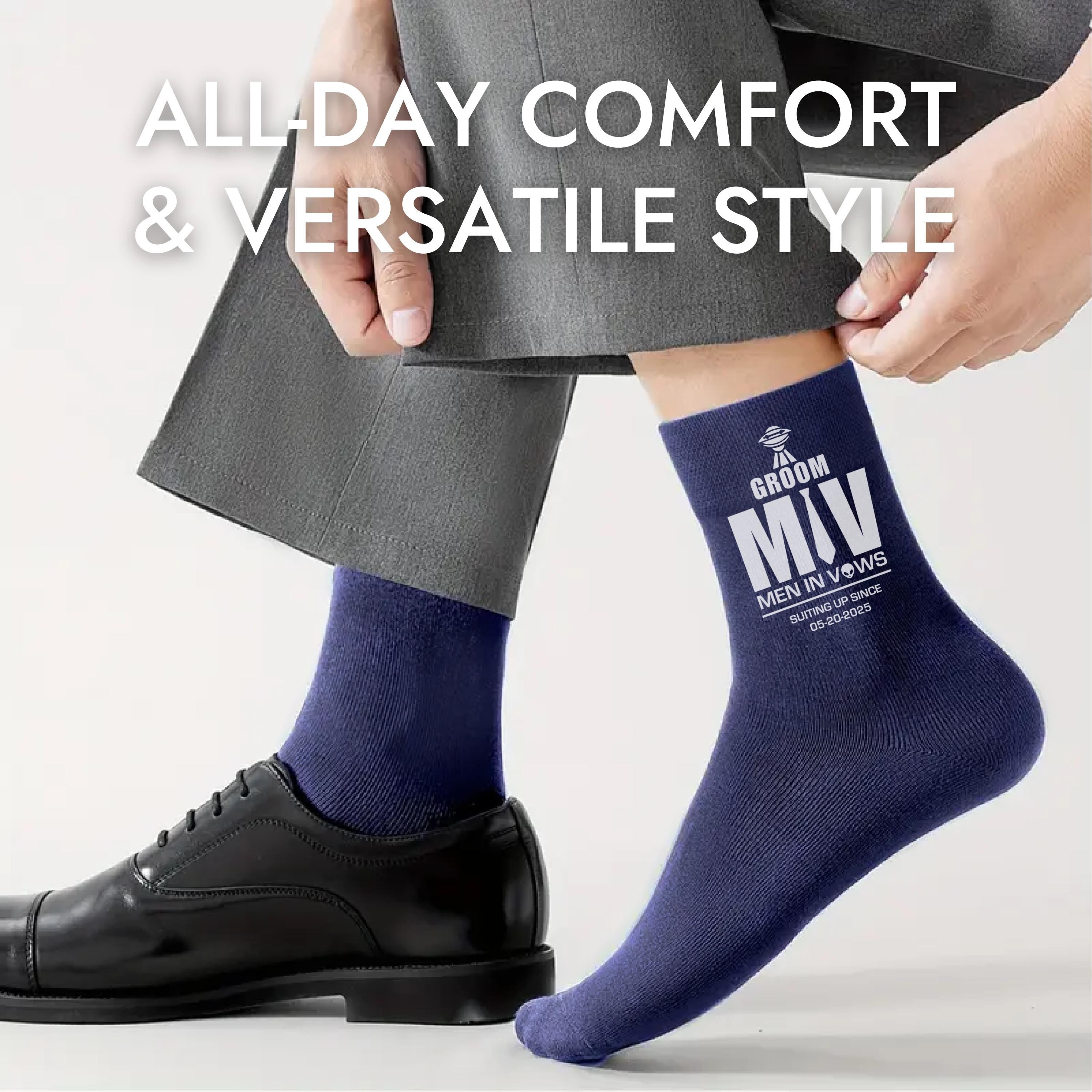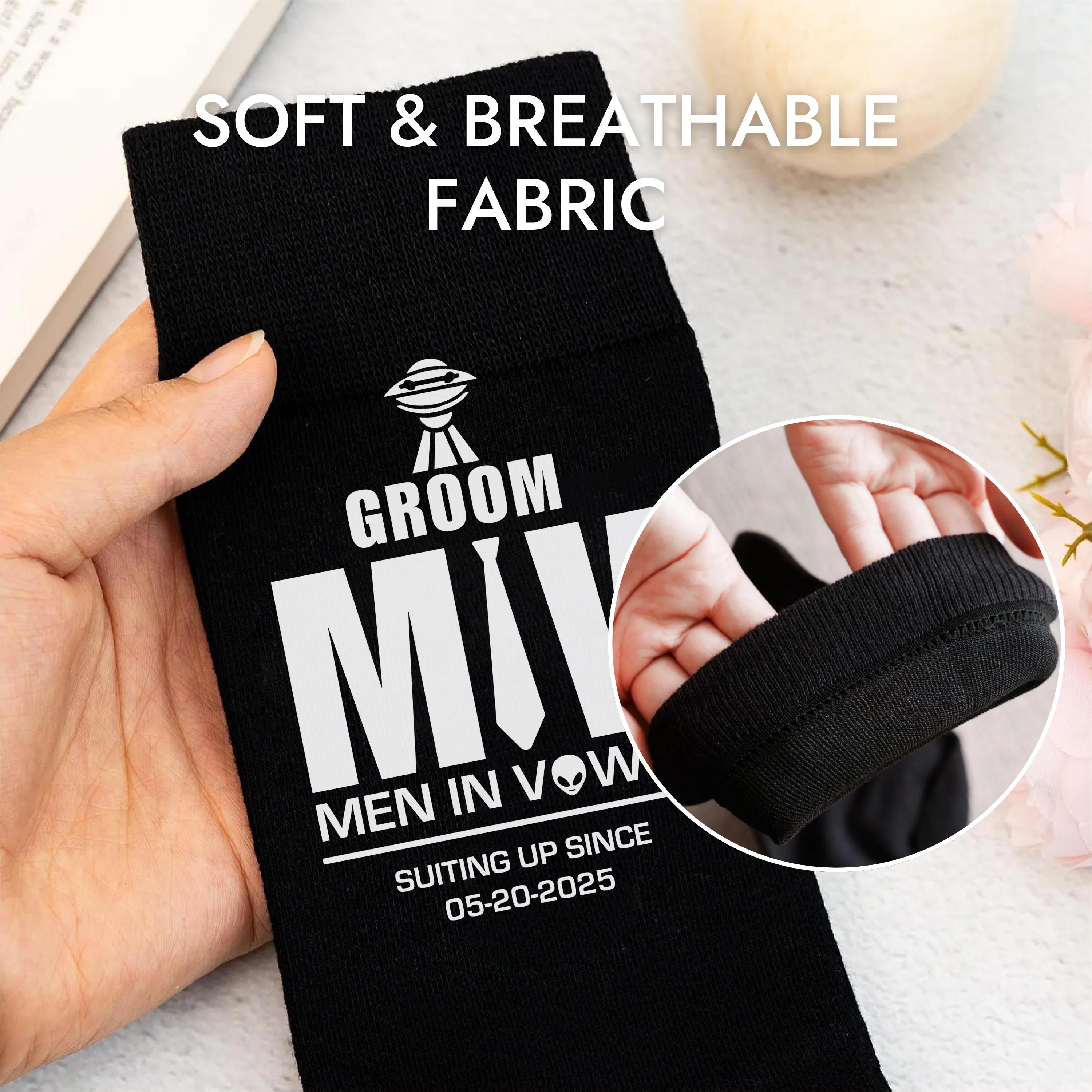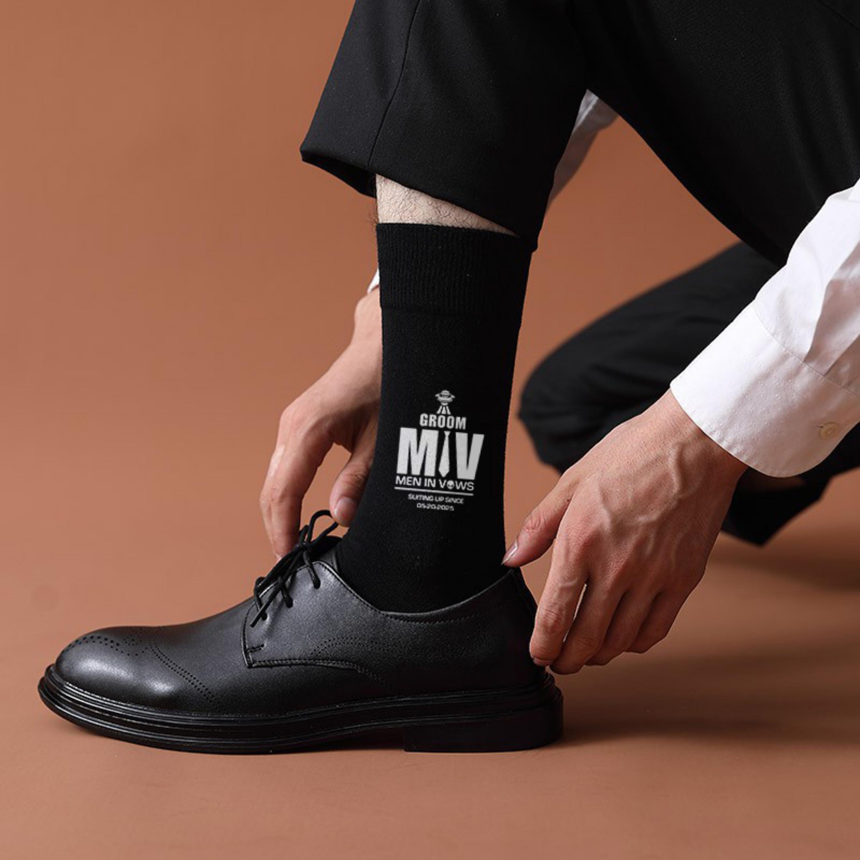 Get your groom and wedding party suited up in style with our Men in Vows custom wedding socks! A fun and personalized nod to the iconic MIB look! These socks are the perfect way to add a touch of humor and character to your big day while keeping it classy. Material: ✅ High-quality custom socks in your chosen color. ✅ A personalized design printed with care.