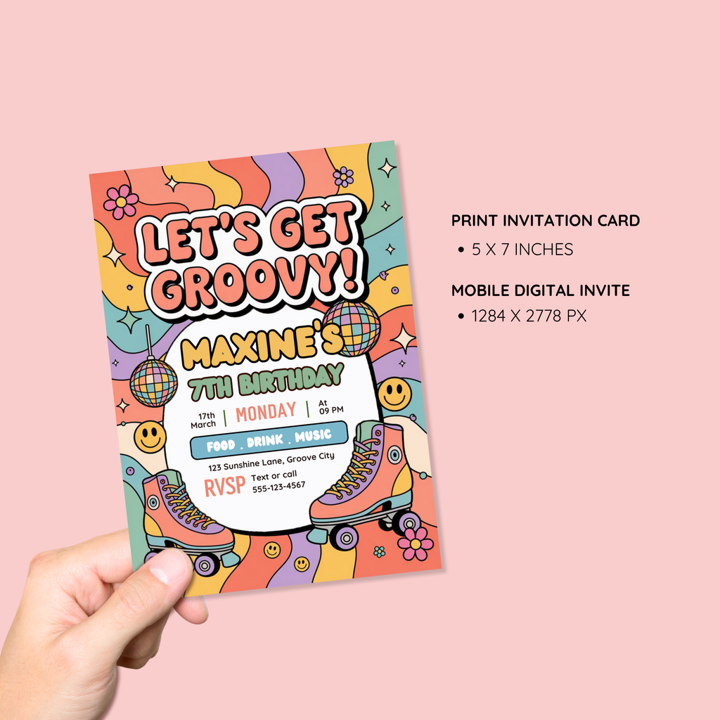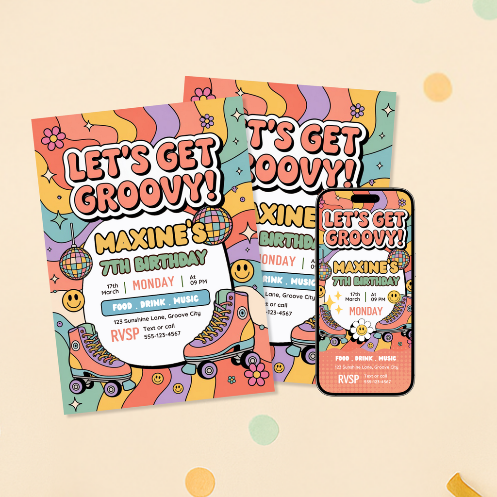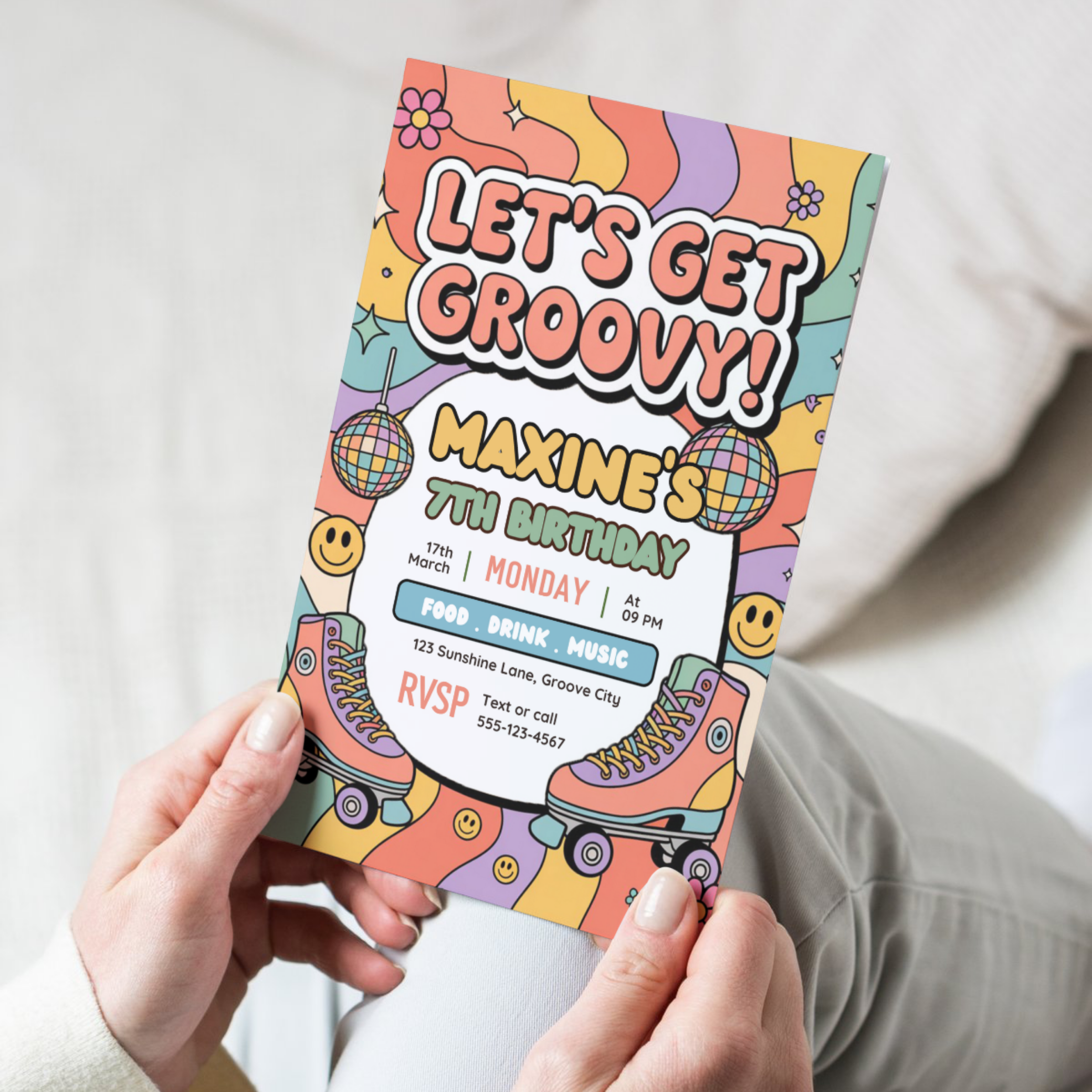 Customize with your party details and let's keep it groovy! ✌️🌸✨