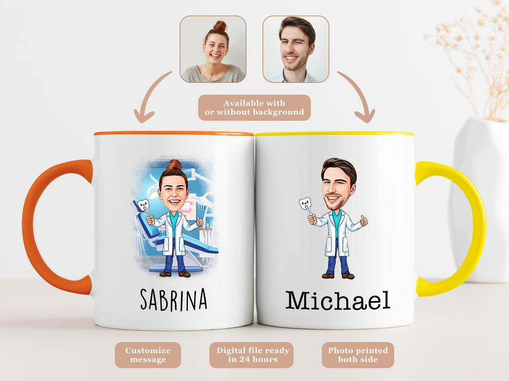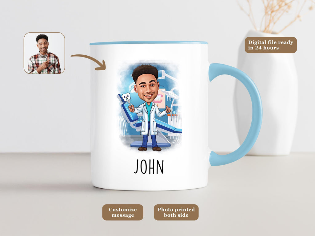 Brighten a dentists day with a custom caricature mug! This personalized design captures their passion for perfect smiles in a fun and unique way.