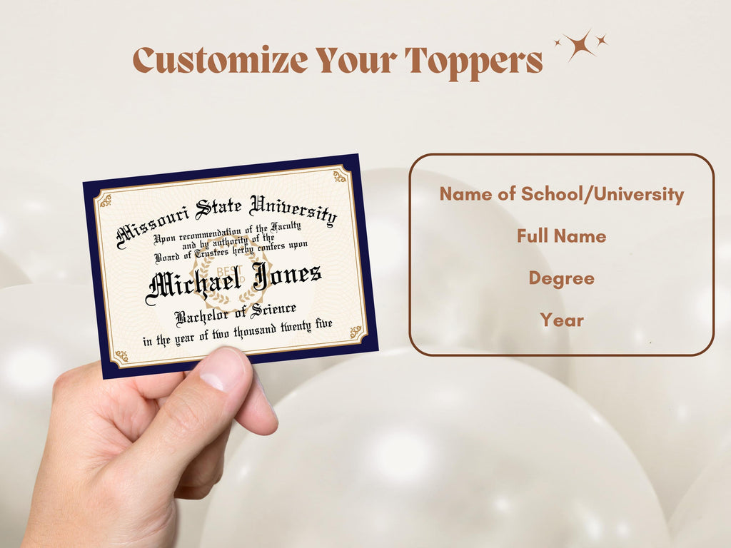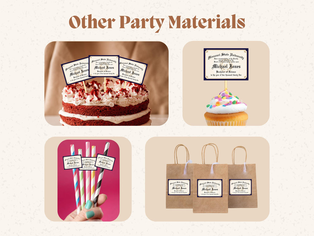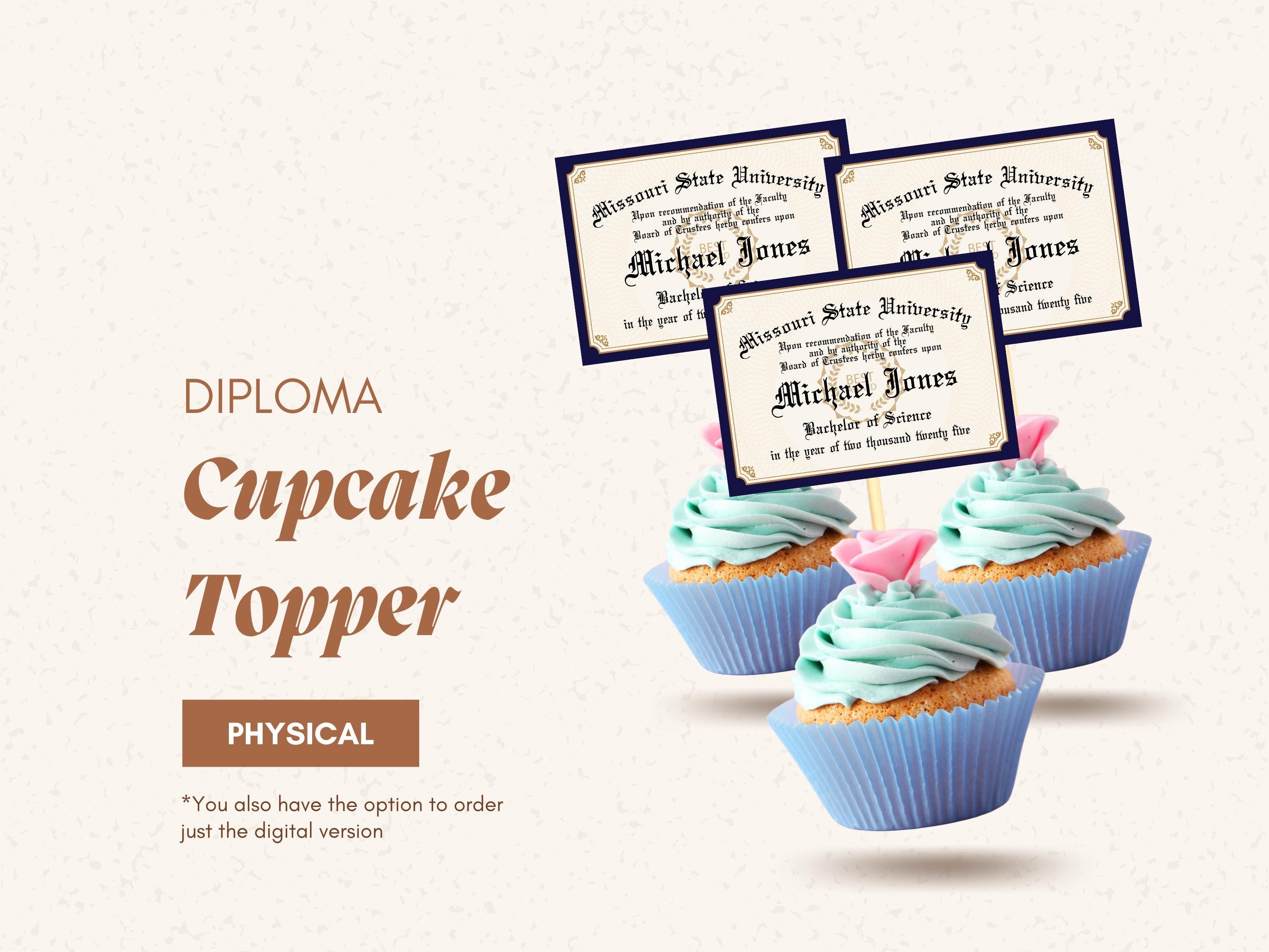 Celebrate your graduates achievement with these charming mini diploma cupcake toppers! Perfect for adding a personalized touch to graduation parties, these toppers resemble tiny diplomas and make any treat extra special.