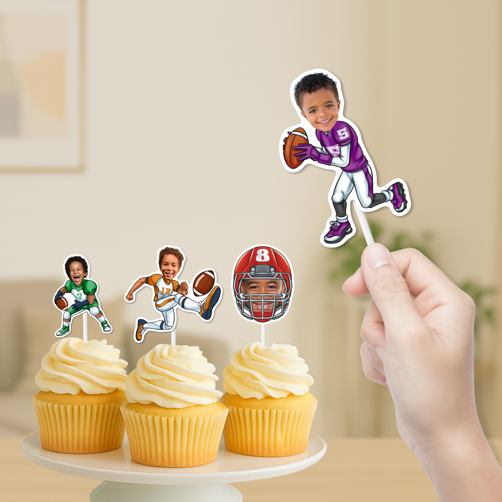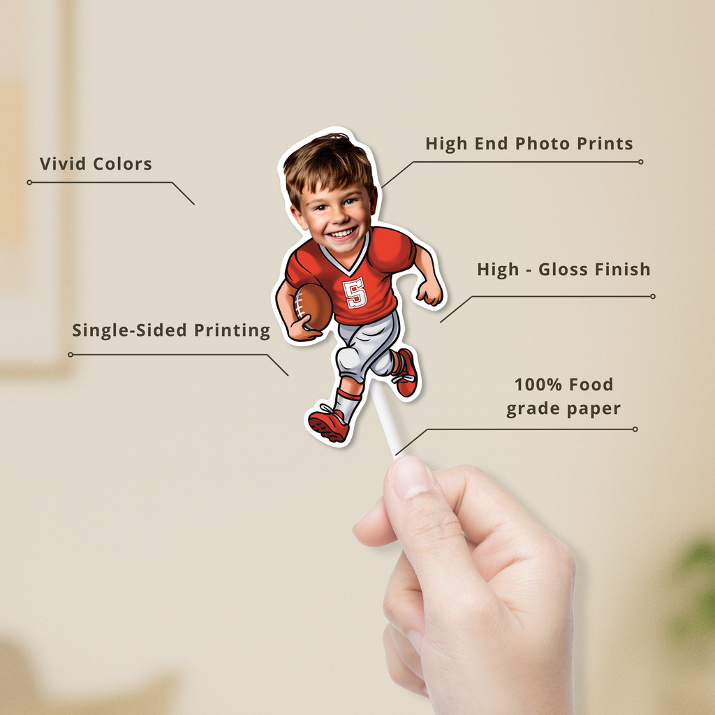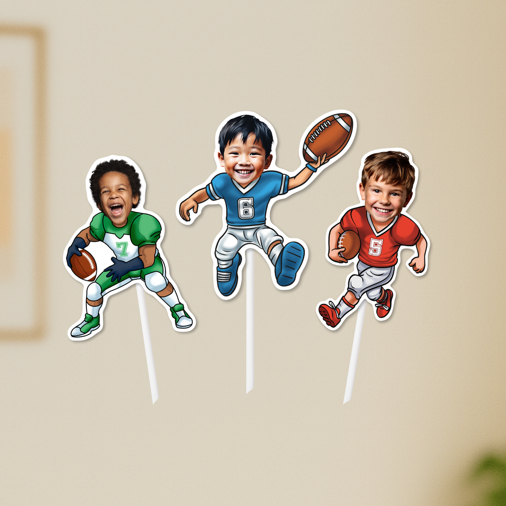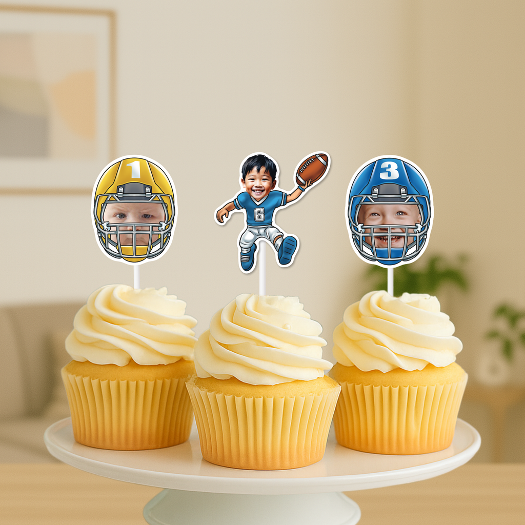 Turn your celebration into a touchdown with our personalized player cupcake toppers that can also be used as stickers! Put your child's face front and center on these winning play cupcakes. Get ready for a celebration that's as fun as scoring the winning touchdown!