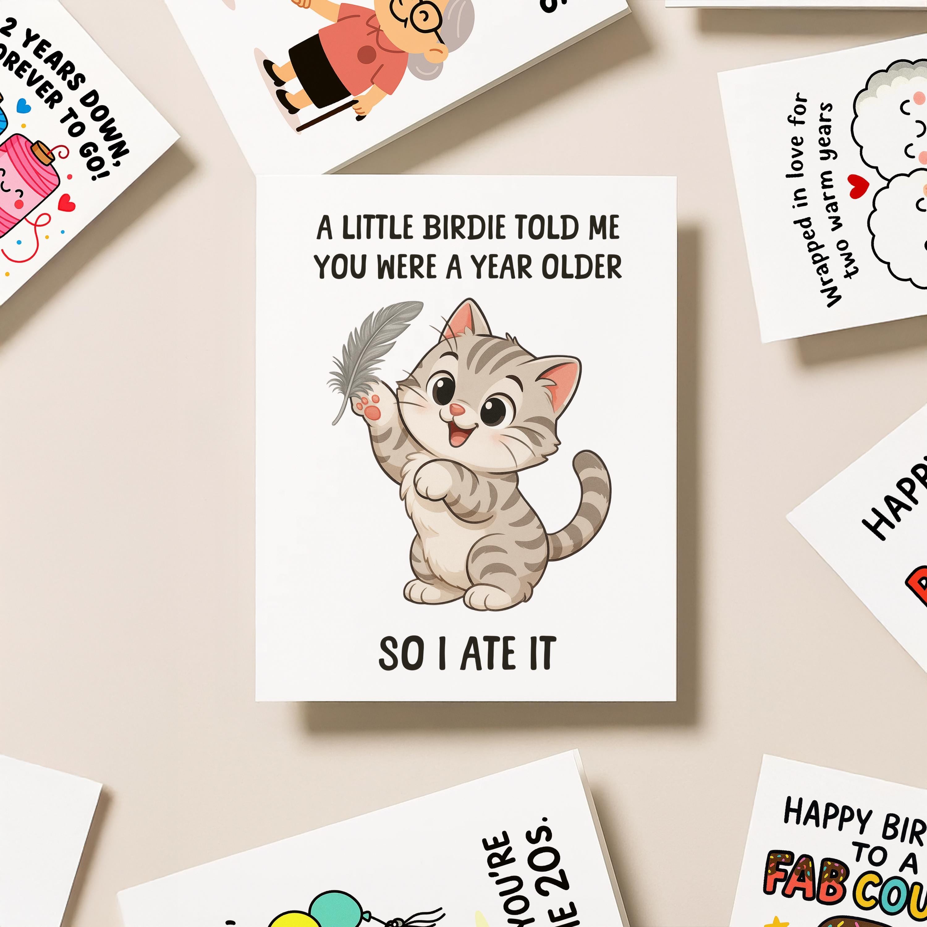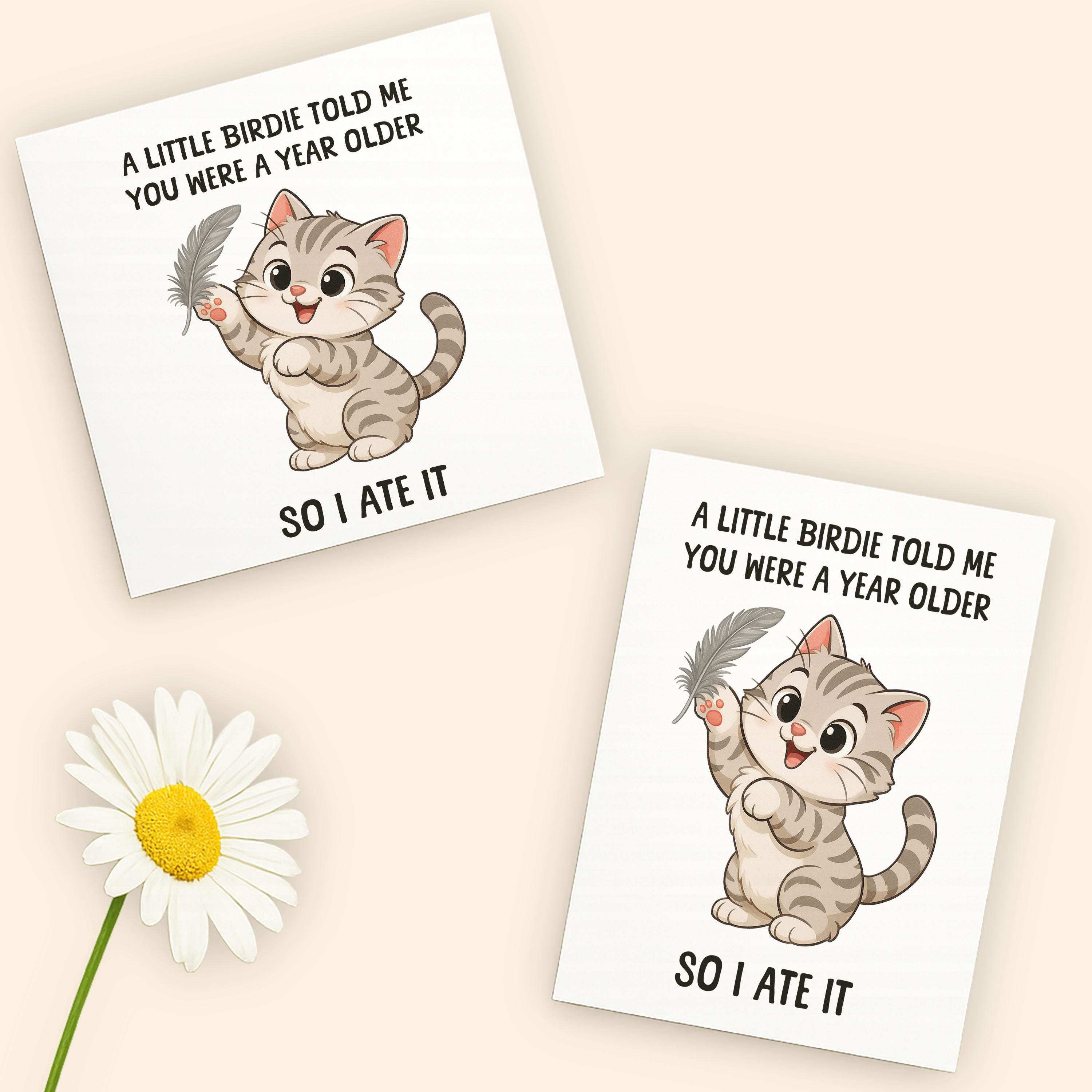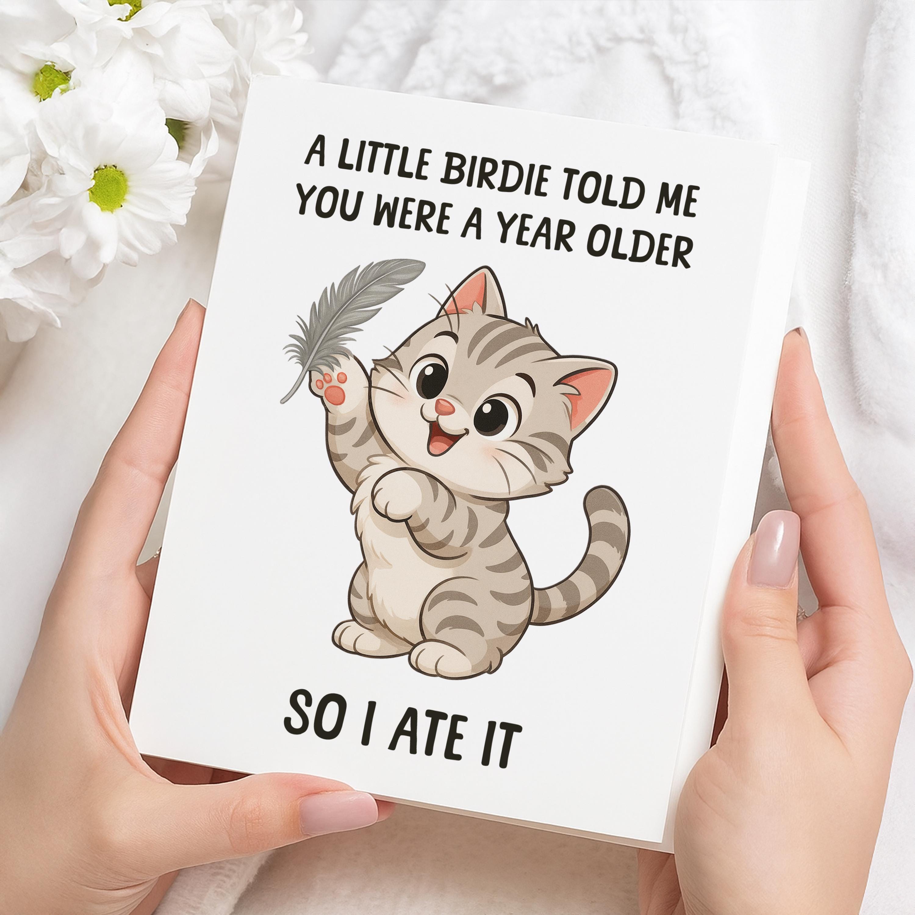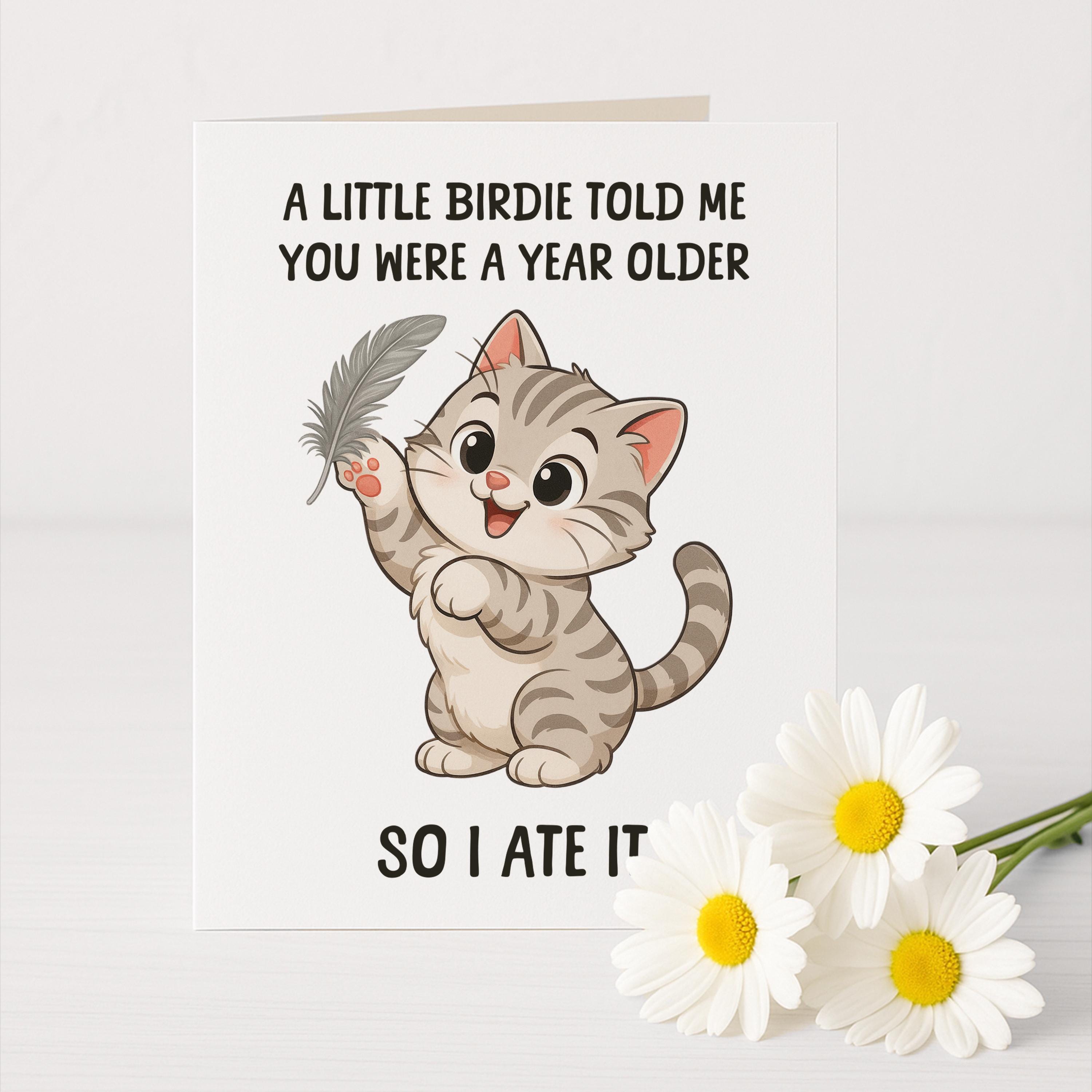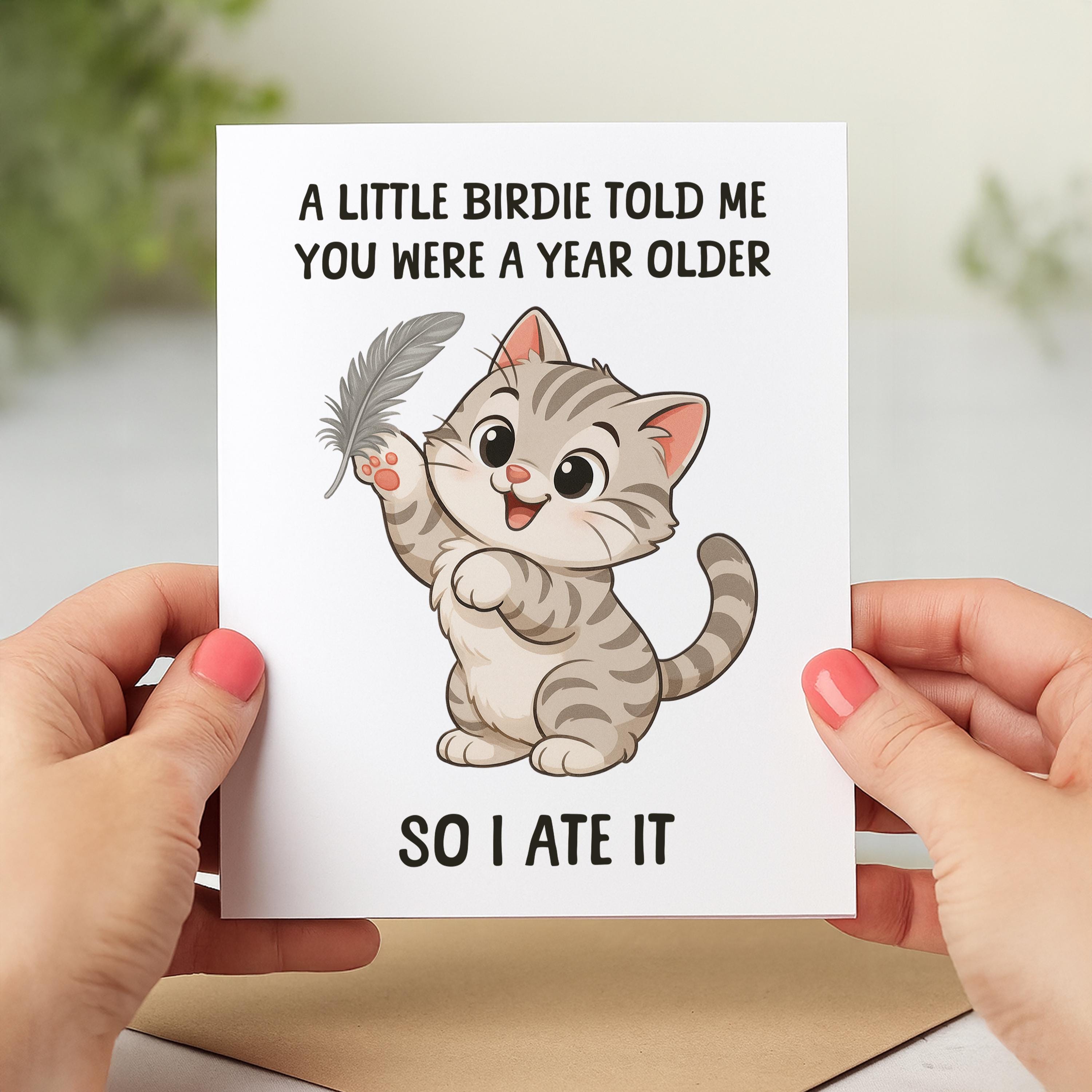 This funny cat birthday card is designed to bring a smile to any pet parents face. Material: A2 self-seal envelopes Heavyweight Folded Cardstock 100% acid-free Size: 4.25" x 5.5"