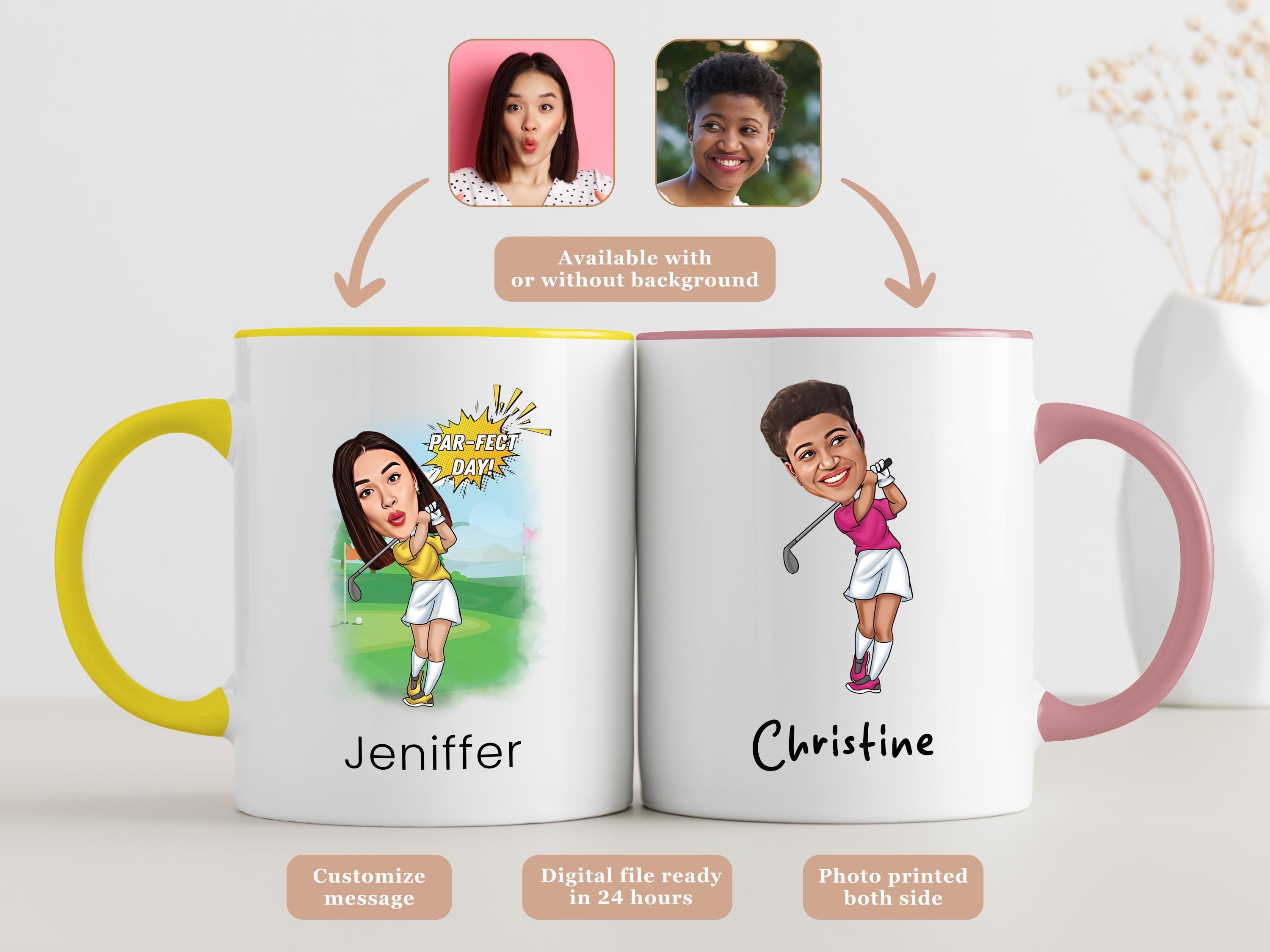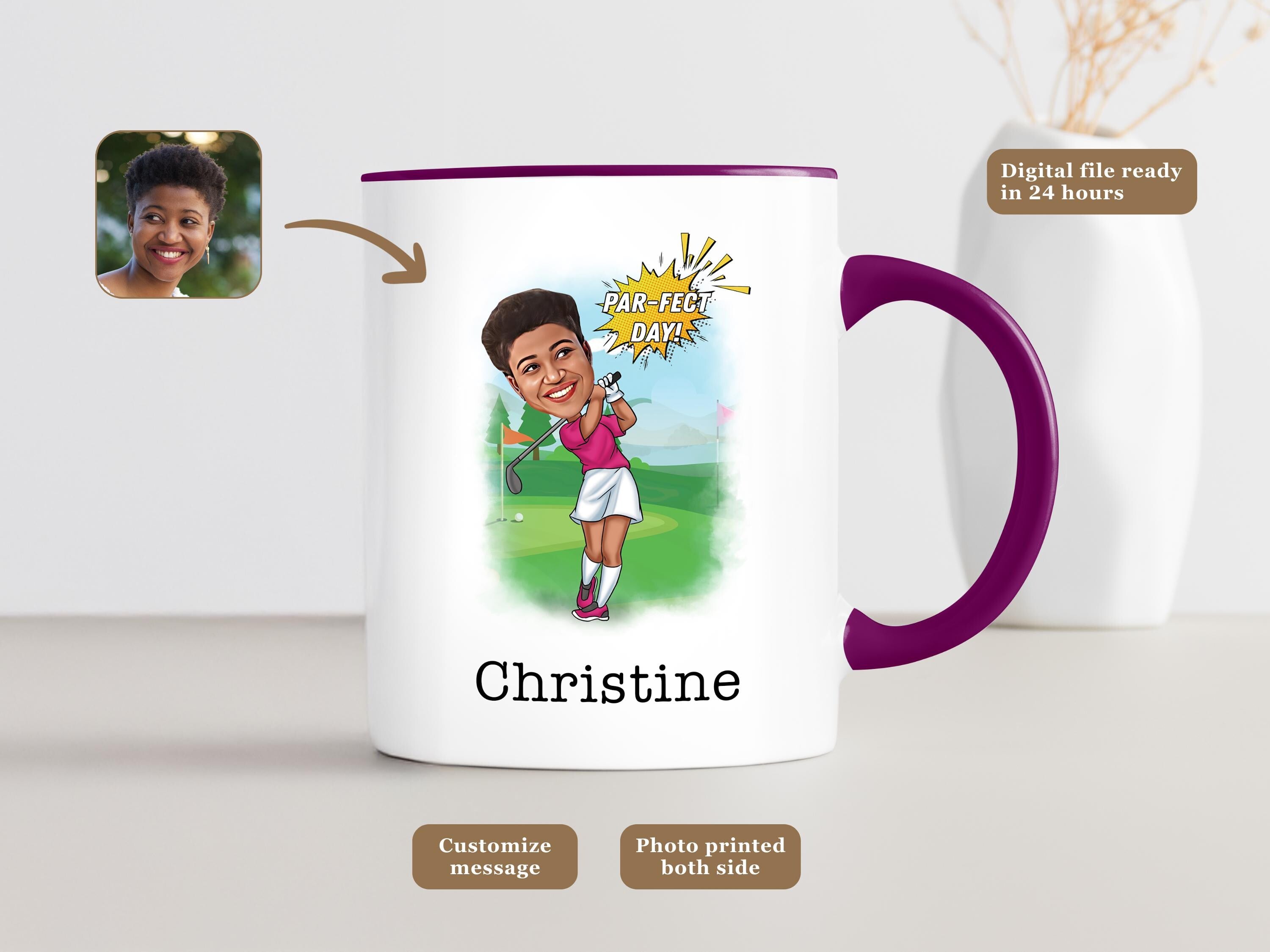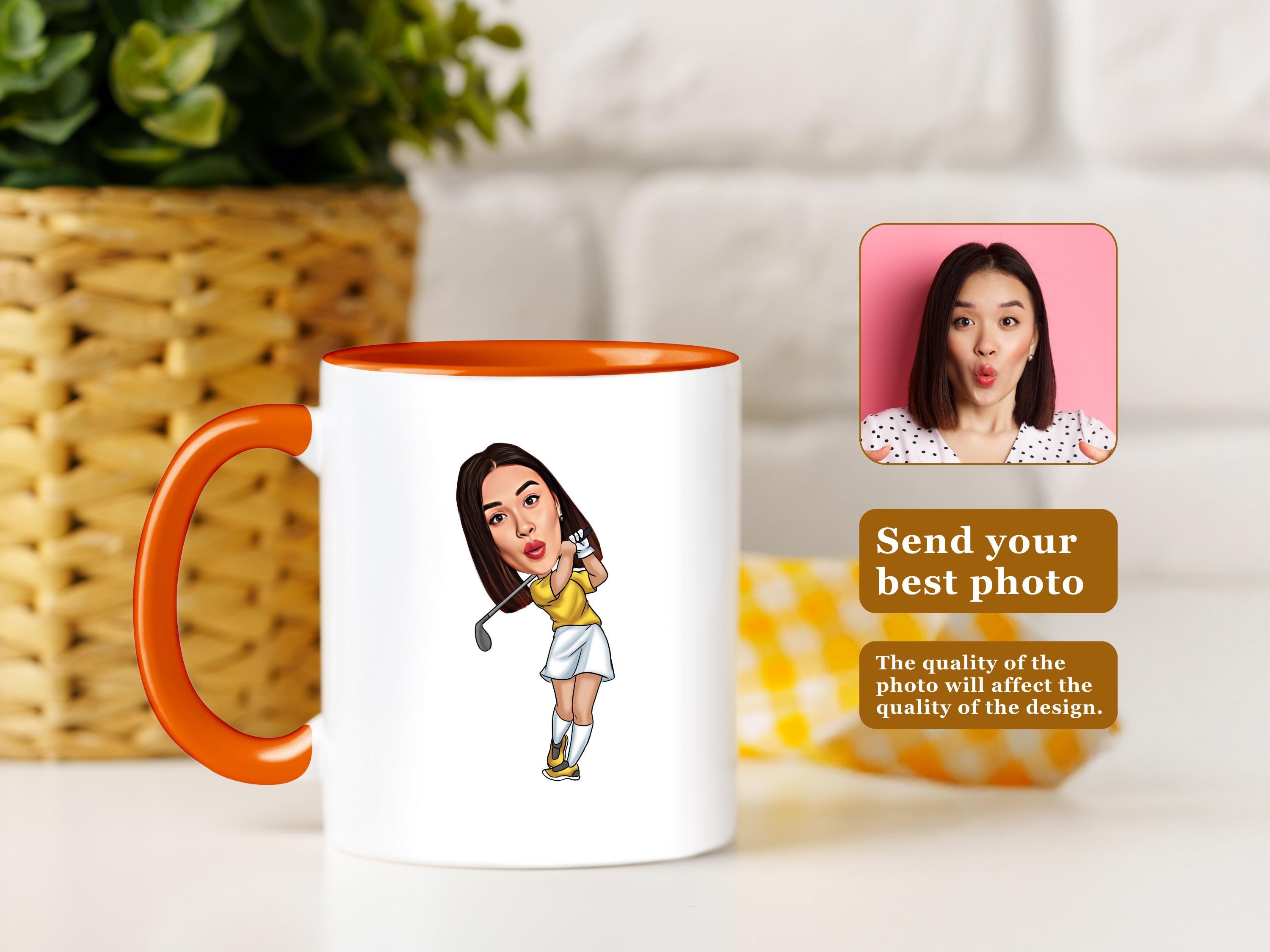 Celebrate her love for the game with a custom caricature mug featuring a female golfer! Whether shes hitting the green or just relaxing after a round, this personalized design makes for a fun and thoughtful gift.
