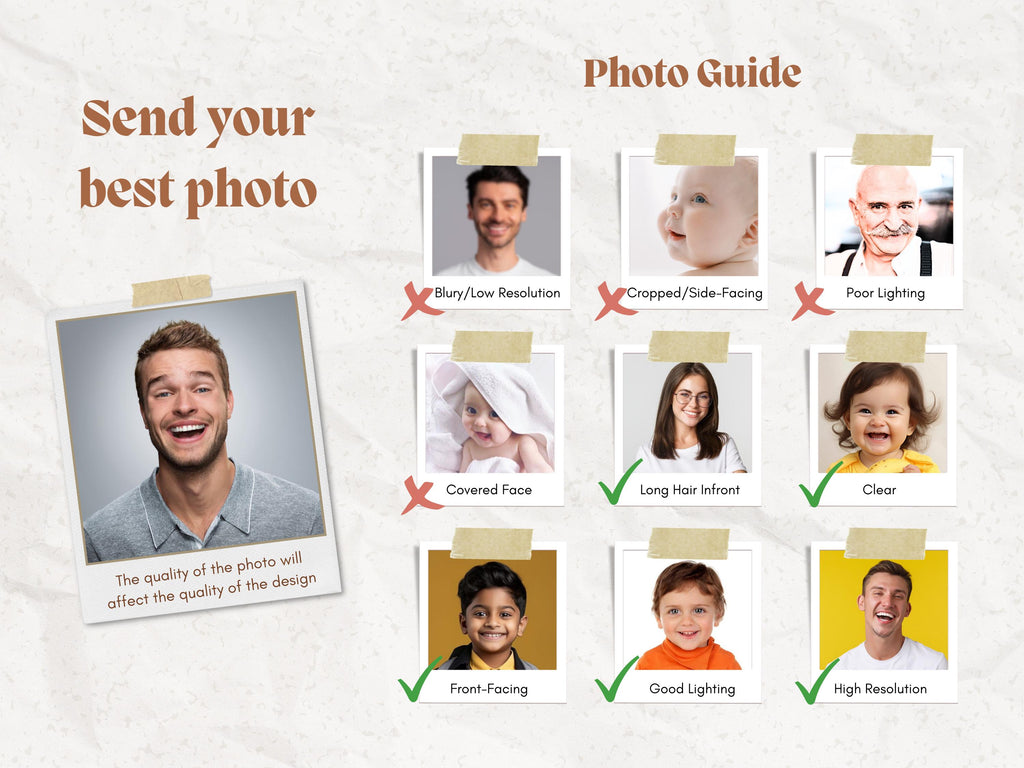 ⚠️ Photo quality directly impacts the final design. For best results, use clear, straight-facing, well-lit images.
