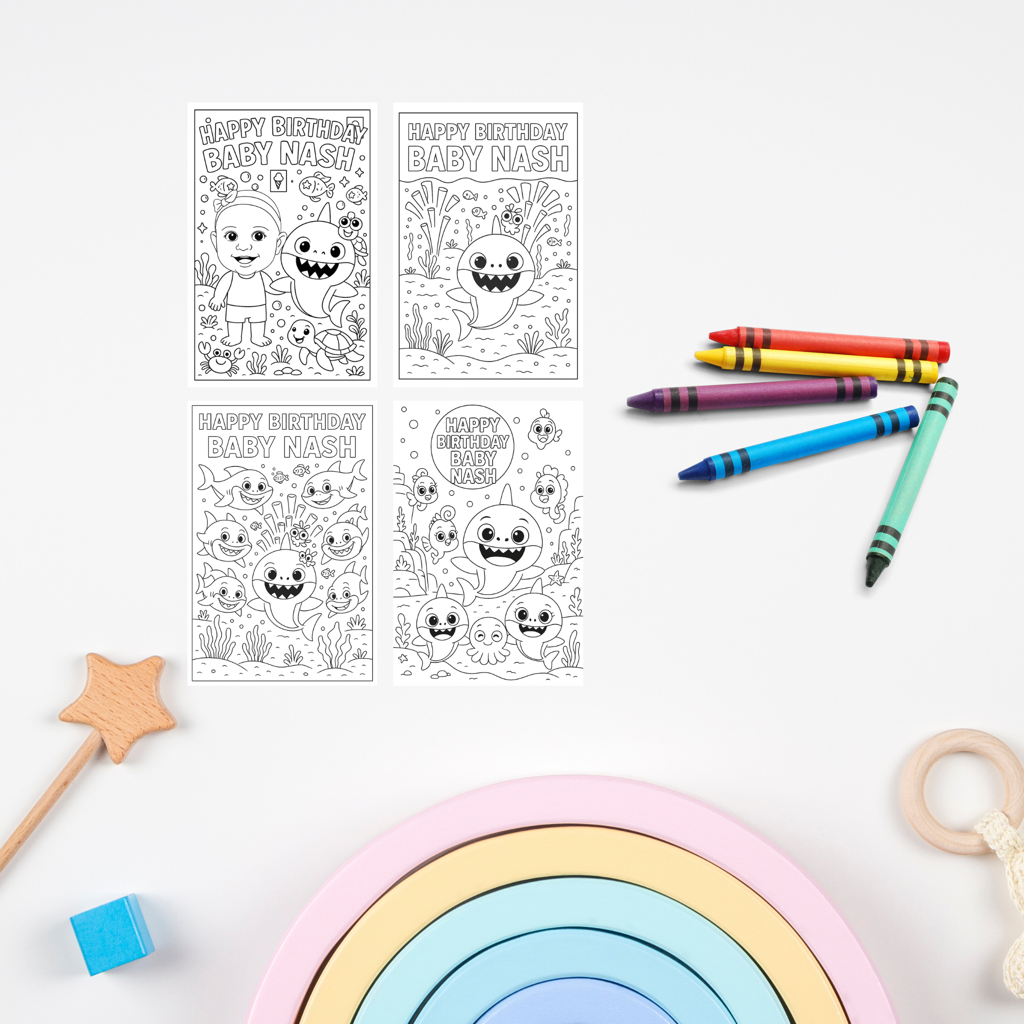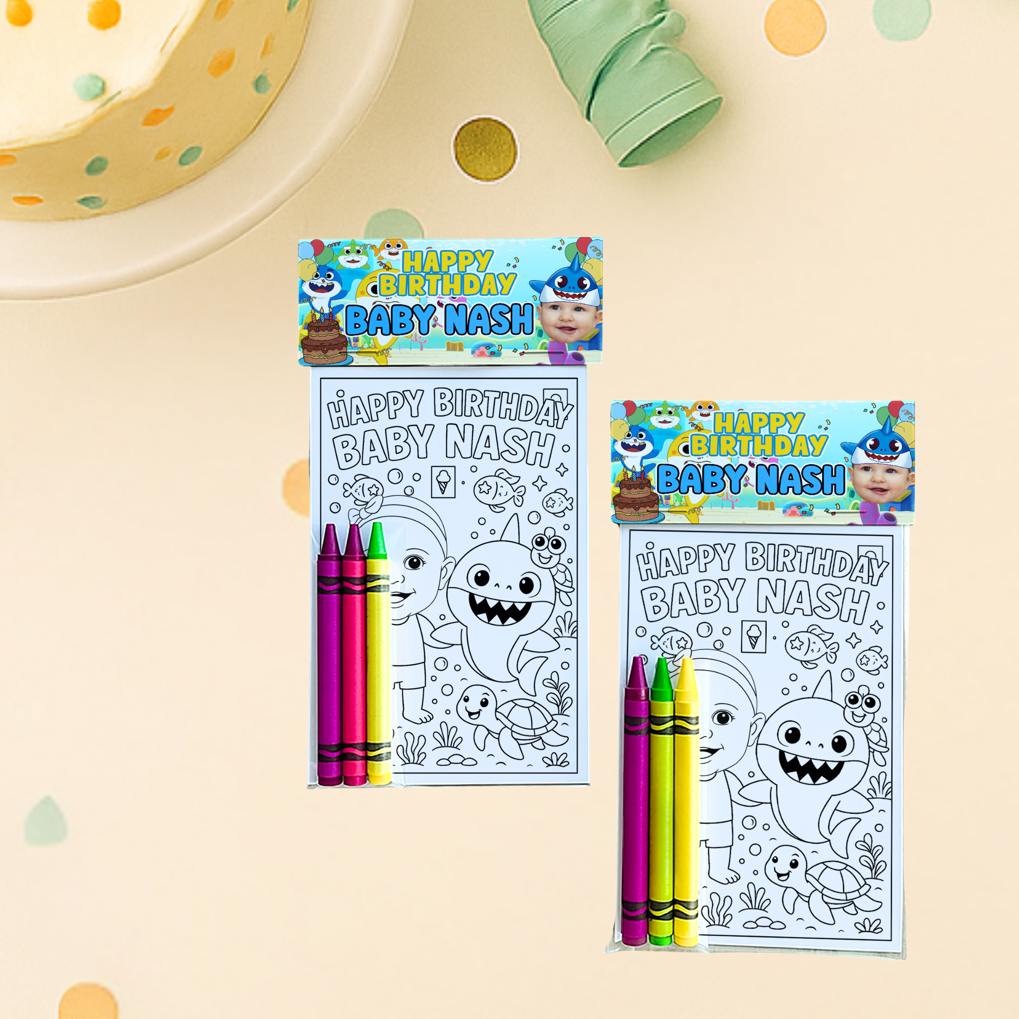 Make a splash at your celebration with these Personalized Baby Shark-Themed Birthday Coloring Pages! Featuring your childs name and photo, these custom coloring packs are perfect as party favors or fun activity booklets for kids.