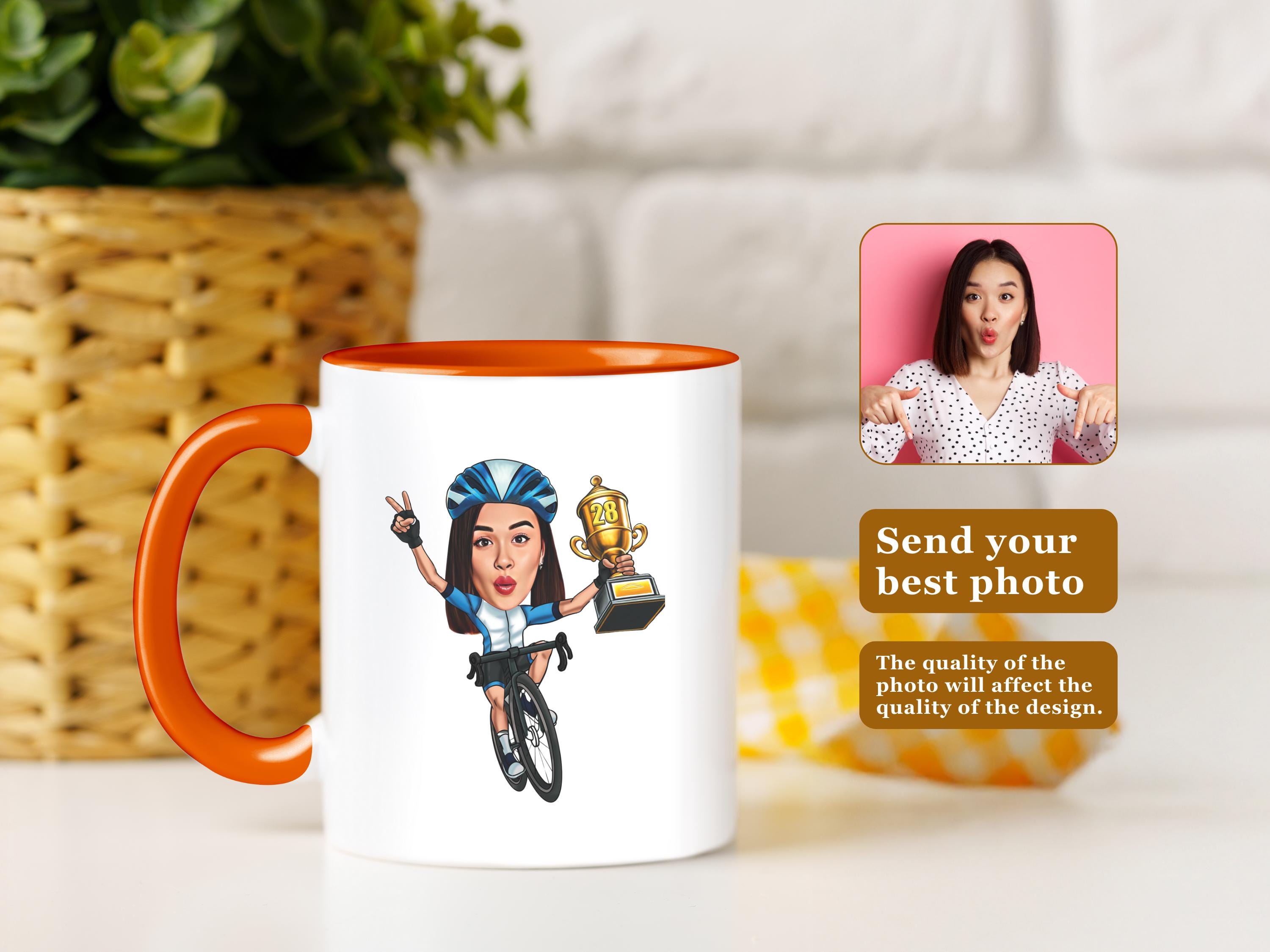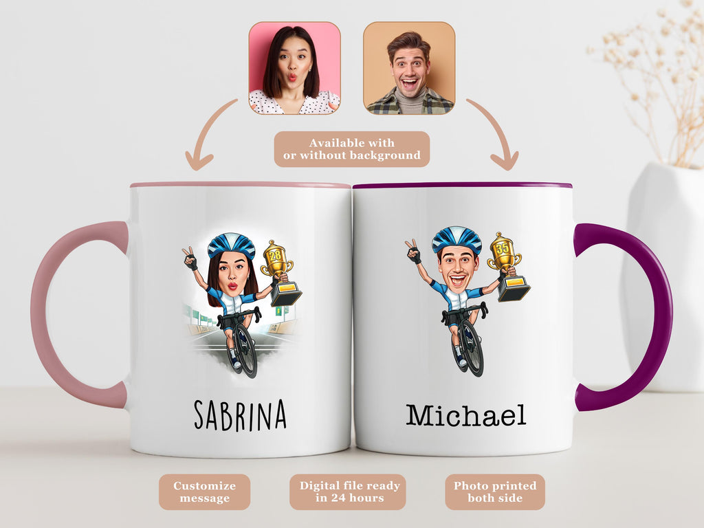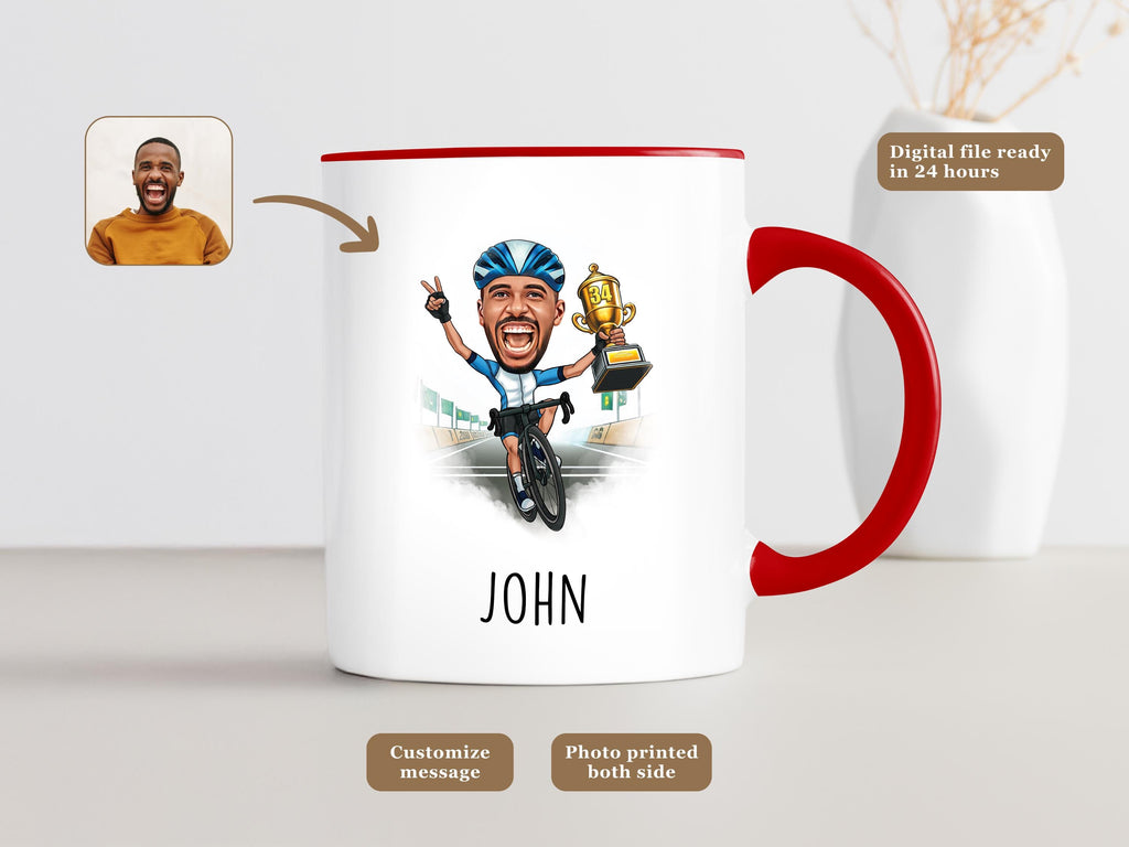 Celebrate your favorite cyclist with a custom caricature mug! This personalized design captures their love for the ride in a fun and unique way.