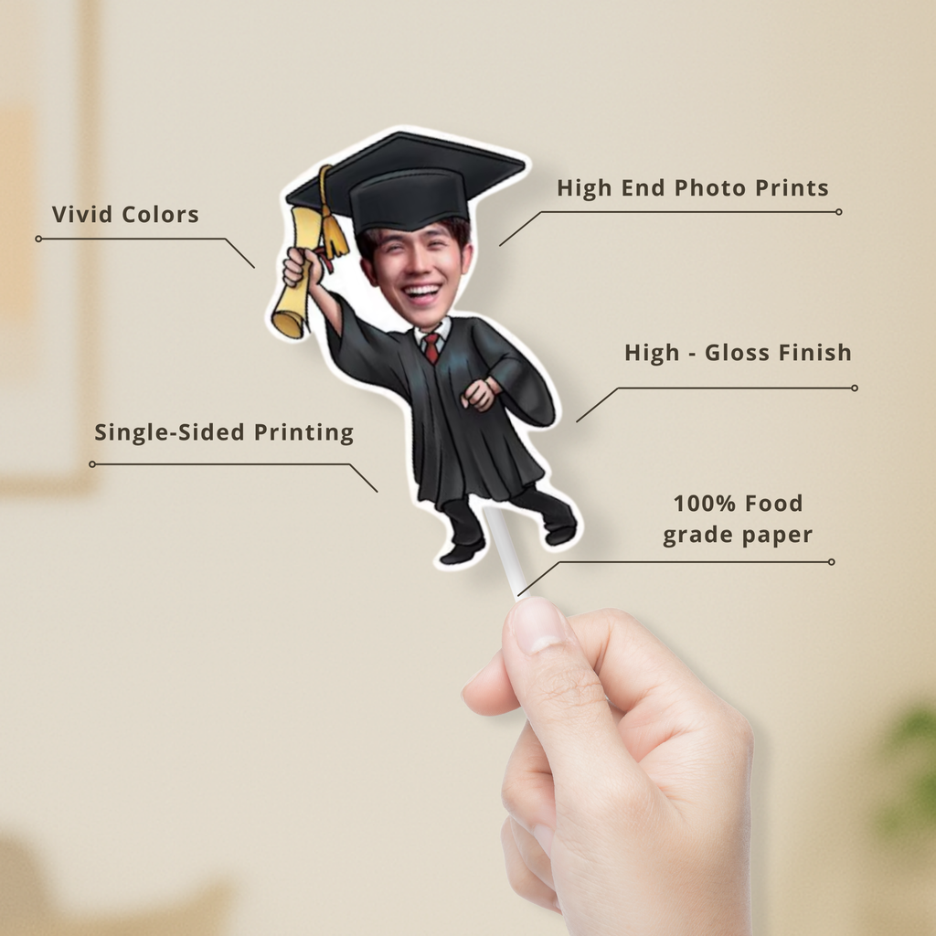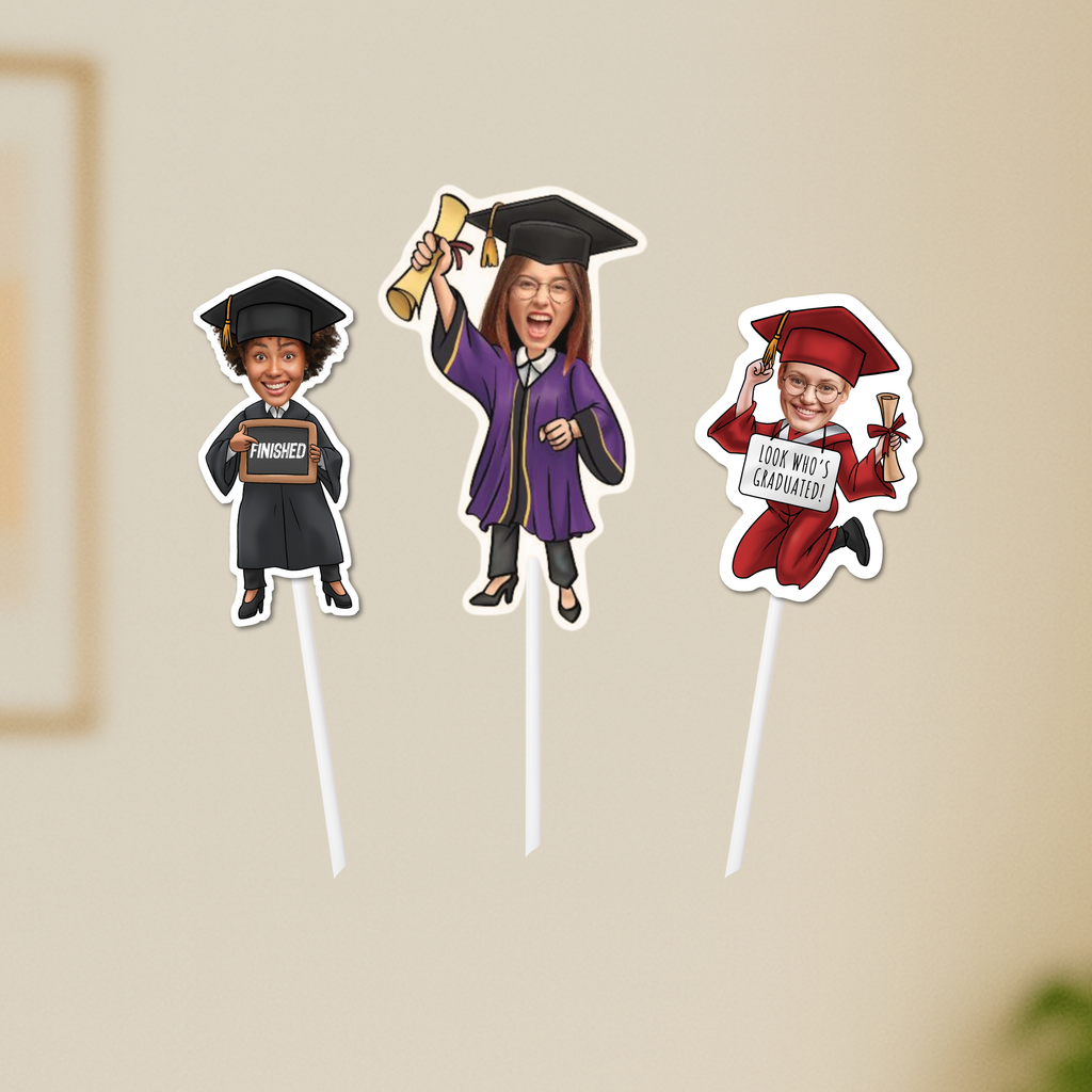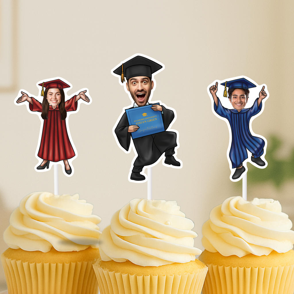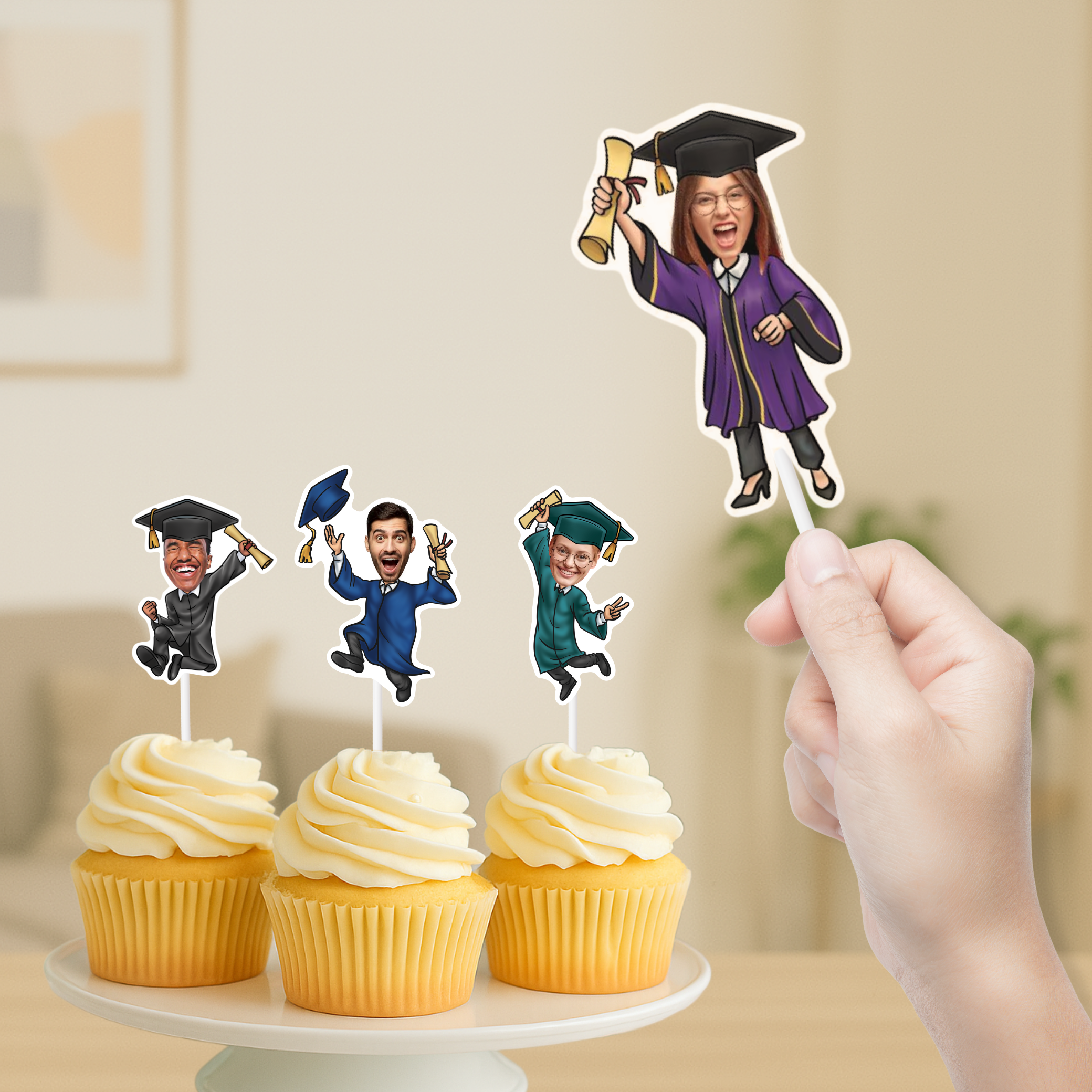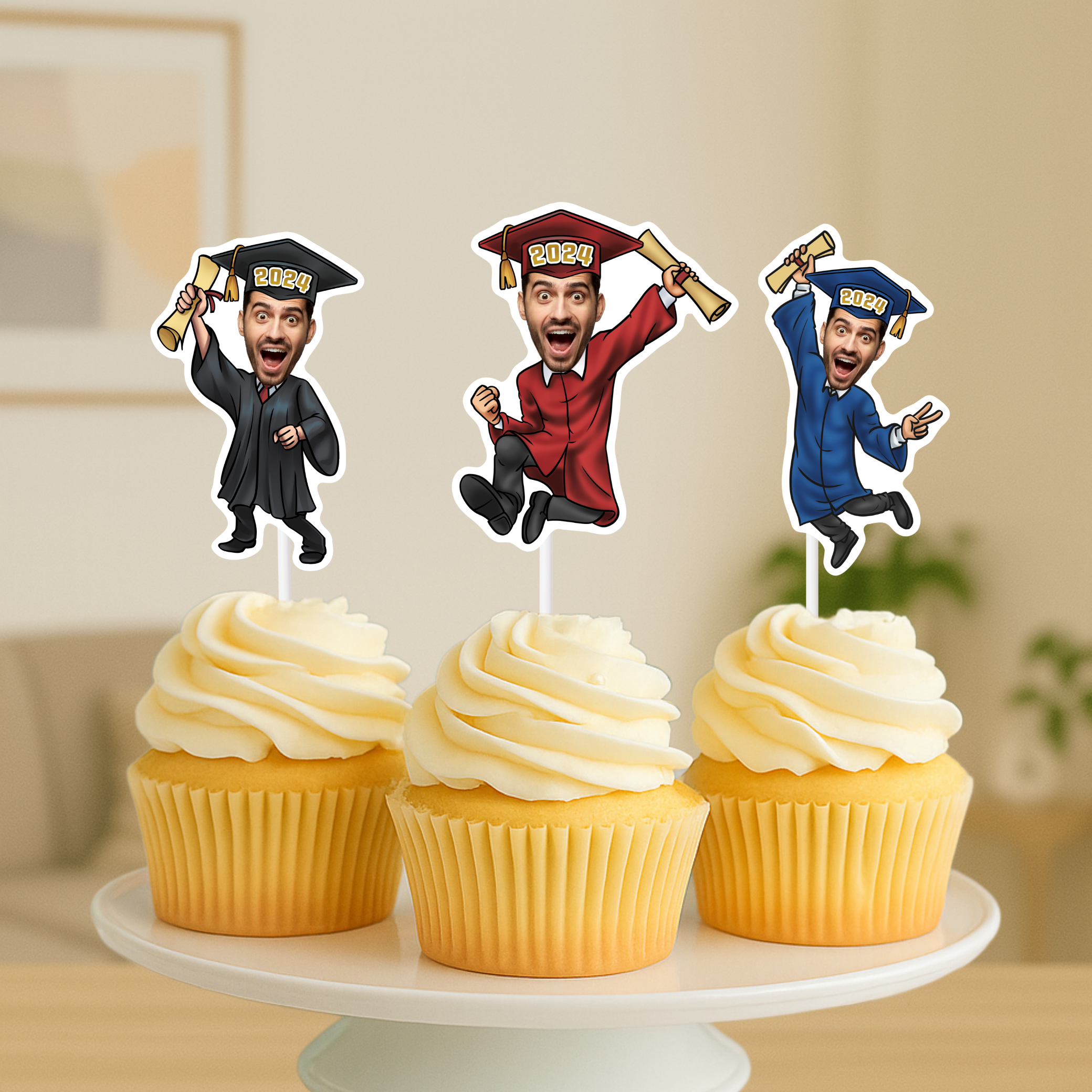 Celebrate the milestone in style with our personalized graduate-themed cupcake toppers or stickers, featuring your graduate's own beaming face! Tailored specifically for a graduation bash, these toppers also double as versatile stickers, allowing you to add a touch of academic charm to decorations, party favors, and more.