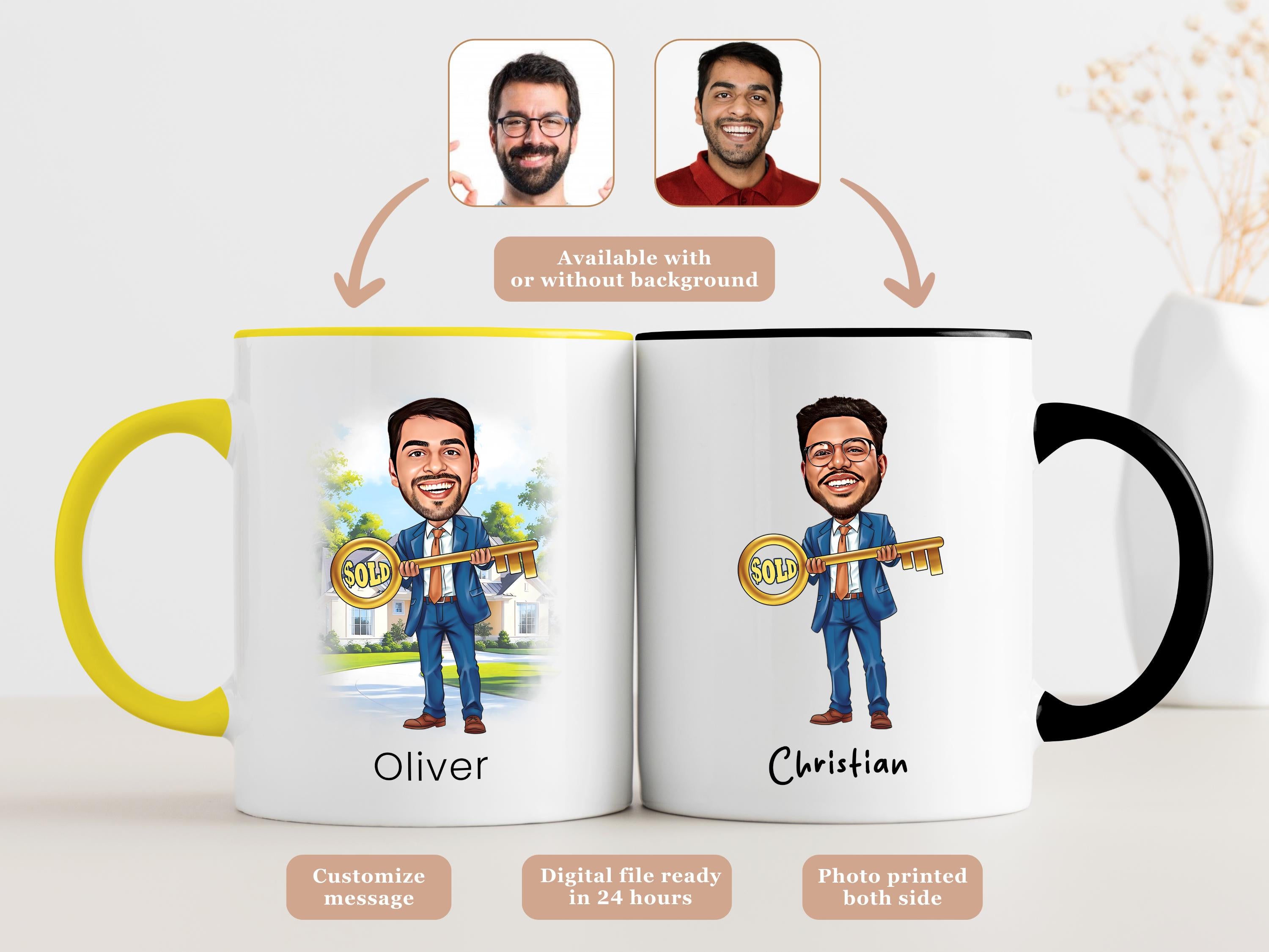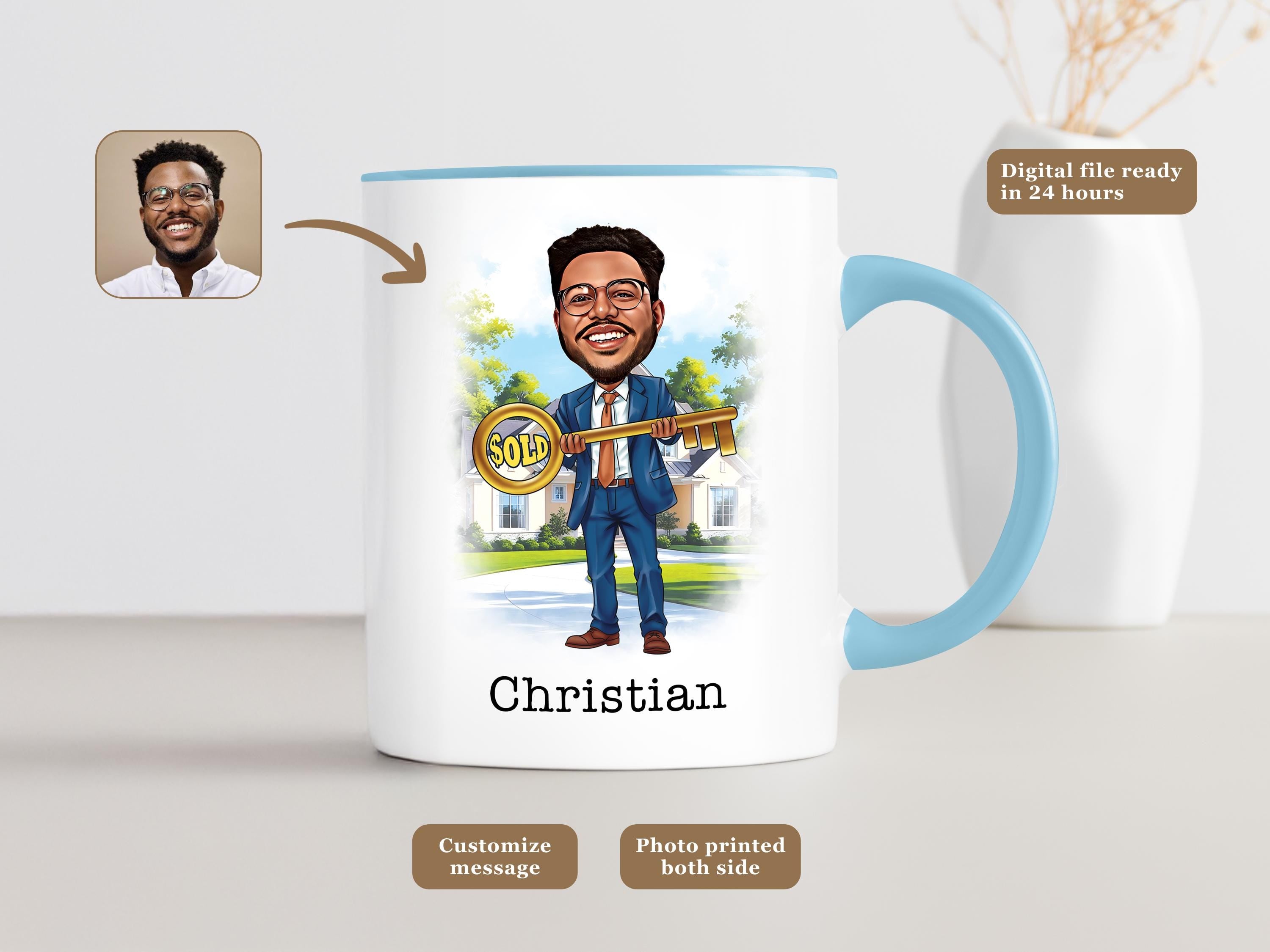 Celebrate the hard-working real estate agent in your life with a fun and personalized gift! This Personalized Real Estate Agent Mug features a custom caricature based on a photo you provide a perfect way to brighten their day and show appreciation for their dedication.