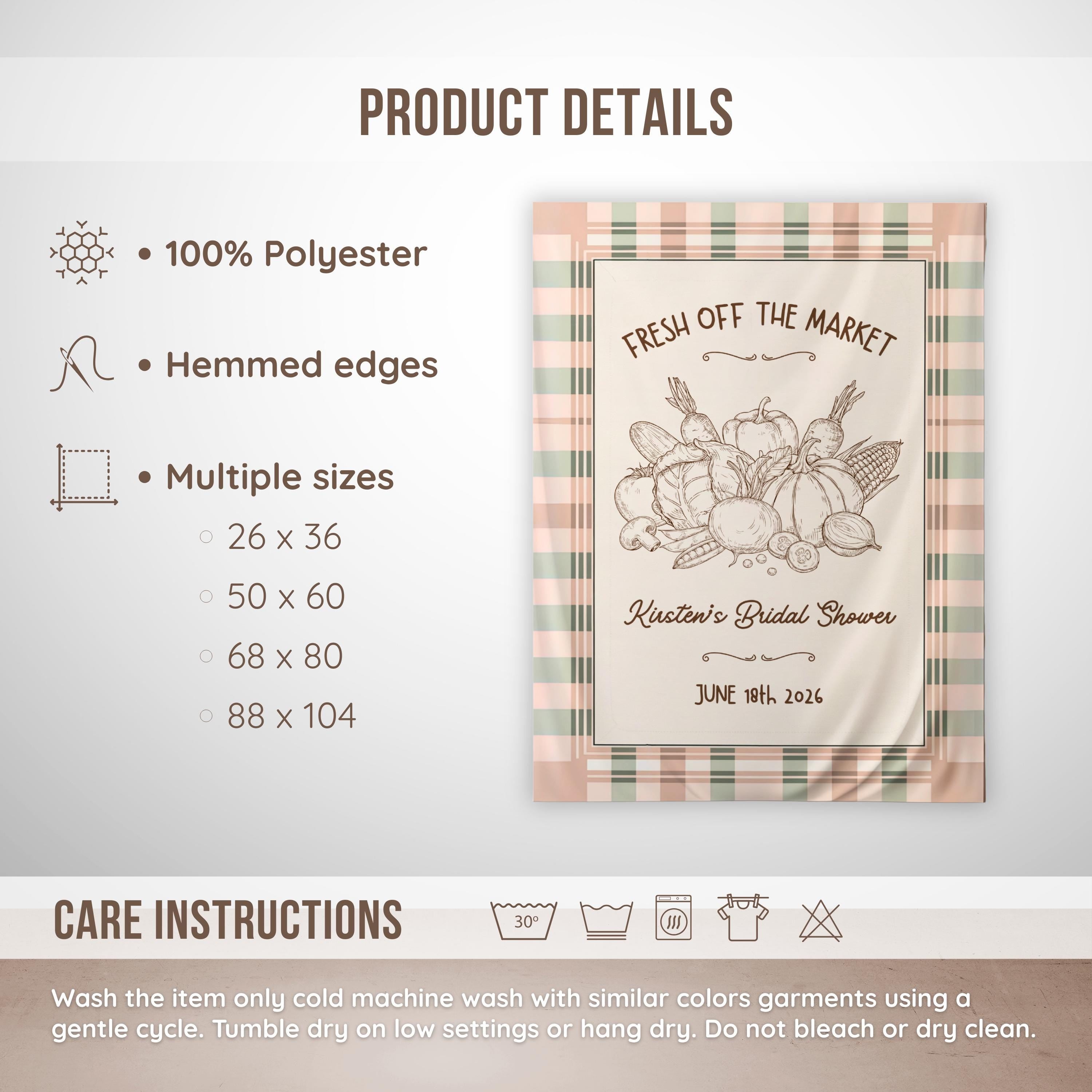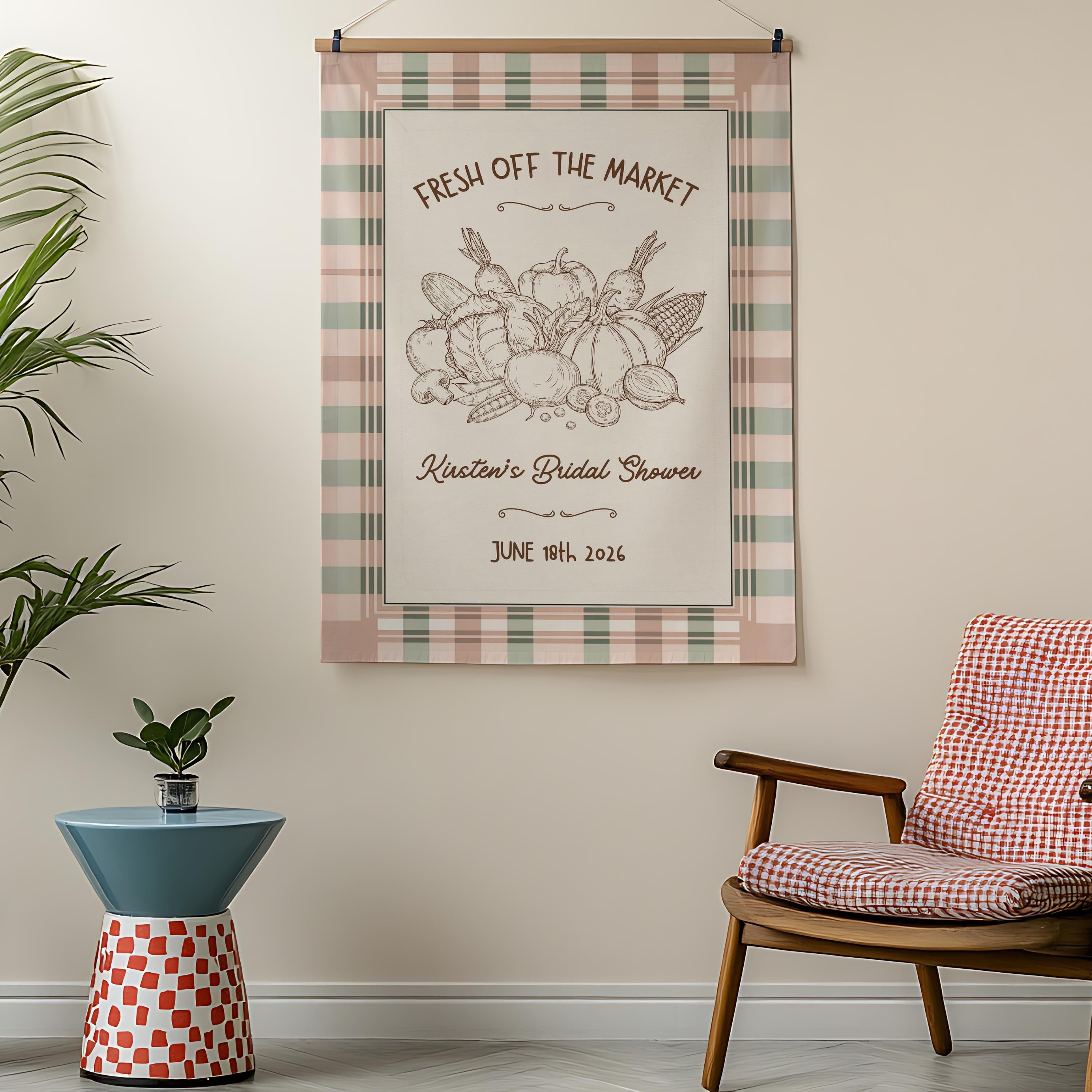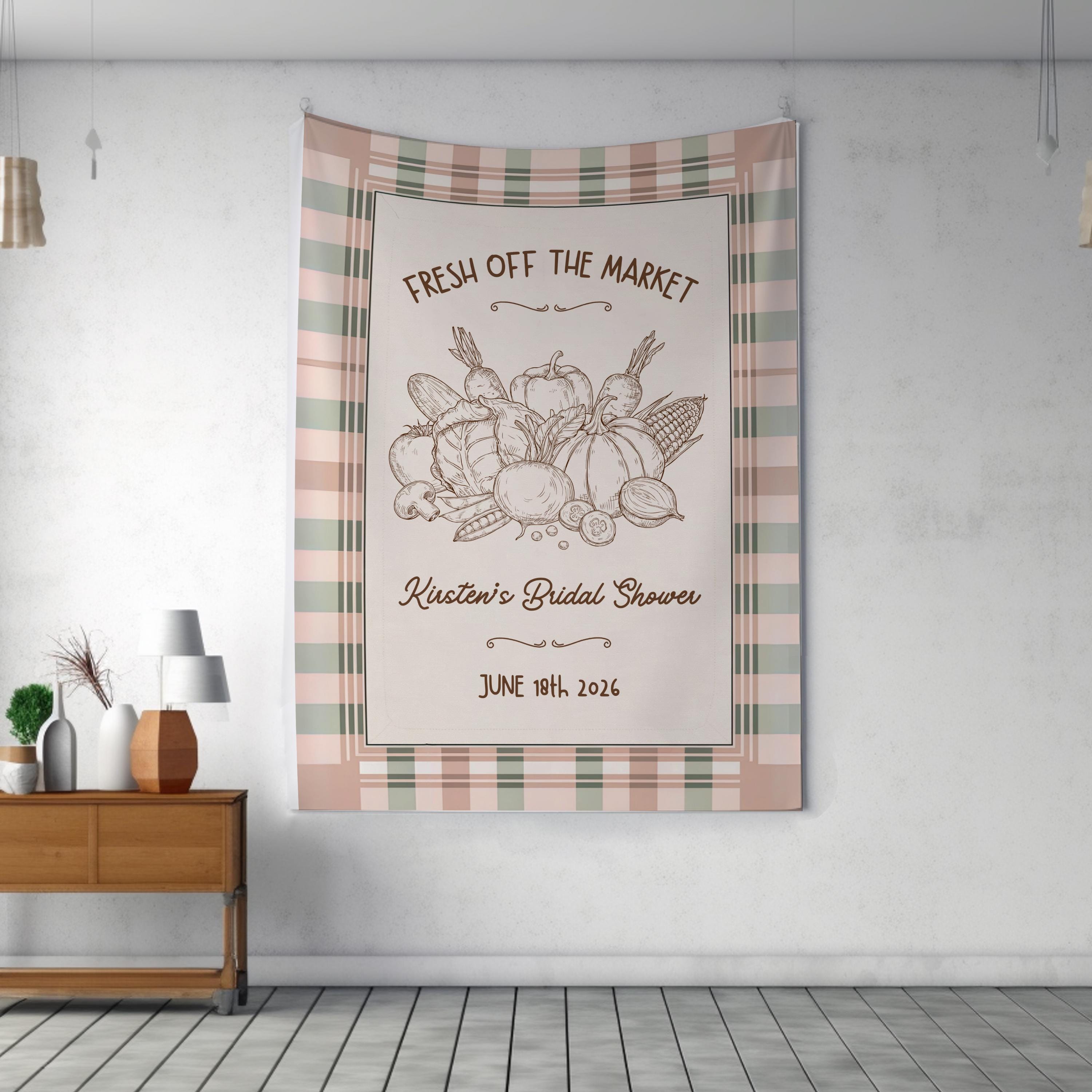 Celebrate the bride-to-be in style with this personalized bridal shower tapestry! Featuring the fun and flirty phrase Fresh Off The Market, this custom banner makes the perfect backdrop for bridal showers, engagement parties, or bachelorette celebrations. Material: ✅ Material: 100% Polyester (lightweight, soft & durable) ✅ Sizes: 26x36", 50x60", 68x80", 88x104" ✅ Indoor use only ✅ Hemmed edges for durability ✅ Easy to hang & reuse for multiple events