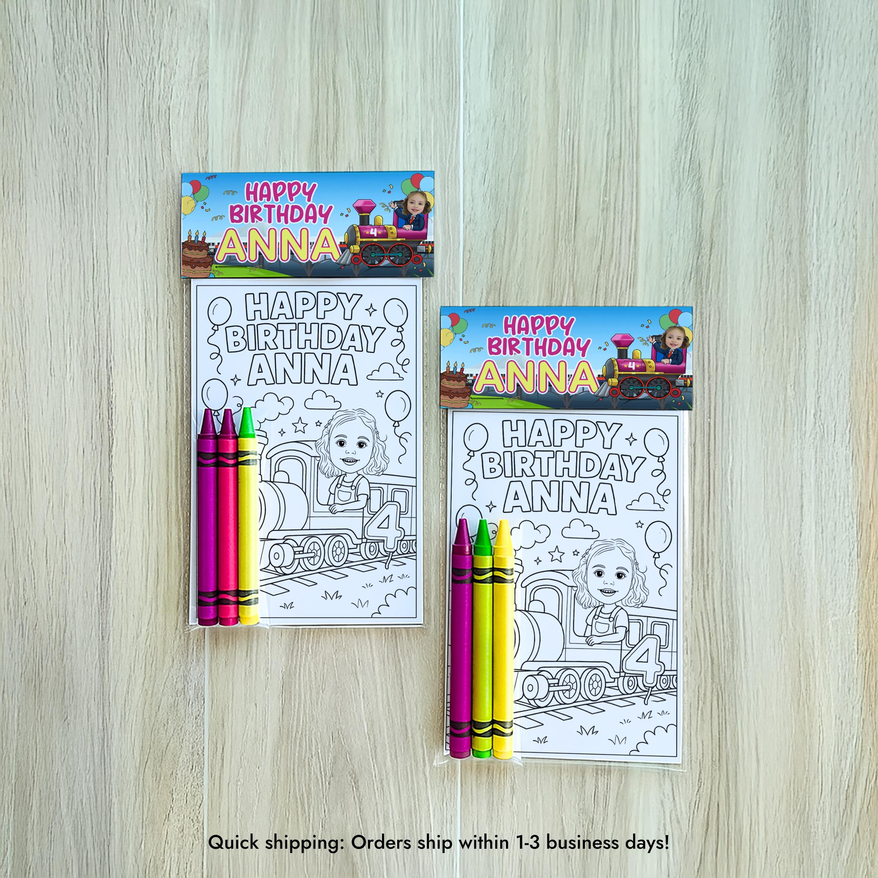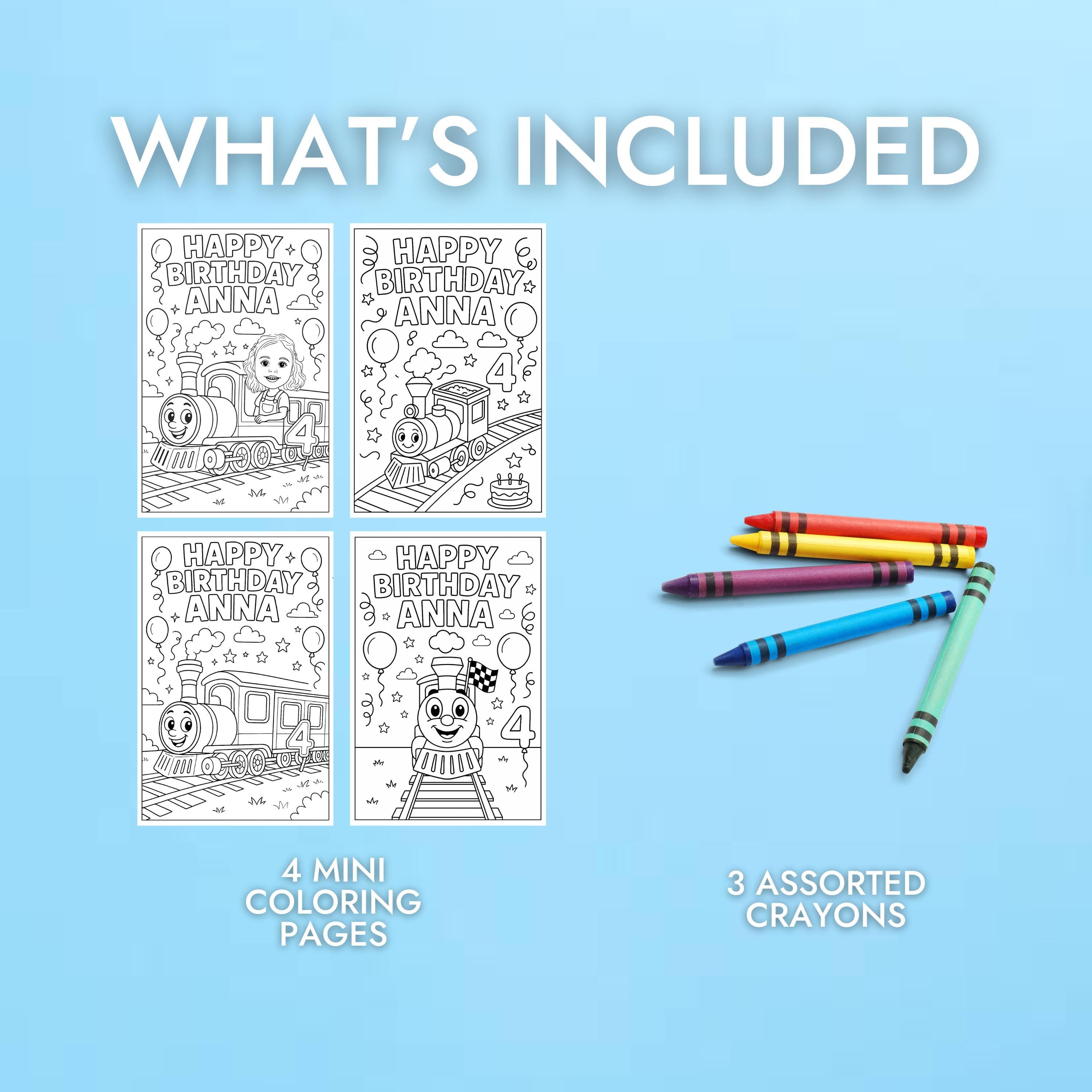 All aboard for fun with these Personalized Train-Themed Birthday Coloring Pages! Perfect for train-loving kids, these custom coloring sheets make a great party activity and a unique party favor. Material: ✅ Size: 4.25" x 5.5" EACH BAG INCLUDES - 4 mini coloring pages (printed on cardstock paper). - 3 Assorted crayons