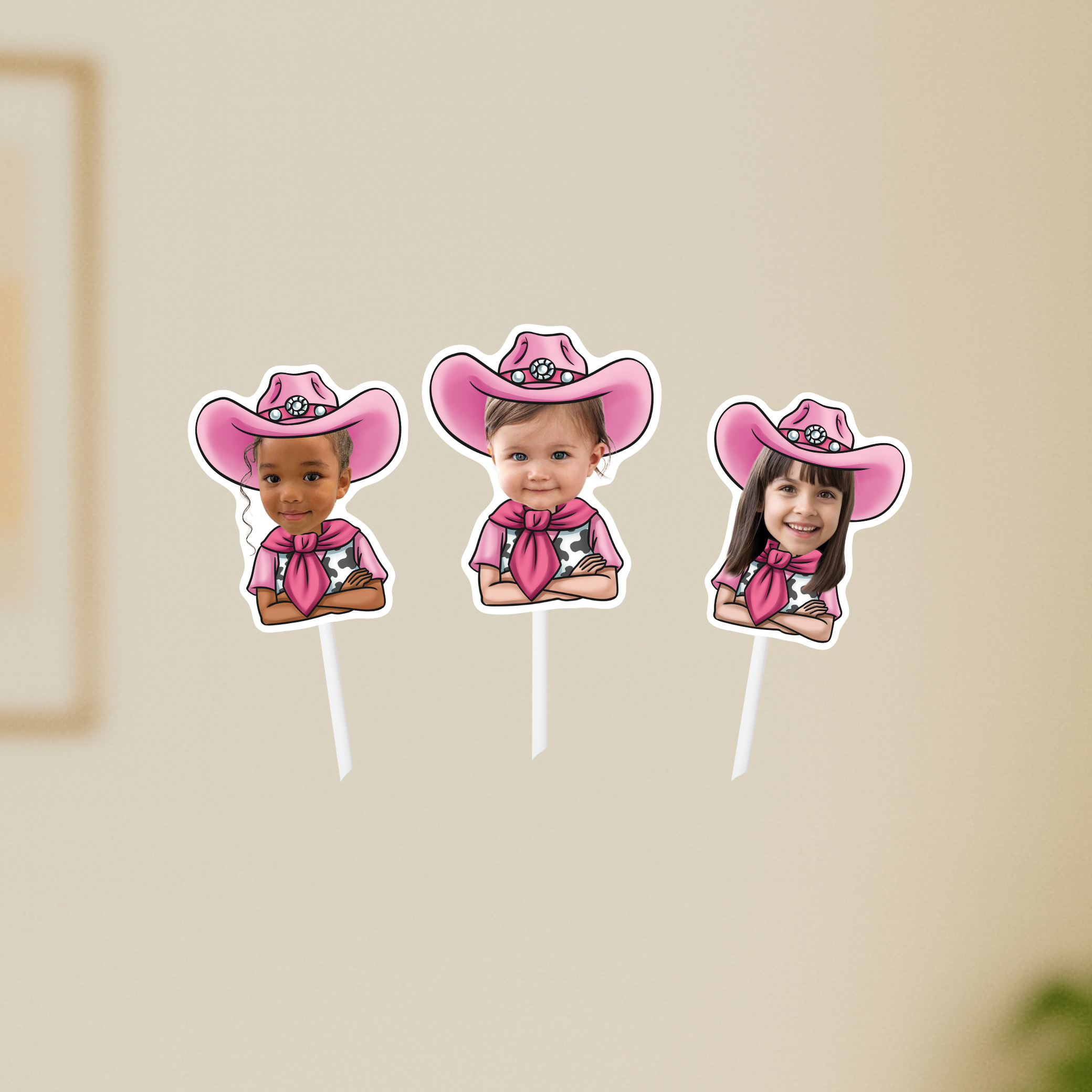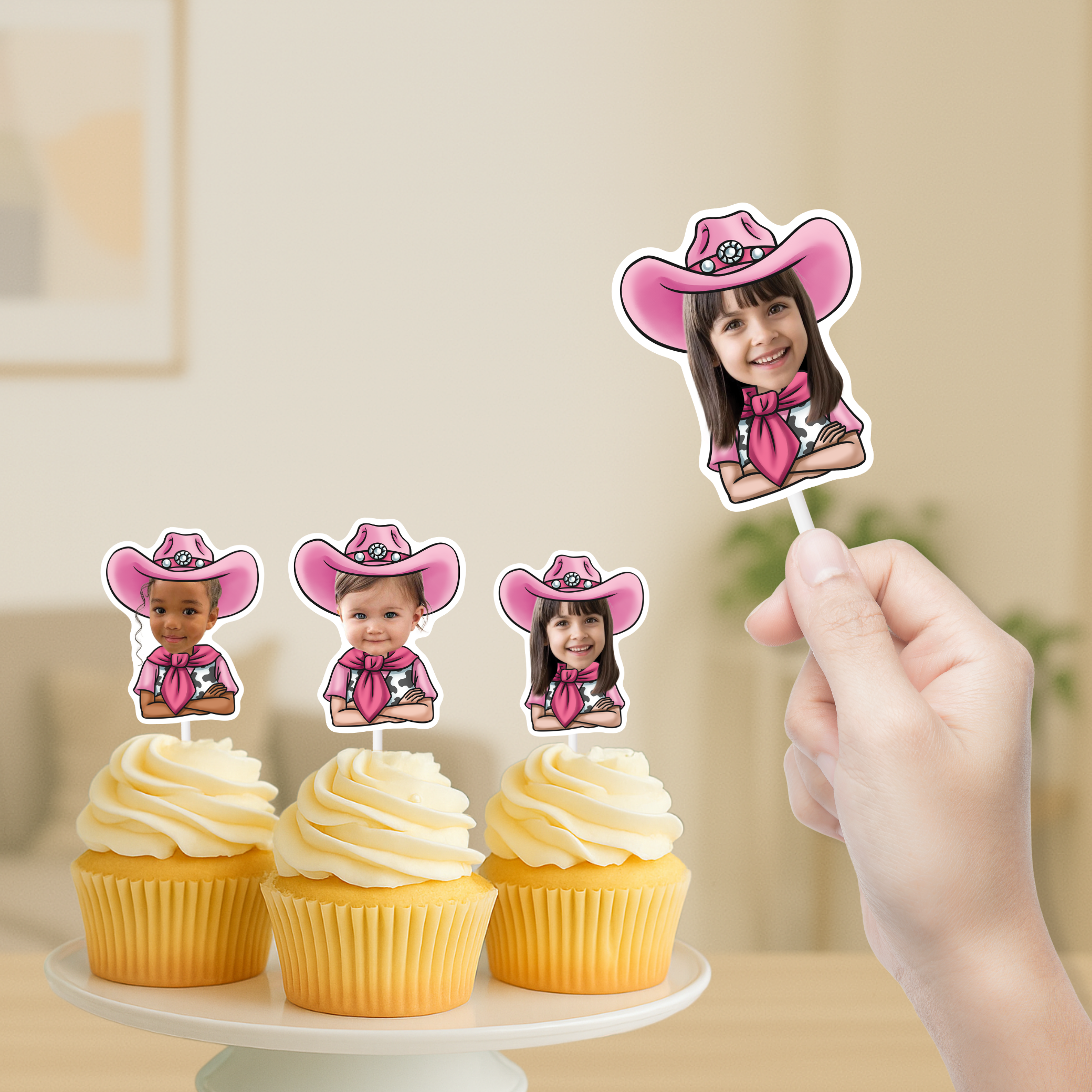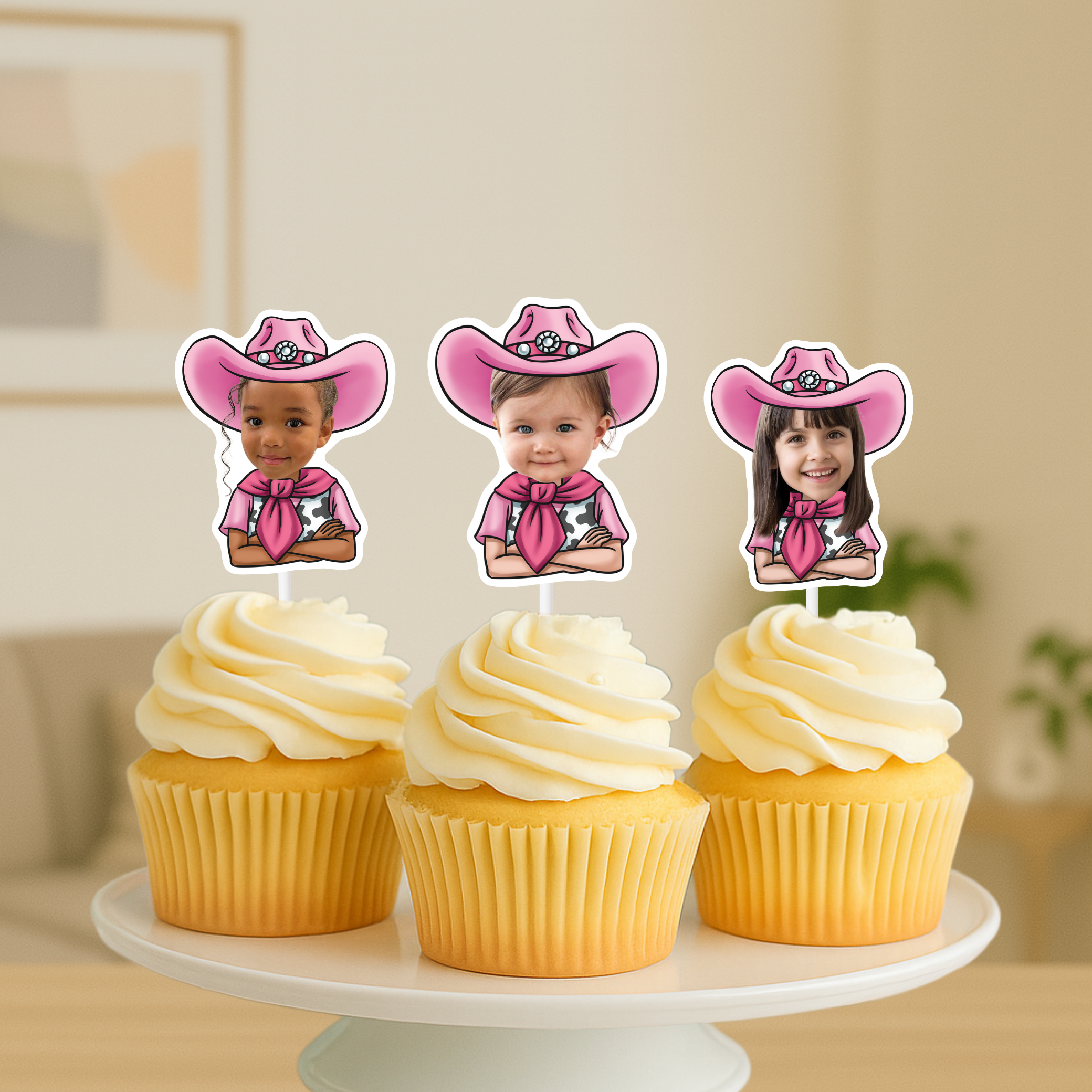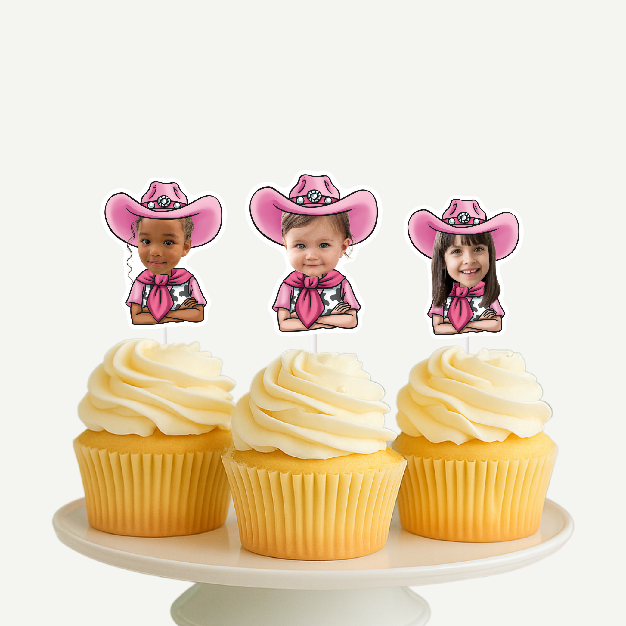 Giddy up for a fun celebration with our Pink Cowgirl Cupcake Toppers! Perfect for a first rodeo birthday or any Western-themed party, these custom face treat toppers add a charming and personalized touch to your cupcakes.