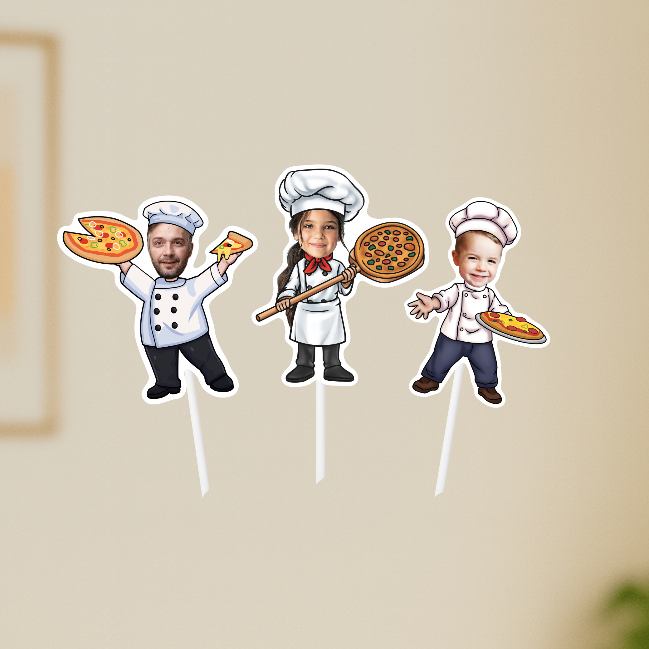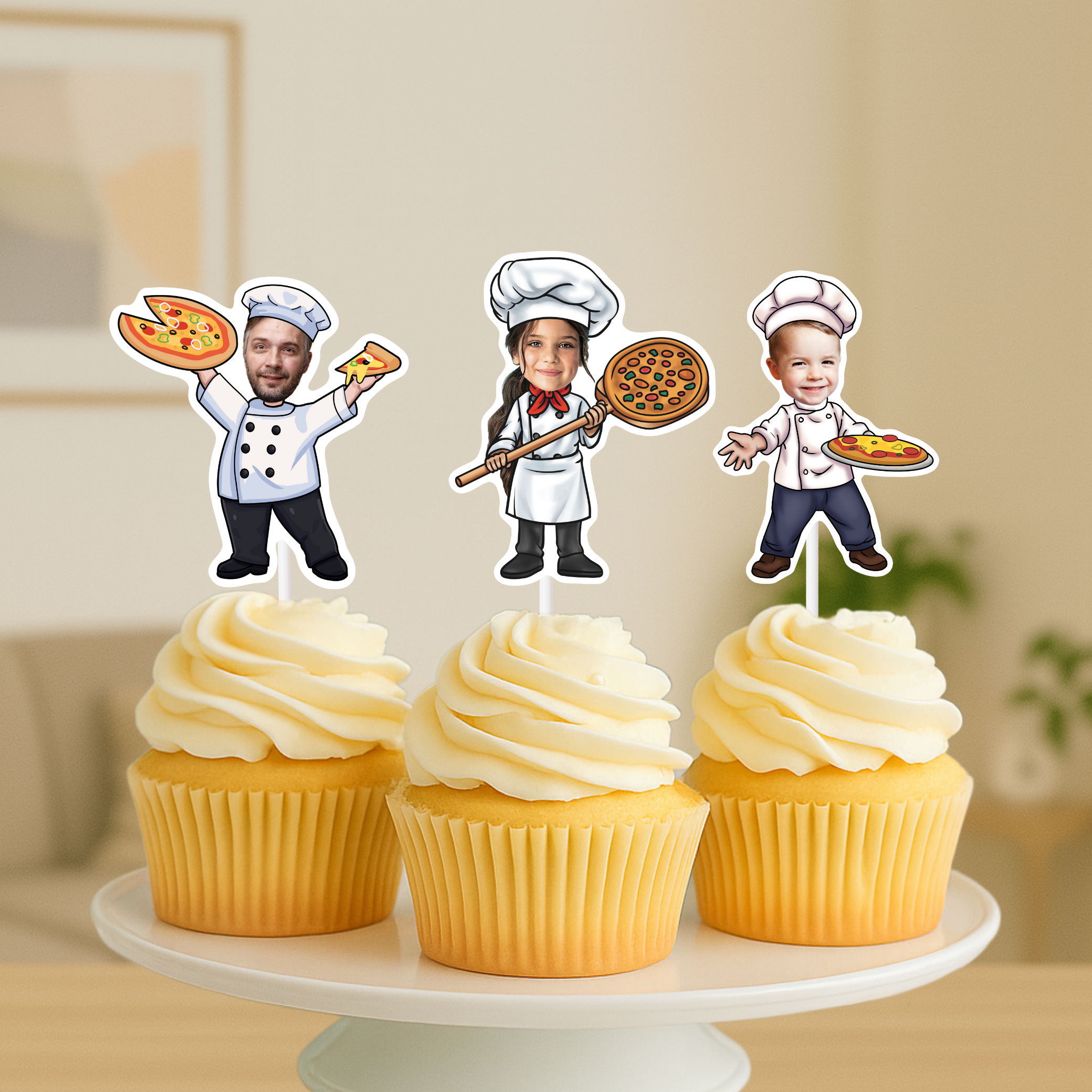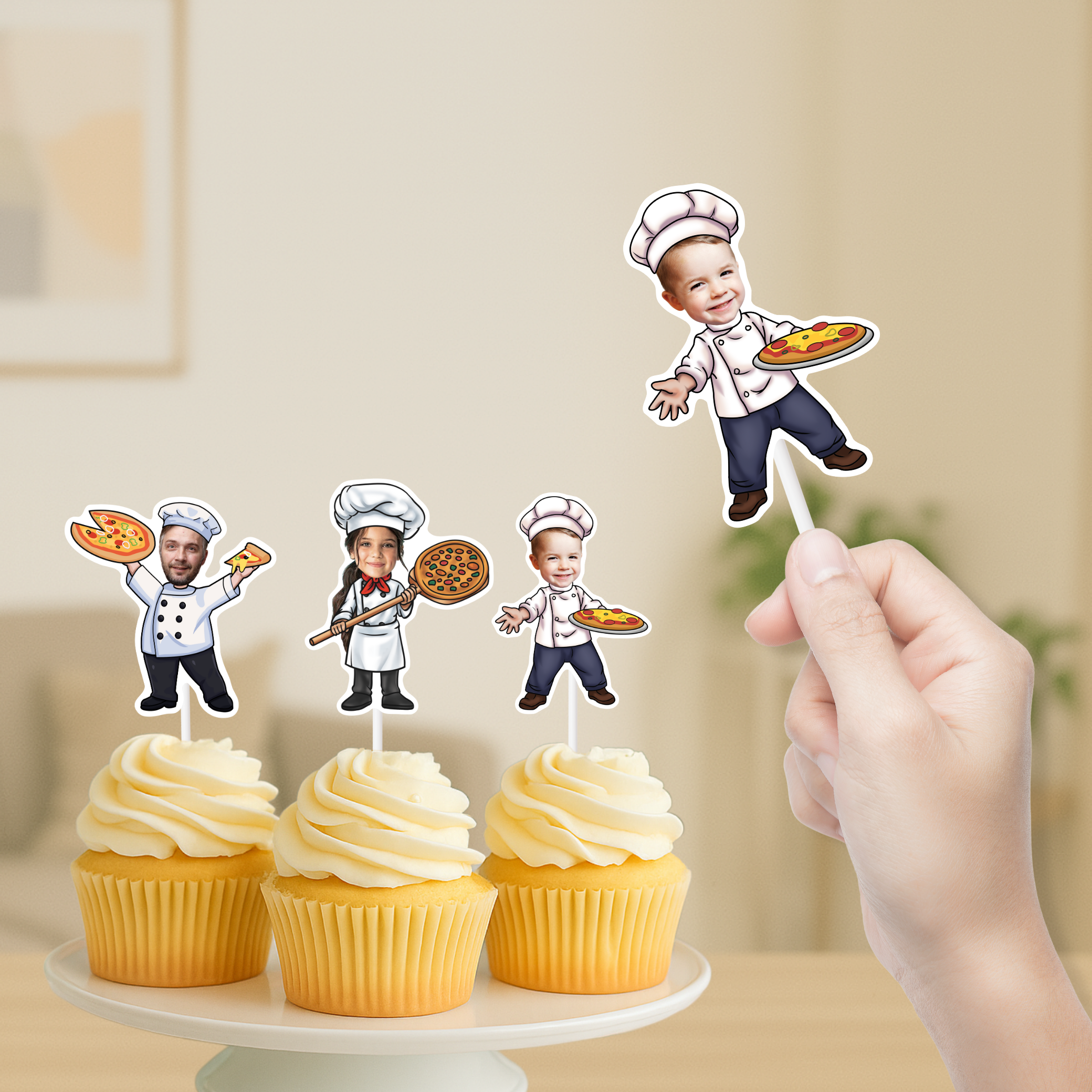 Prepare for a pizza extravaganza with personalized pizza chef cupcake toppers or stickers! Dive into the fun by showcasing your child's face in designs that transform cupcakes into delectable delights.