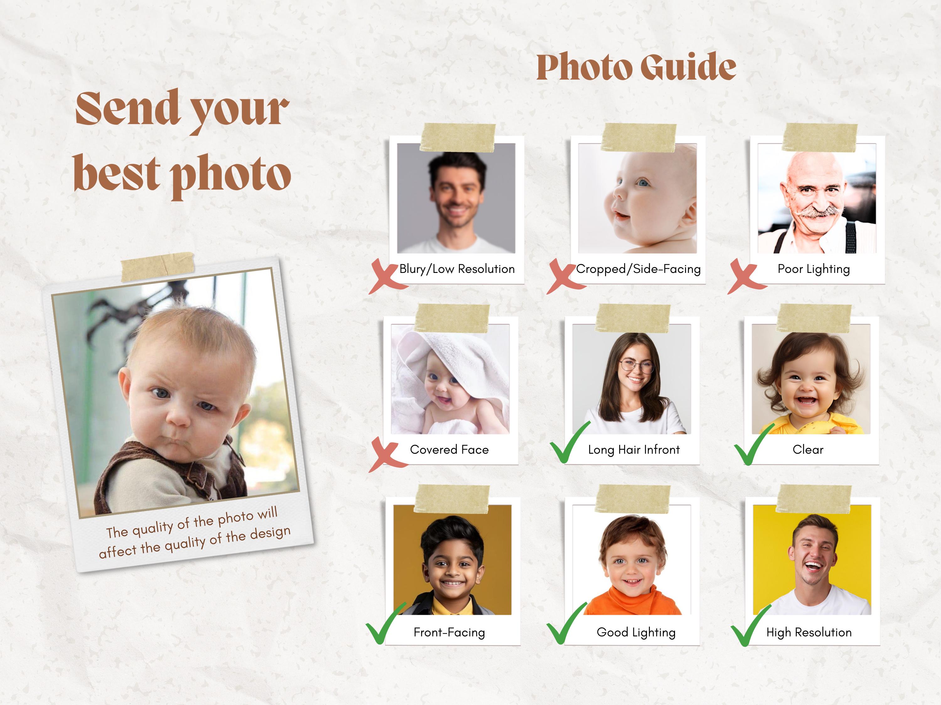 ⚠️ Photo quality directly impacts the final design. For best results, use clear, straight-facing, well-lit images.