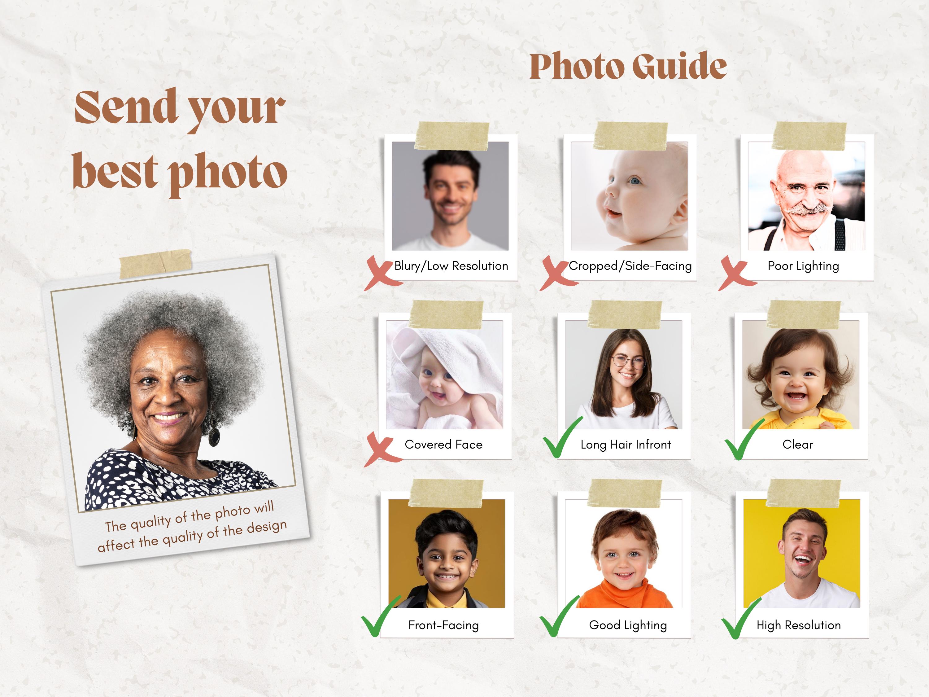 ⚠️ Photo quality directly impacts the final design. For best results, use clear, straight-facing, well-lit images.