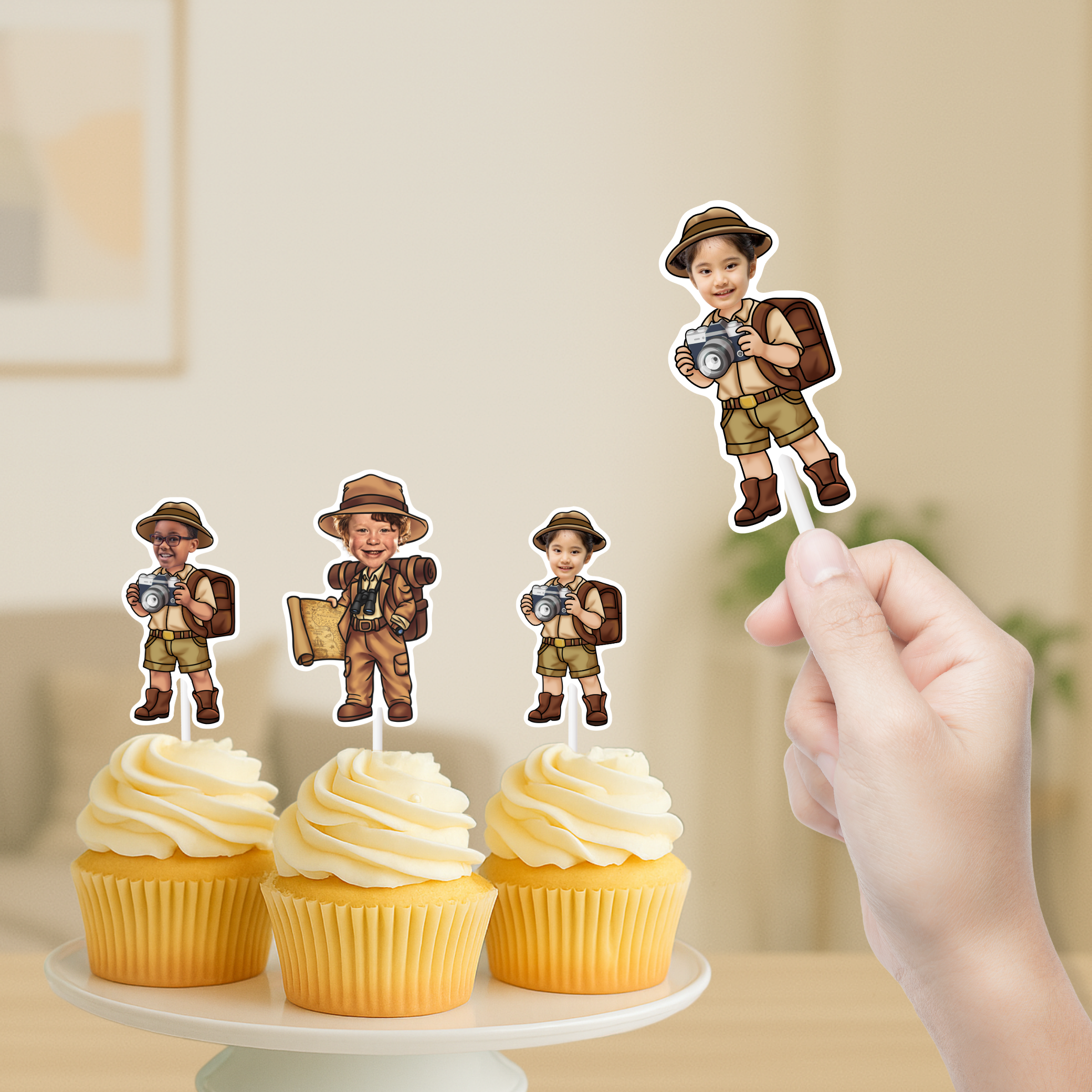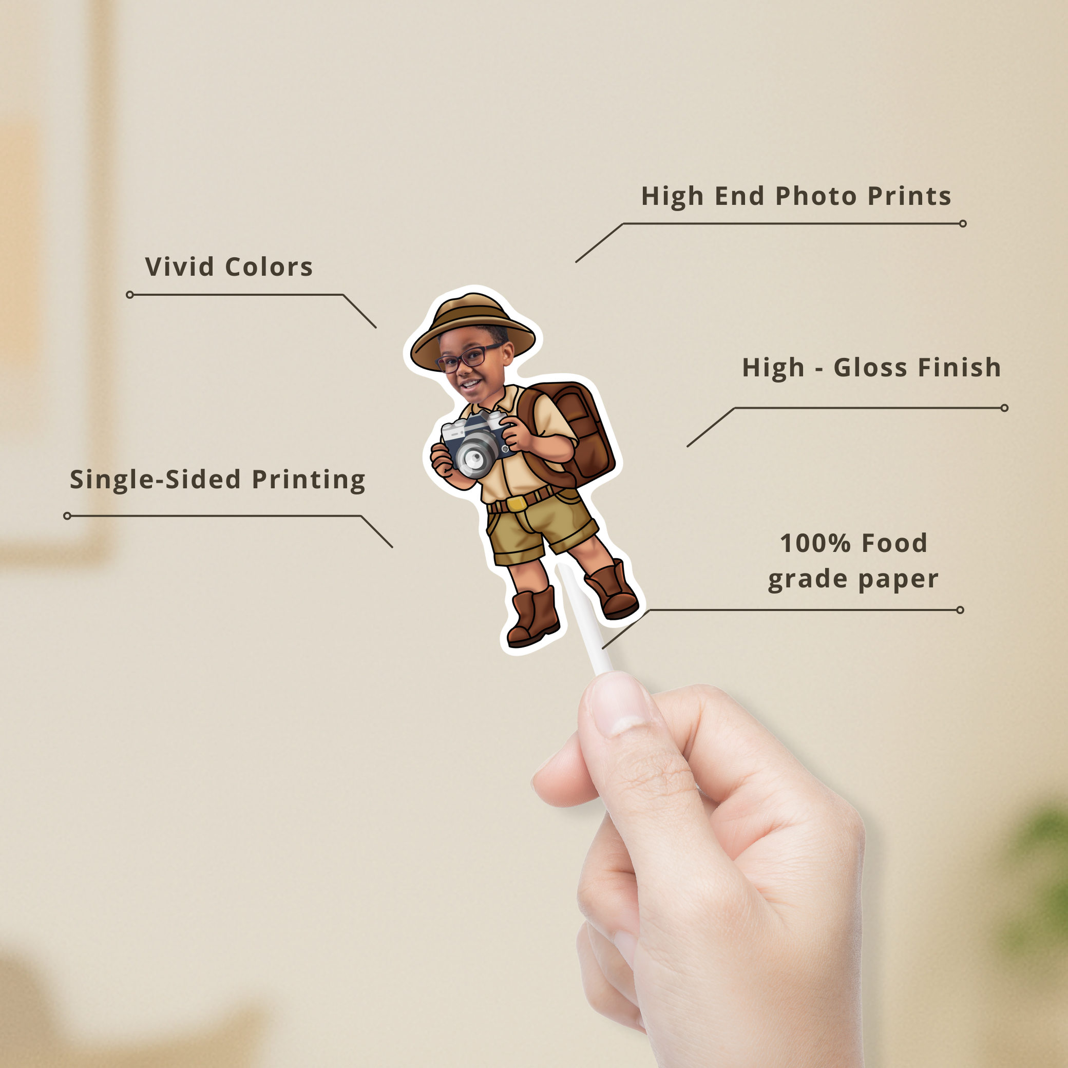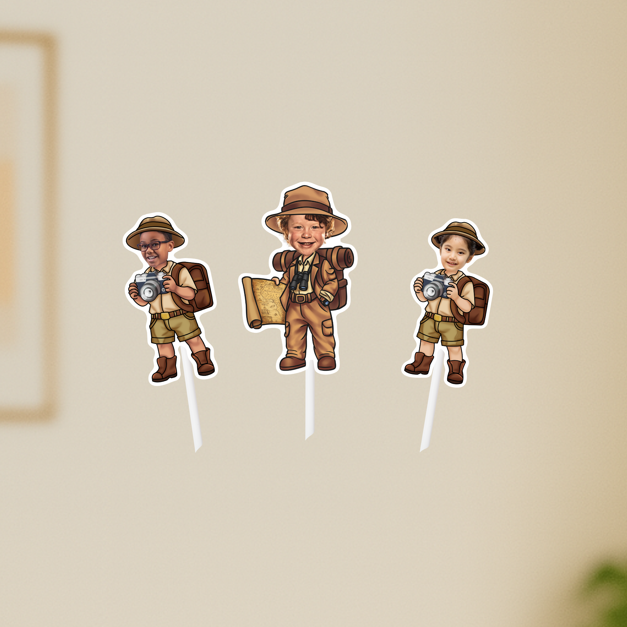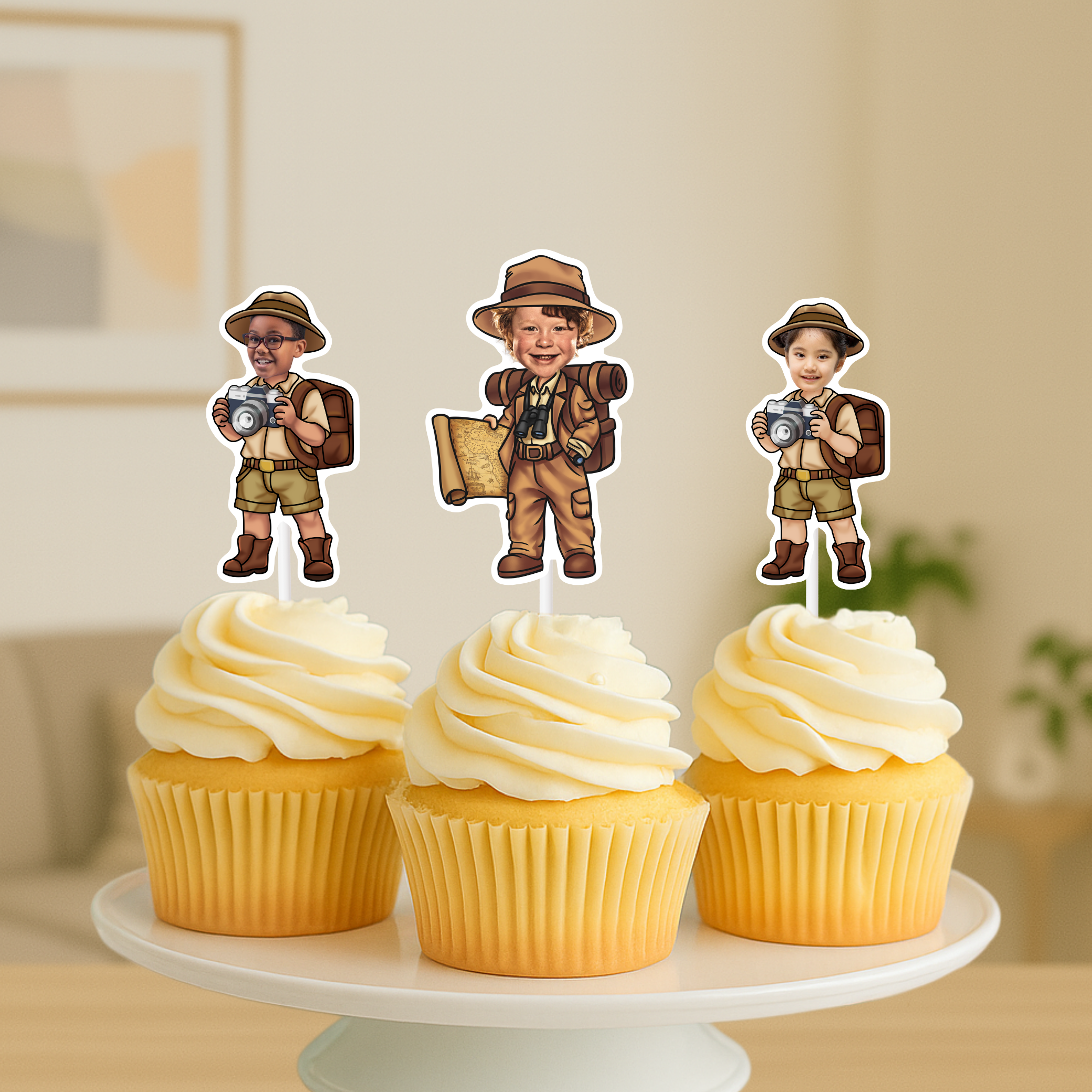 Experience the thrill of the safari with our personalized safari explorer-themed cupcake toppers and stickers, featuring the celebrant's face! Tailored for a safari-themed bash, these toppers not only showcase exciting imagery but also include the celebrant's face for a truly unique touch.