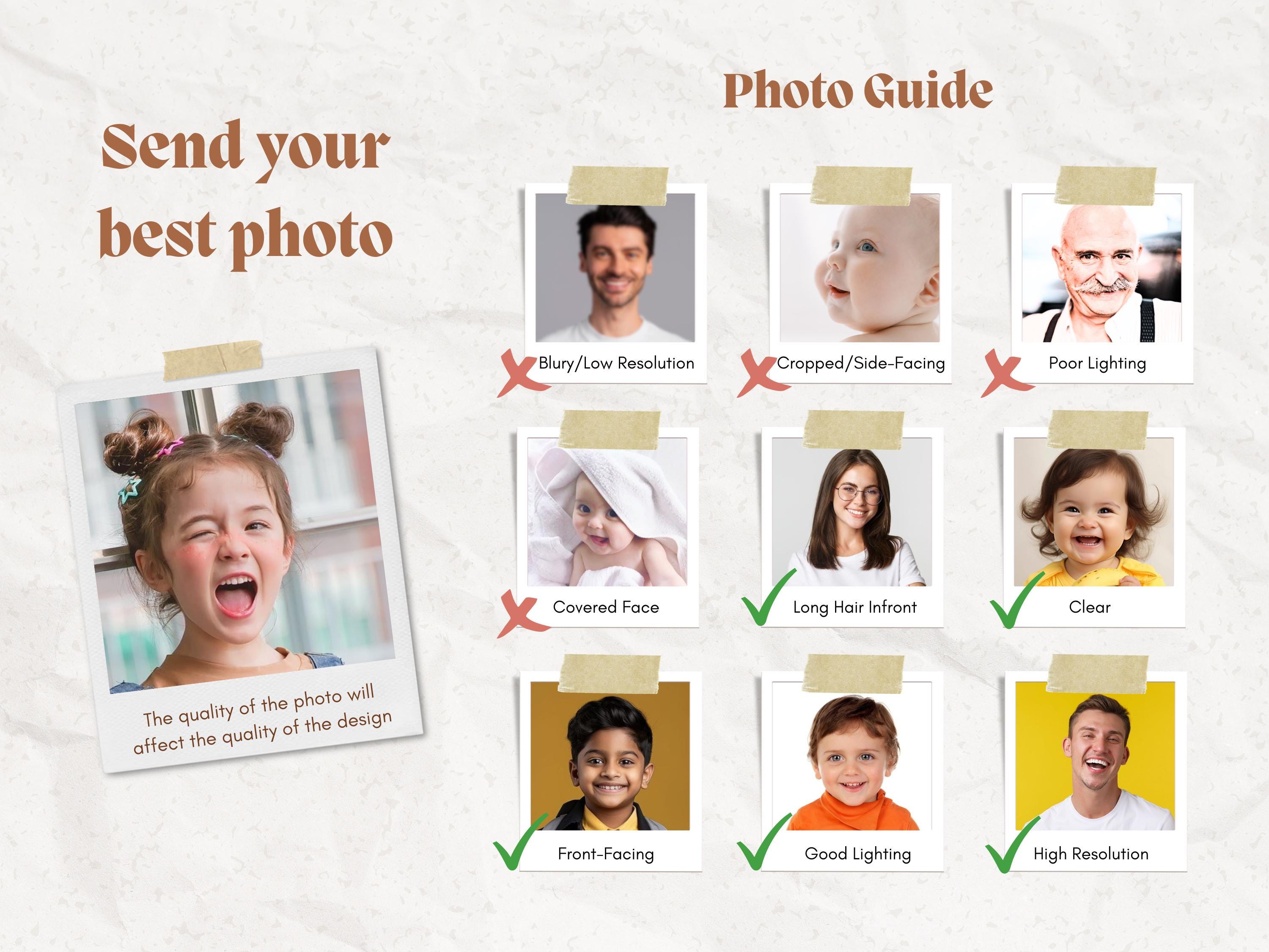 ⚠️ Photo quality directly impacts the final design. For best results, use clear, straight-facing, well-lit images.