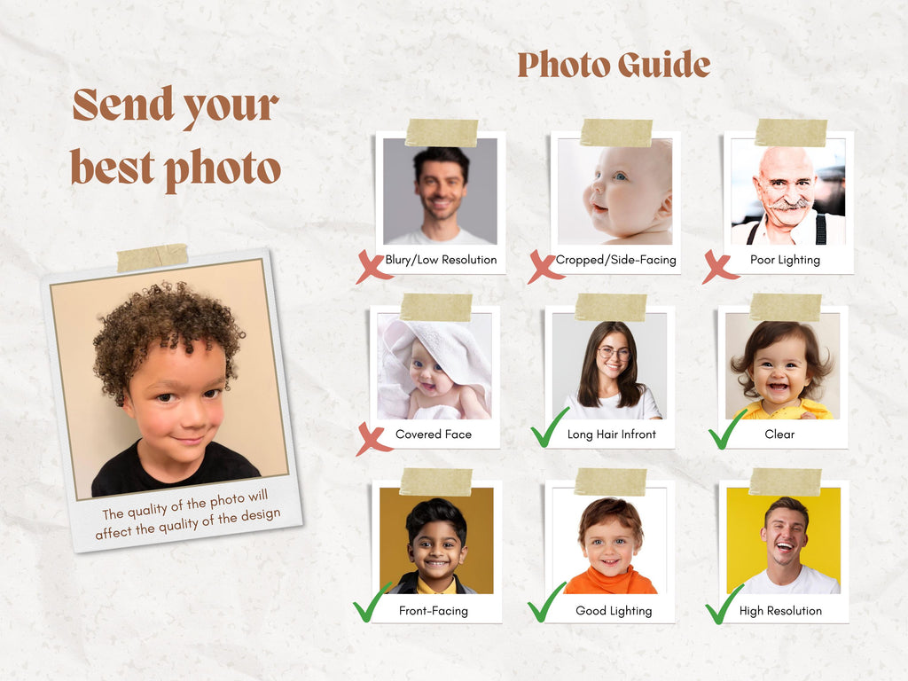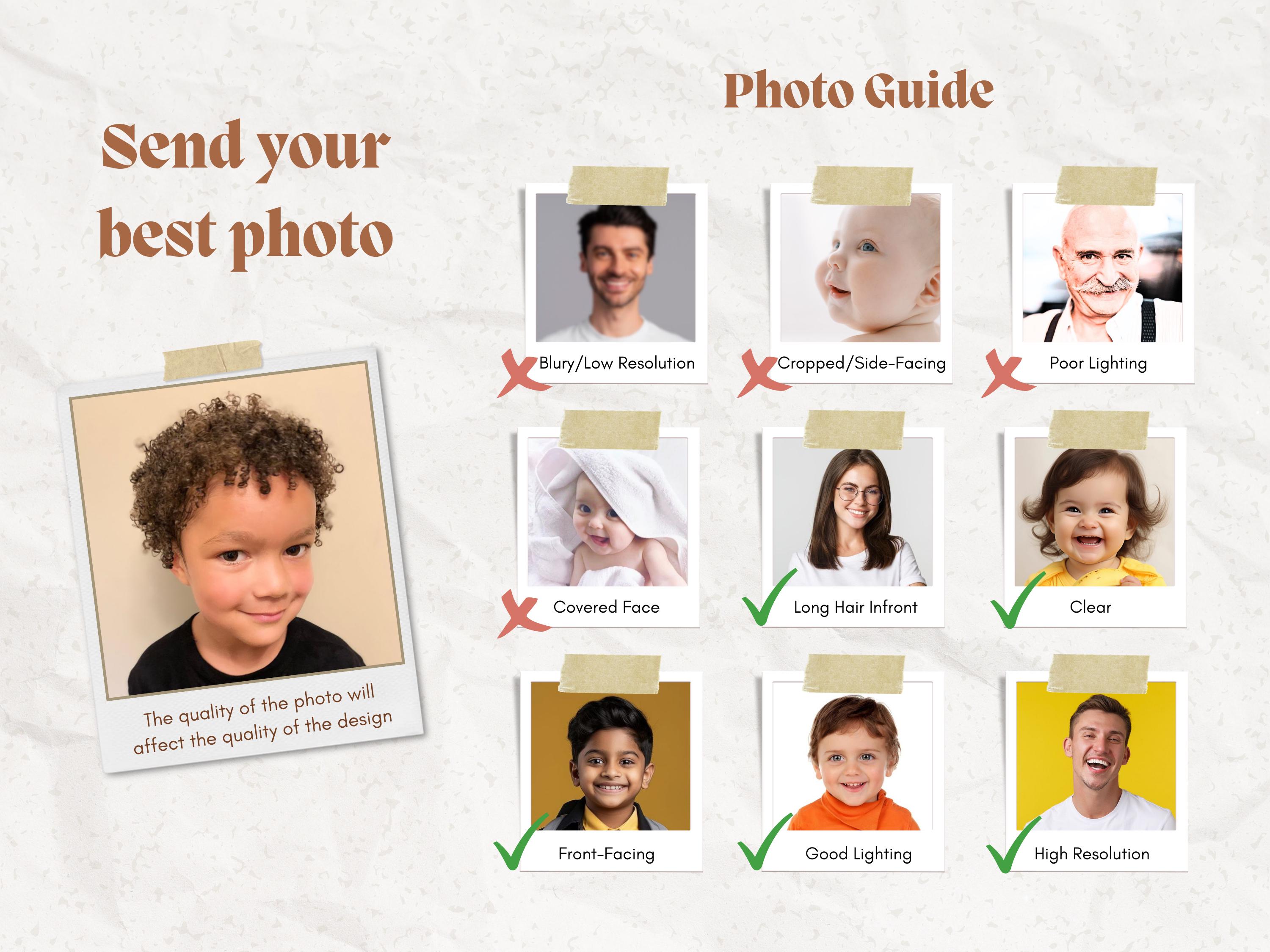 ⚠️ Photo quality directly impacts the final design. For best results, use clear, straight-facing, well-lit images.