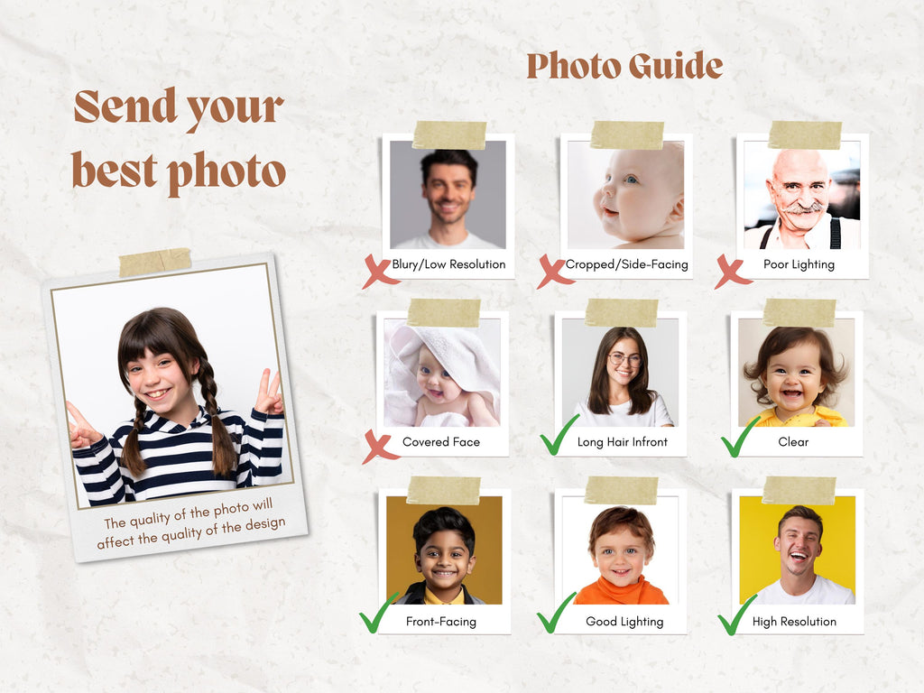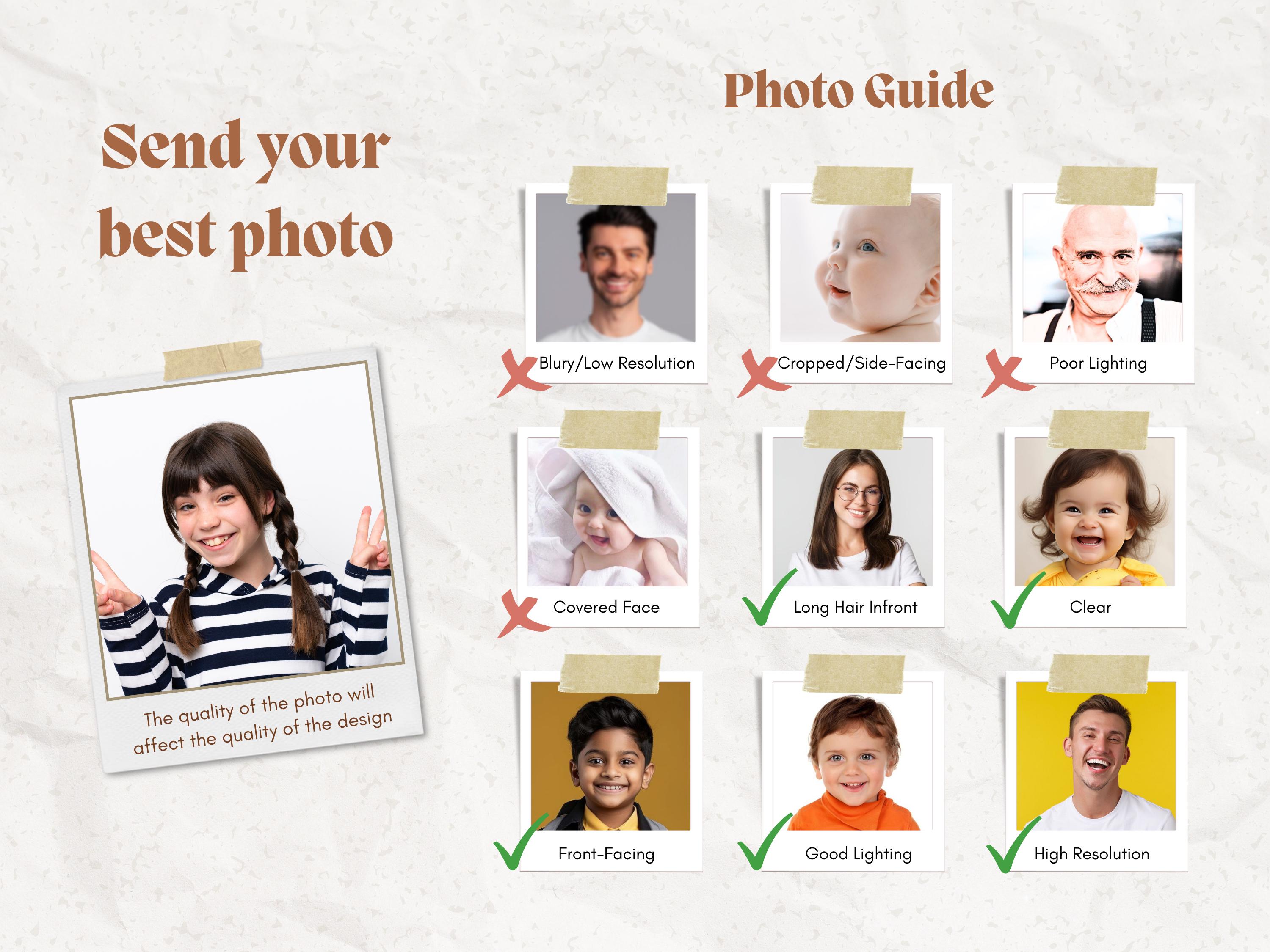 ⚠️ Photo quality directly impacts the final design. For best results, use clear, straight-facing, well-lit images.