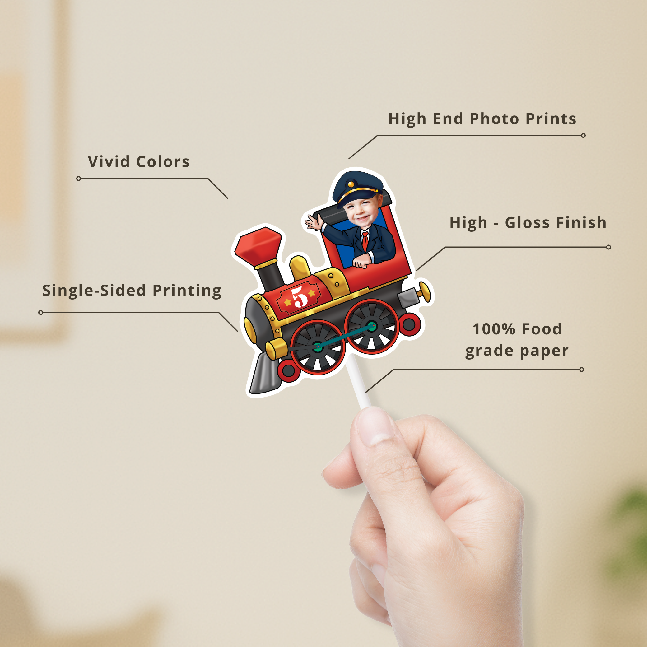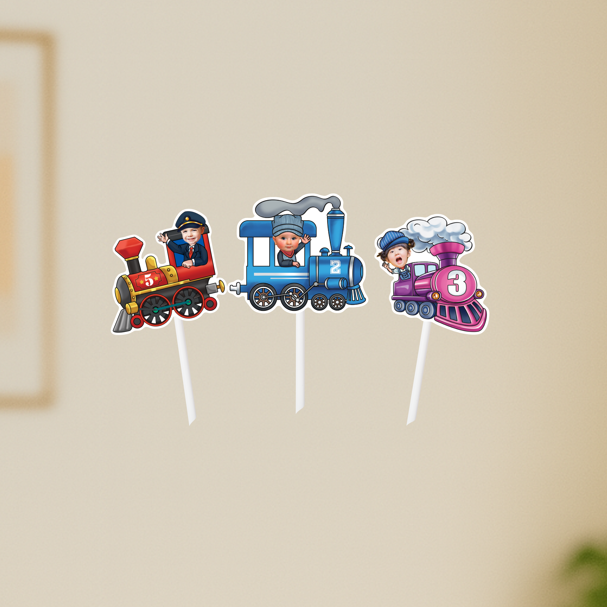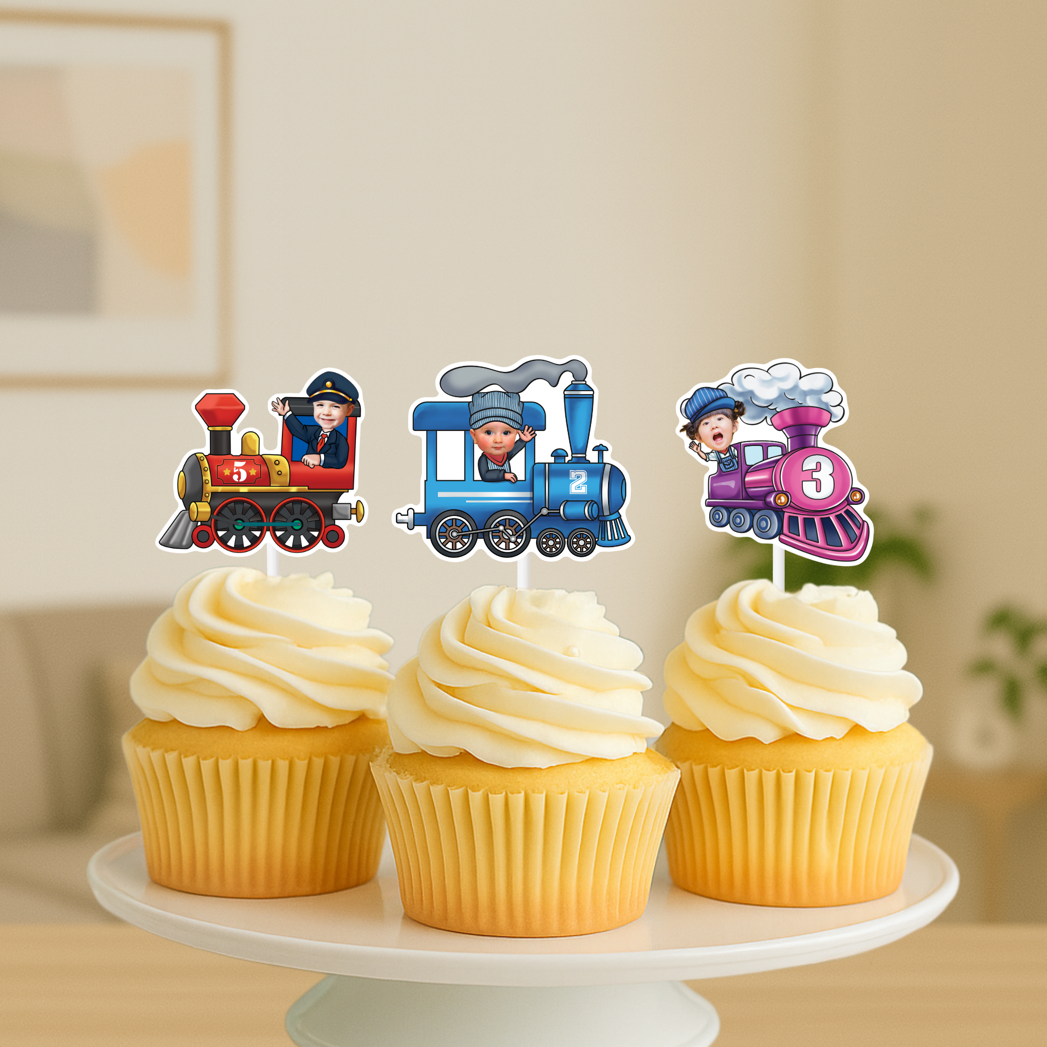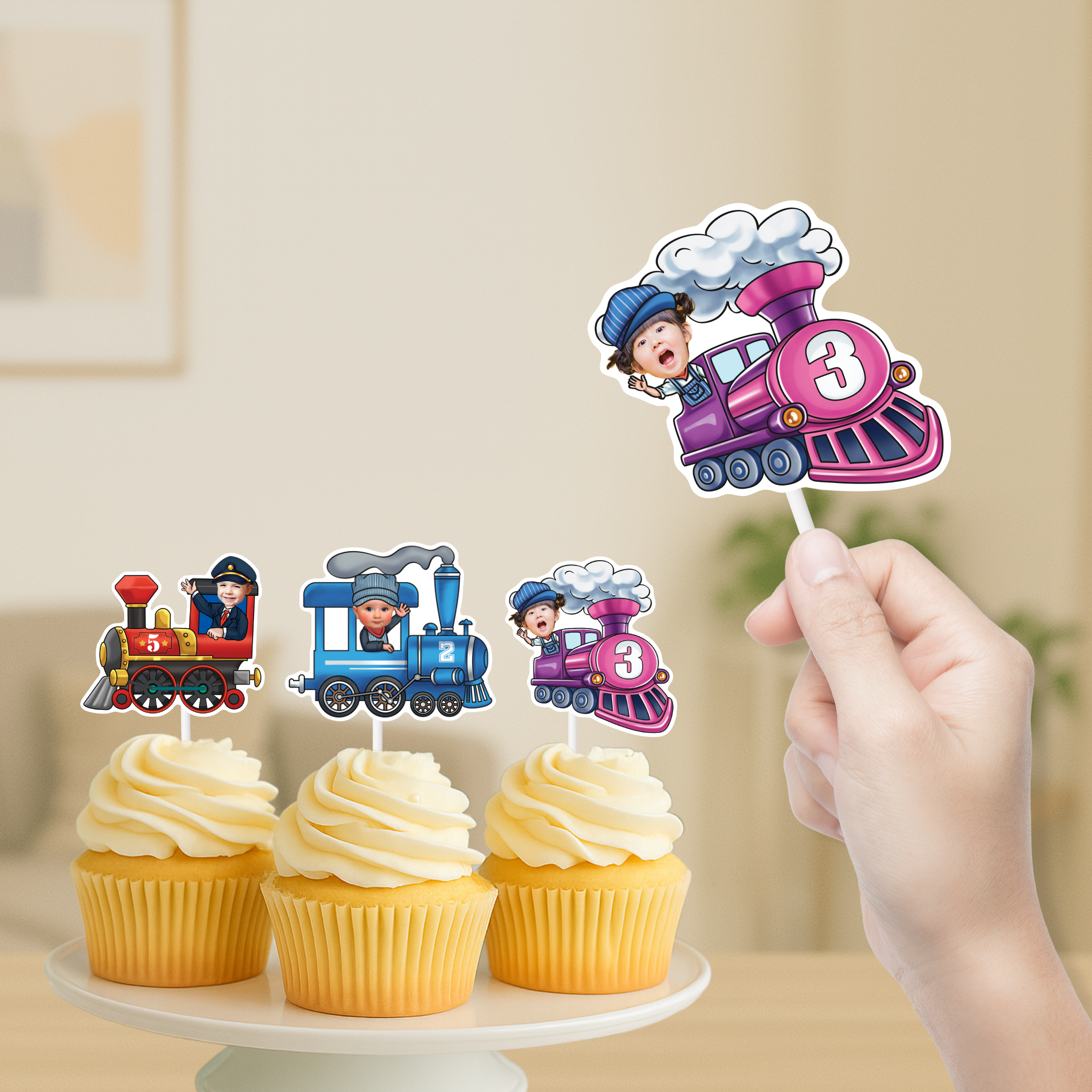 Hop aboard for an epic celebration with personalized train conductor-themed cupcake toppers or stickers! Get ready to chug full steam ahead by featuring your child's face in designs that'll turn cupcakes into delicious railroad treats.