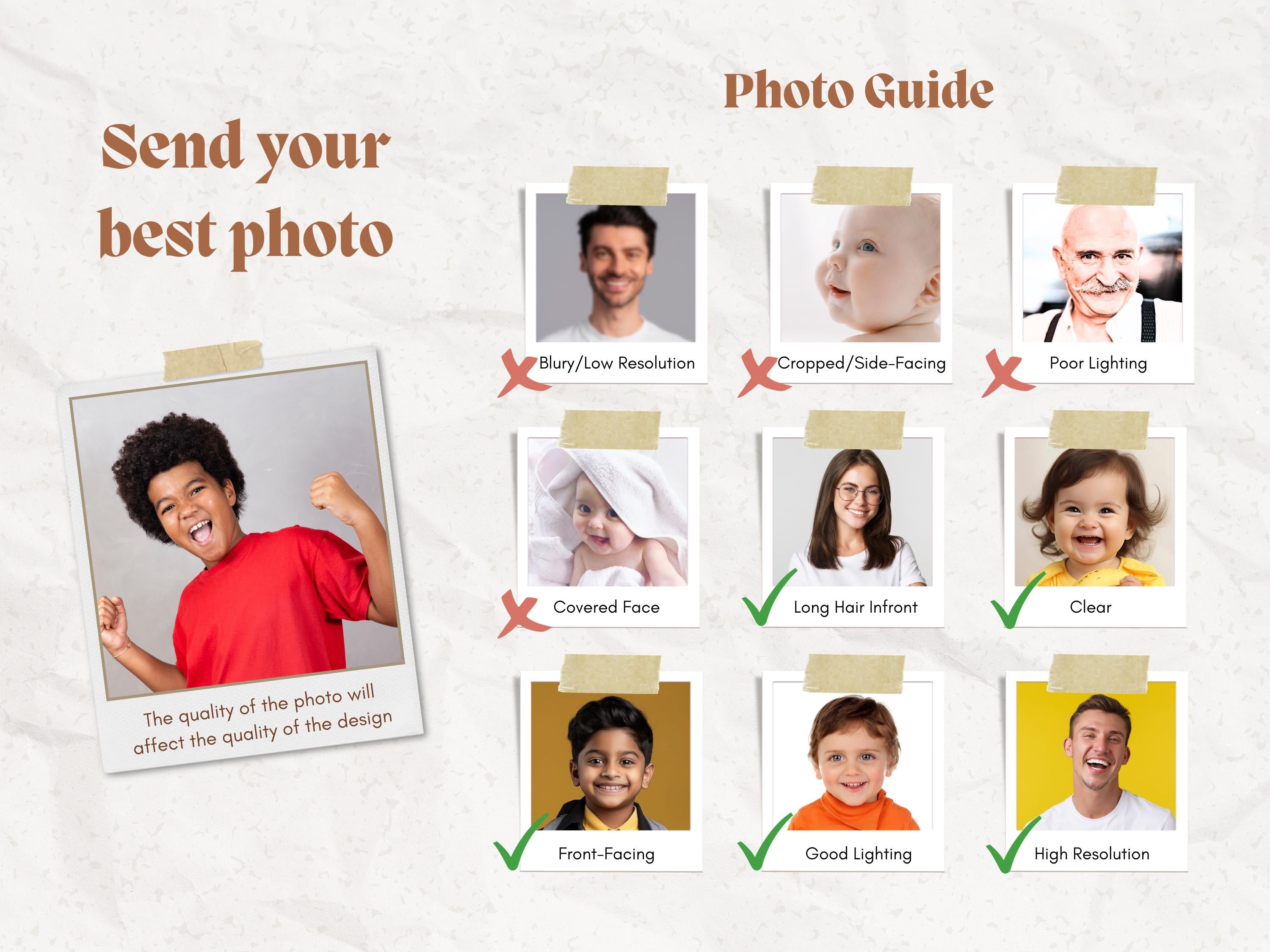 ⚠️ Photo quality directly impacts the final design. For best results, use clear, straight-facing, well-lit images.