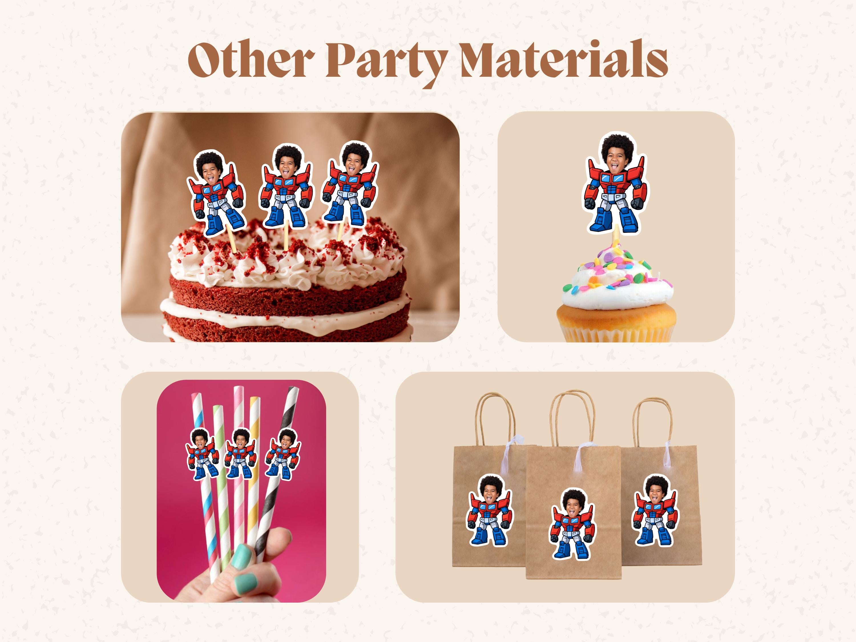 Make your little heros party unforgettable with these personalized Transformers cupcake toppers! Featuring bold Autobot designs, vibrant colors, and the option to add your child's face, these toppers bring the ultimate robot-themed birthday to life.