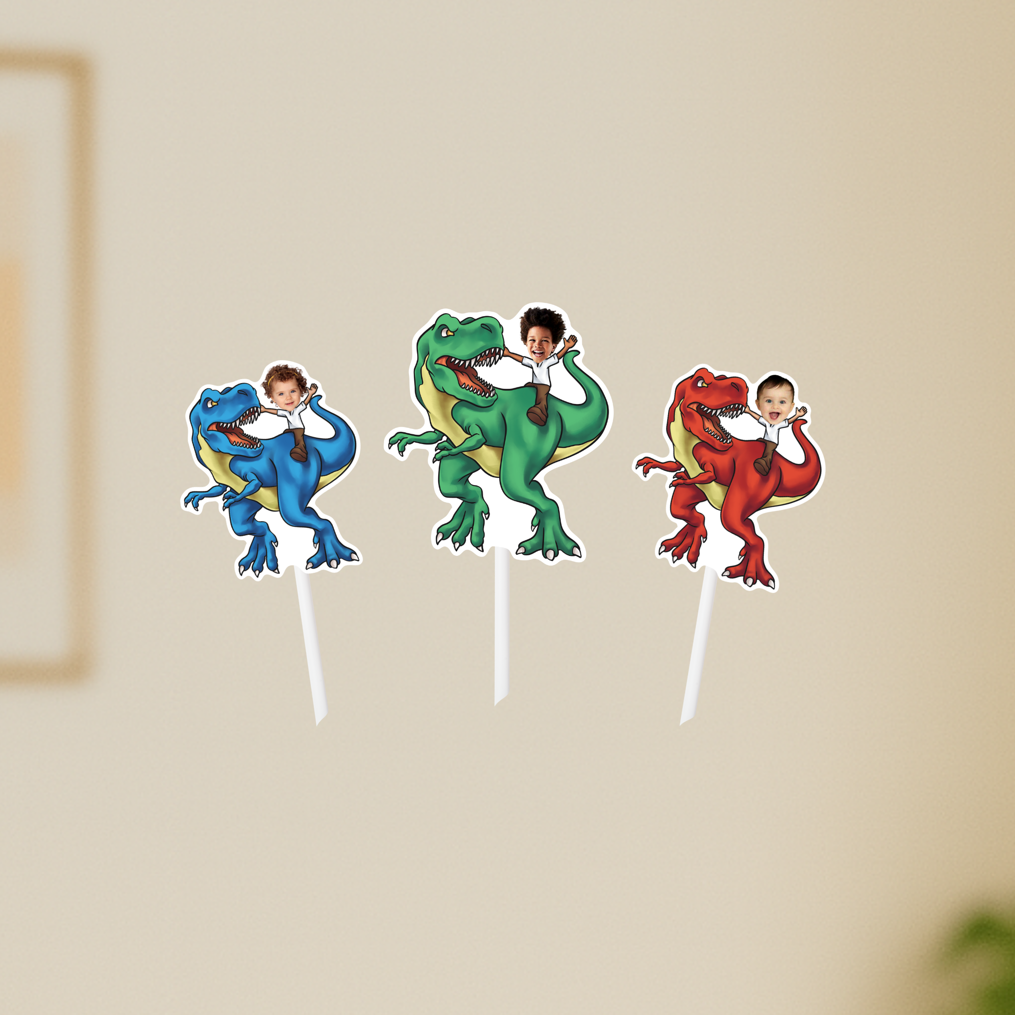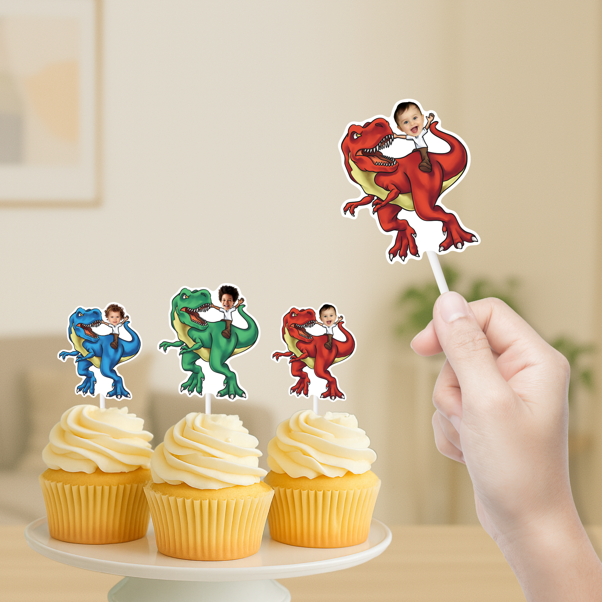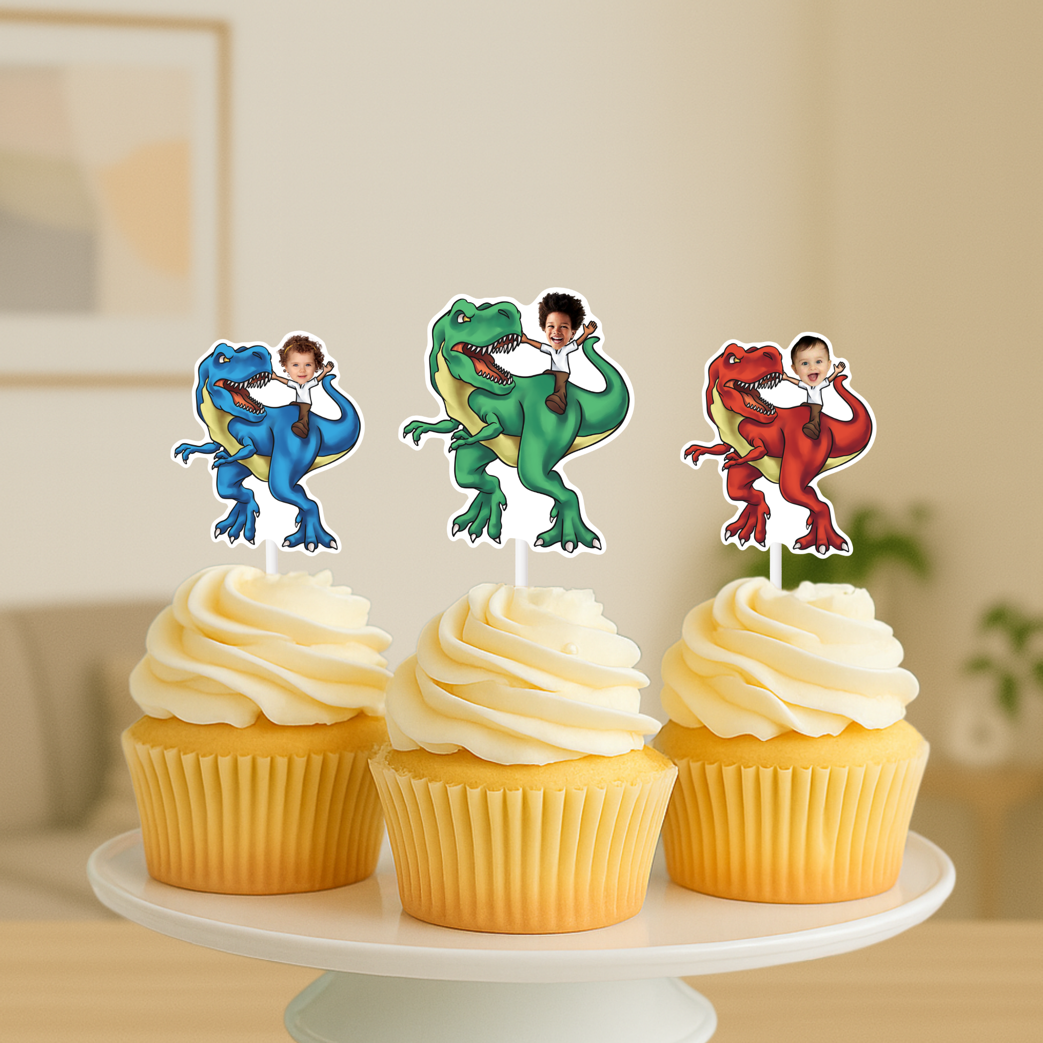 Get ready to roar into a prehistoric party with personalized Tyrannosaurus-themed cupcake toppers or stickers! Imagine the thrill of seeing your little one riding atop the mighty T-Rex, their face beaming with excitement! This design will turn cupcakes into Jurassic treats that'll have everyone roaring with delight.