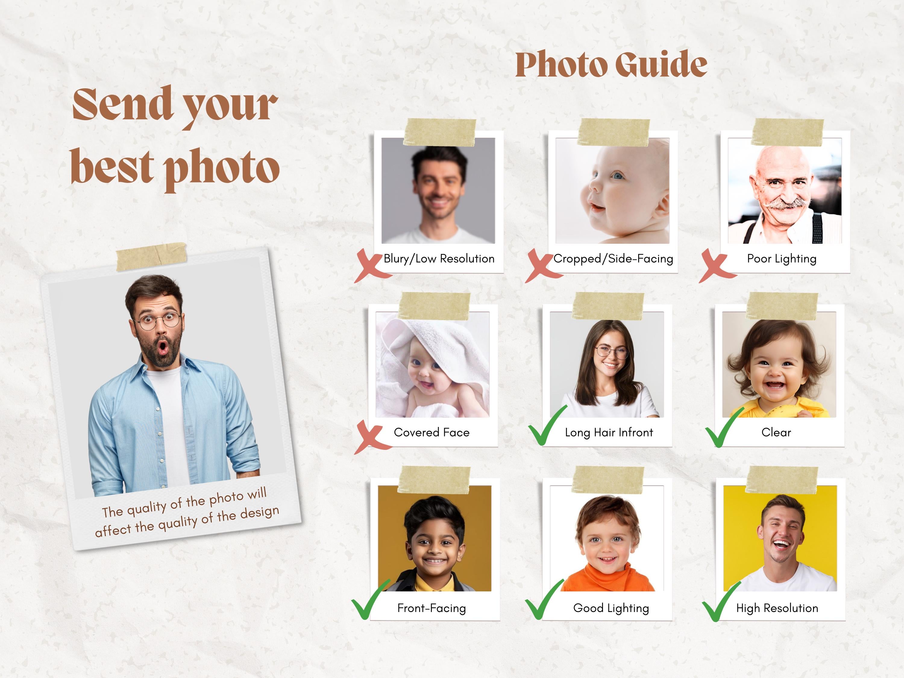 ⚠️ Photo quality directly impacts the final design. For best results, use clear, straight-facing, well-lit images.