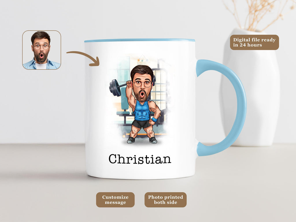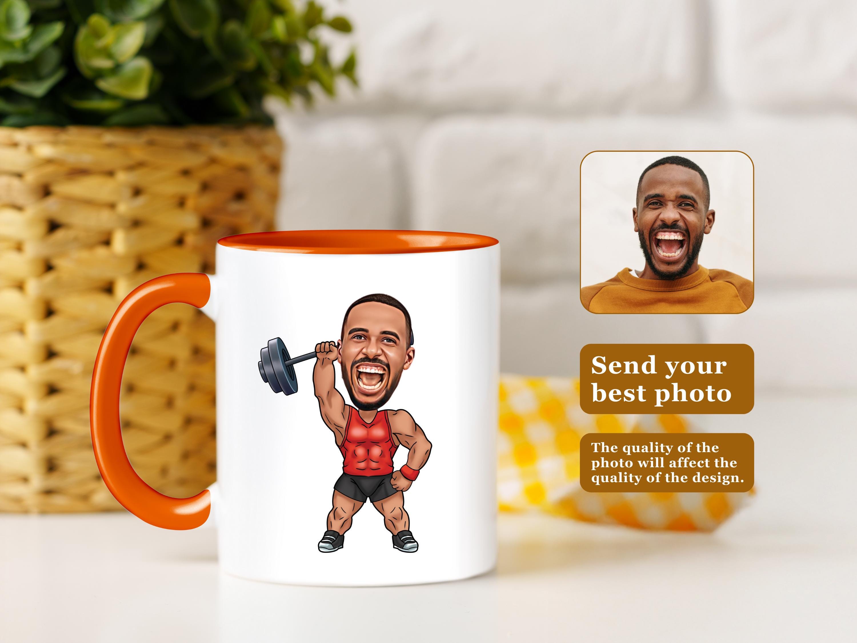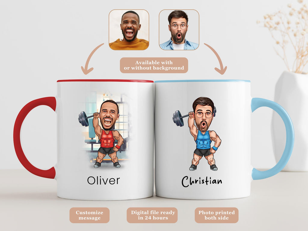 Transform your favorite bodybuilder into a powerful and fun cartoon character! This custom mug is perfect for fitness enthusiasts, gym lovers, and trainers, showcasing their dedication in a bold, energetic design.